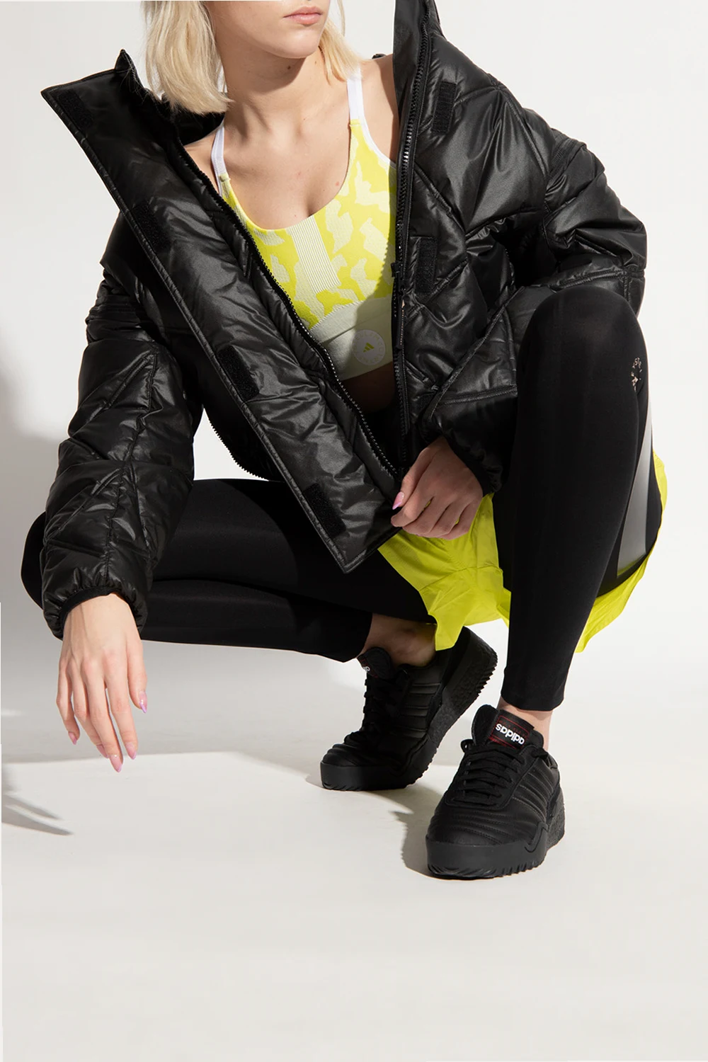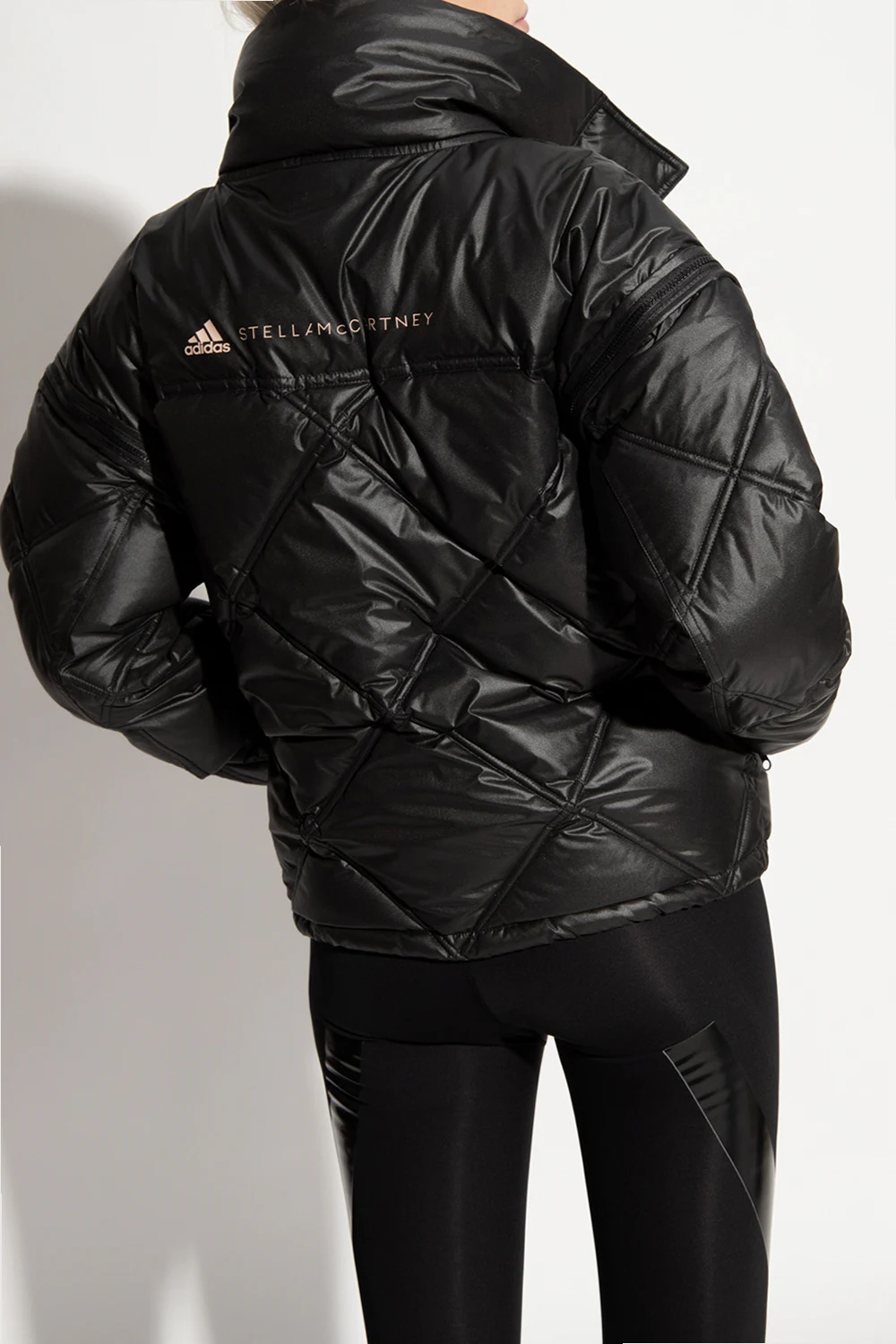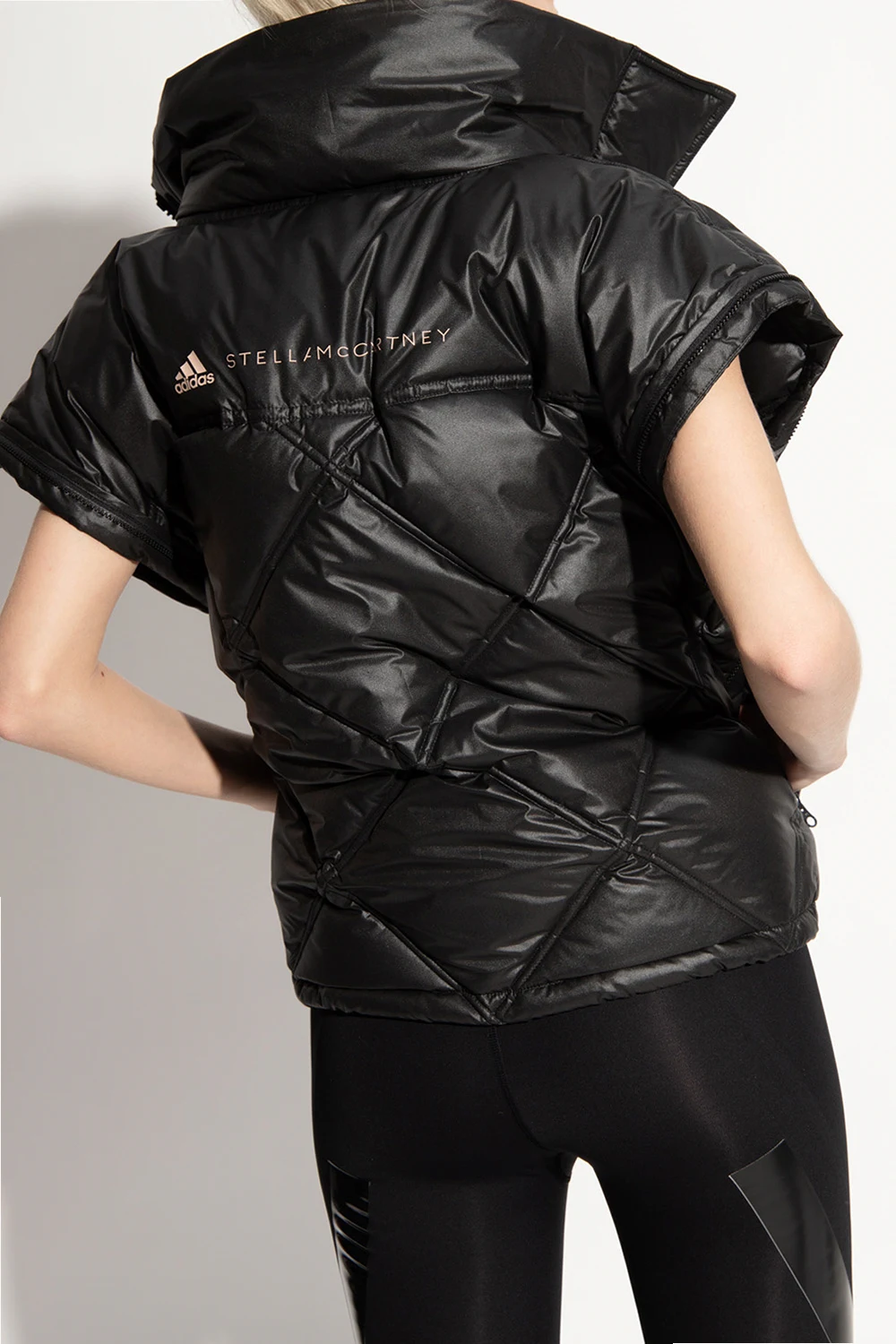 Czarna, pikowana kurtka ADIDAS by Stella McCartney. Wykonana z materiału pochodzącego z recyklingu. Zapinana na zamek oraz rzepy. Na rękawie nadrukowane logo. Dwie kieszenie zapinane na zamki. Odpinane rękawy. Chowany kaptur ściągany trokami.