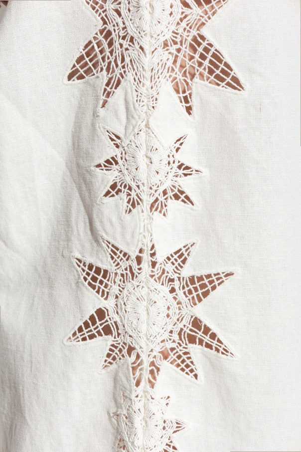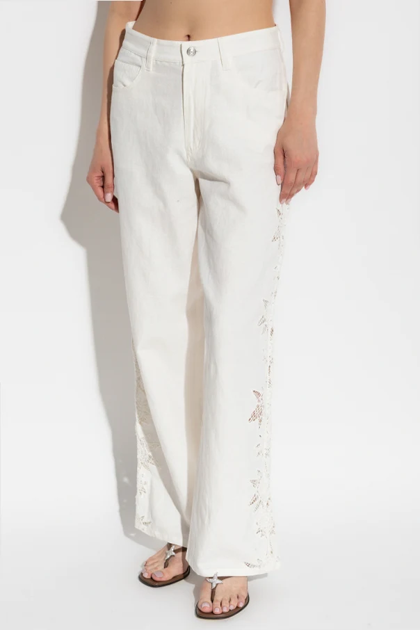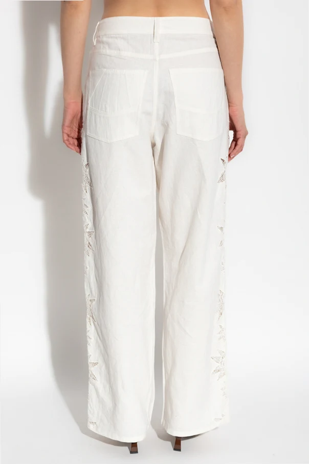 Wykonane z wysokogatunkowej, białej tkaniny o widocznej strukturze włókien, harmonijnie łączą właściwości lnu oraz bawełny, zapewniając przewiewność i naturalną elegancję. Ich prawdziwym wyróżnikiem są ażurowe, koronkowe wstawki w formie gwiazd , precyzyjnie rozmieszczone wzdłuż bocznych szwów każdej nogawki, co subtelnie eksponuje delikatność oraz unikatowy charakter wyrobu.