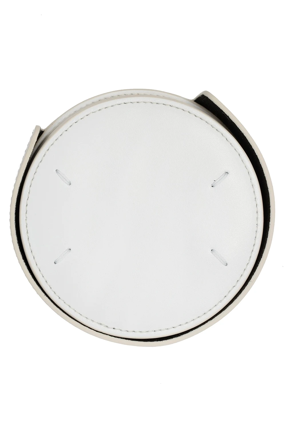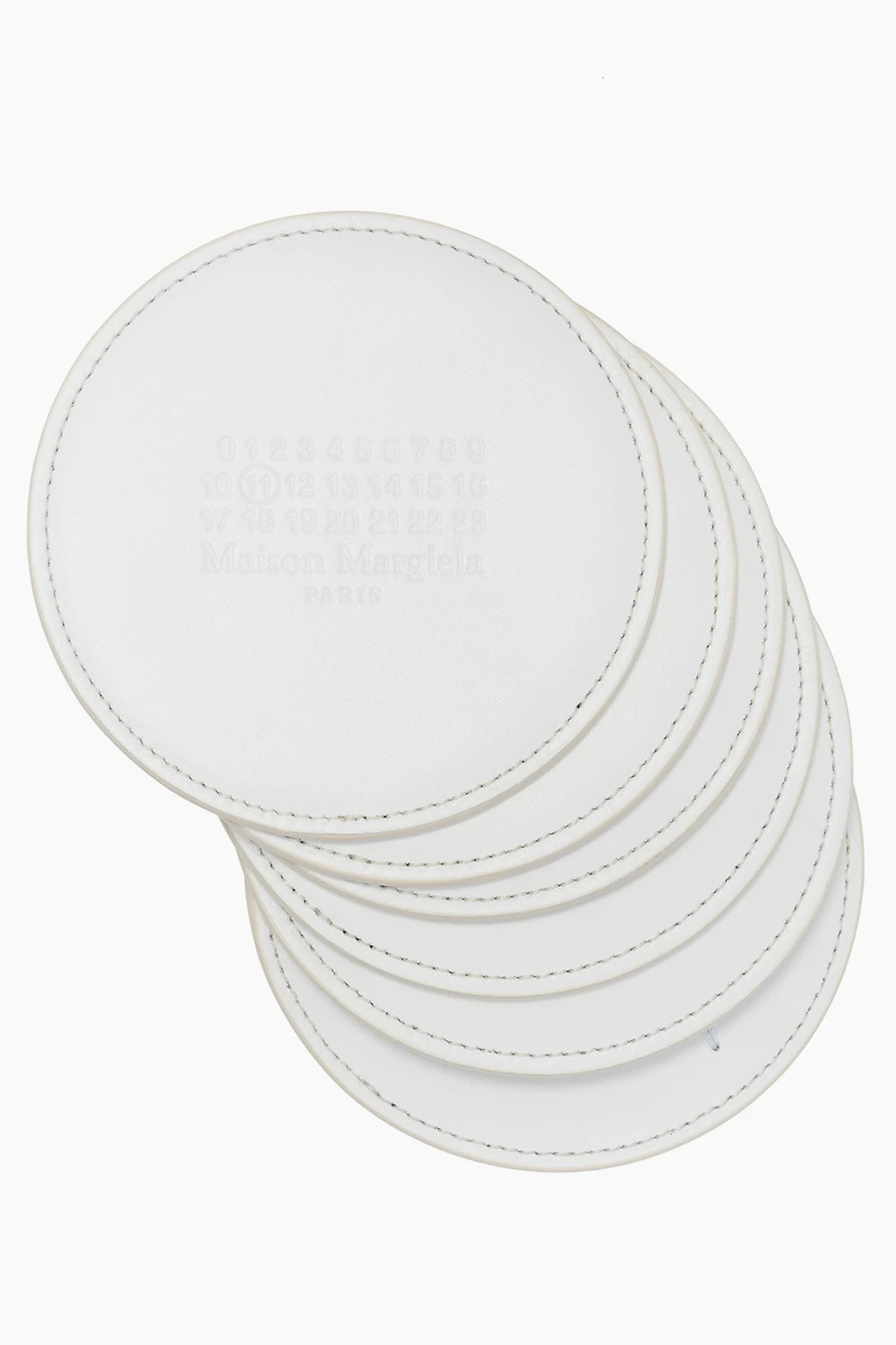 Zestaw sześciu, białych podstawek Maison Margiela. Wykonane ze skóry krowiej. Ozdobione białymi przeszyciami oraz wytłoczonym logo. Dołączone etui.