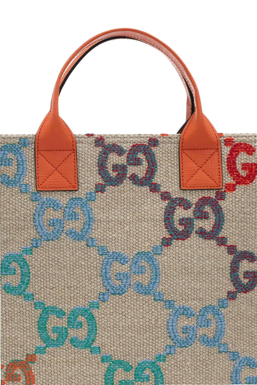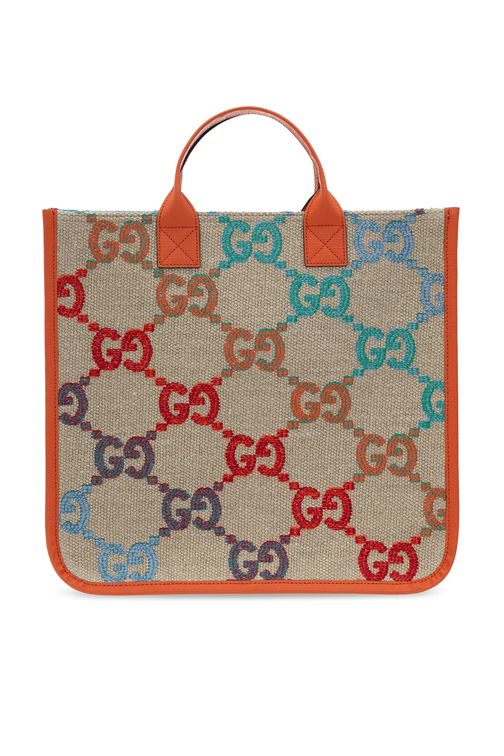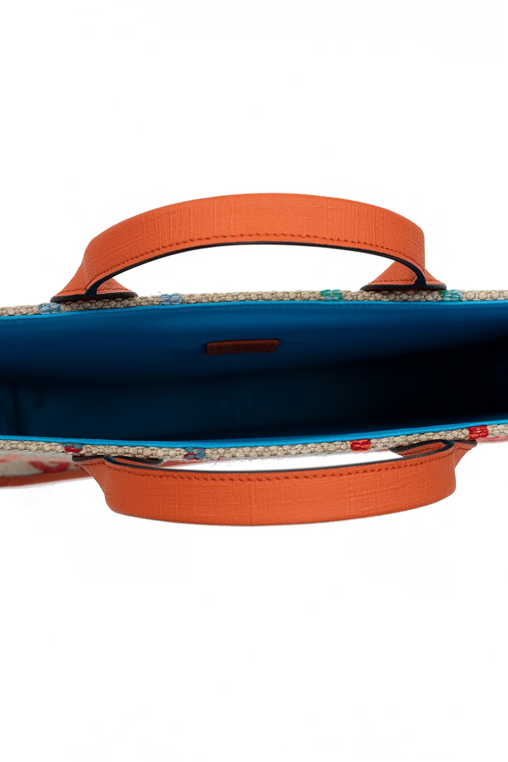 Beżowa torba do ręki Gucci Kids. Wykonana z płótna. Ozdobiona wyszytym, kolorowym wzorem z logo. Dwie półokrągłe rączki. Wykończona pomarańczową lamówką.