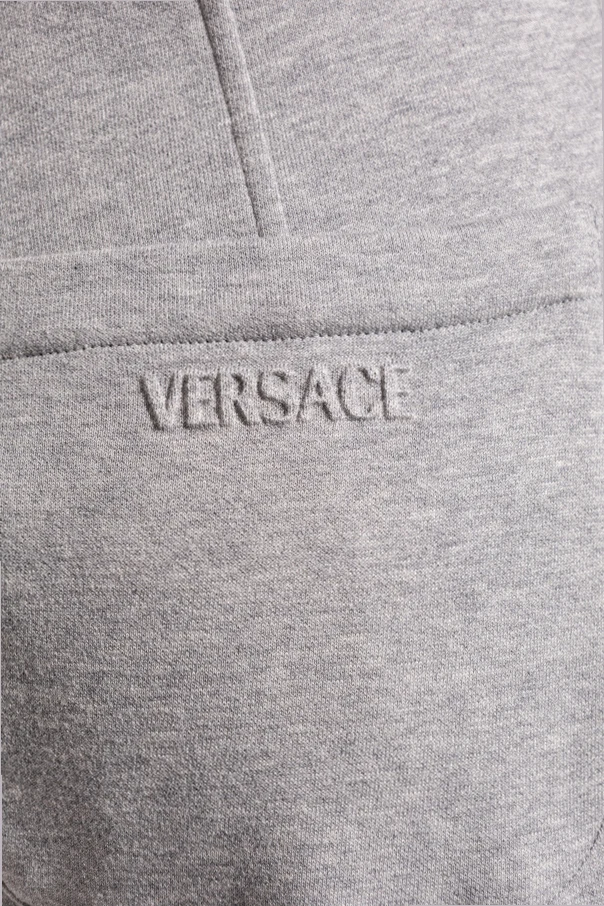Swobodny krój oraz lekko wydłużone, proste nogawki zapewniają swobodę ruchów i pełen komfort. W talii zastosowano praktyczny ściągacz ze sznurkiem, ozdobionym metalowymi końcówkami. Dwie boczne kieszenie oraz dwie naszywane z tyłu gwarantują funkcjonalność, a dyskretnie wypukłe, ton w ton haftowane logo VERSACE na tylnej kieszeni wskazuje na prestiżowy rodowód i troskę o detale.