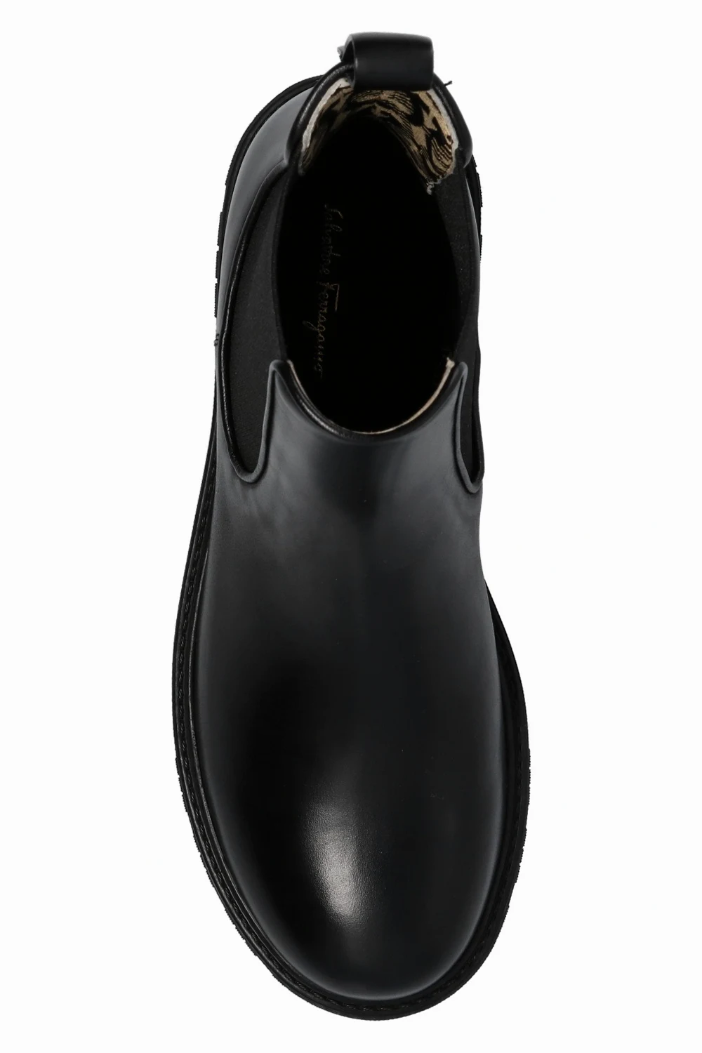 Czarne botki, model 'Varsi' Salvatore Ferragamo. Wykonane z cielęcej skóry. Po bokach wstawki z elastycznego materiału. Czarna, gumowa podeszwa z wytłoczonym logo.
