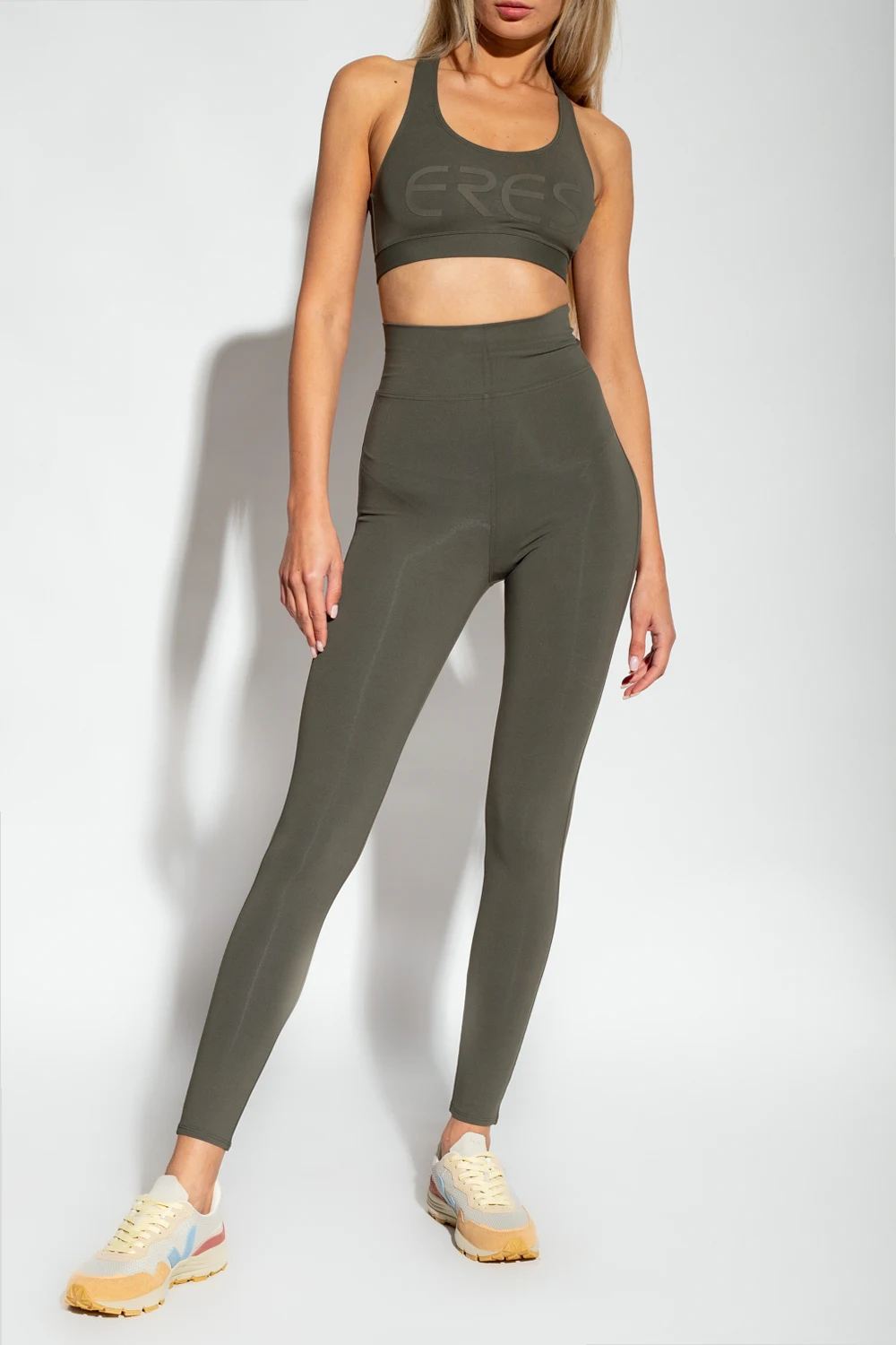 Ciemnozielony top treningowy na ramiączka, model ‘Sporty’ Eres. Z przodu wypukłe logo. Dół wykończony ściągaczem.