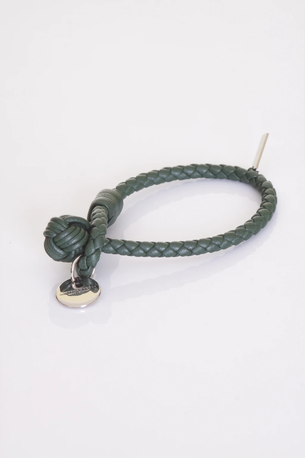 Pojedyncza, bransoletka Bottega Veneta wykonana z owczej skóry, w ciemnozielonym kolorze, zapinana za pomocą pętelki z węzłem. Dołączona zawieszka z mosiądzu.