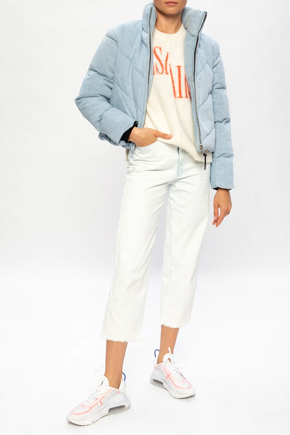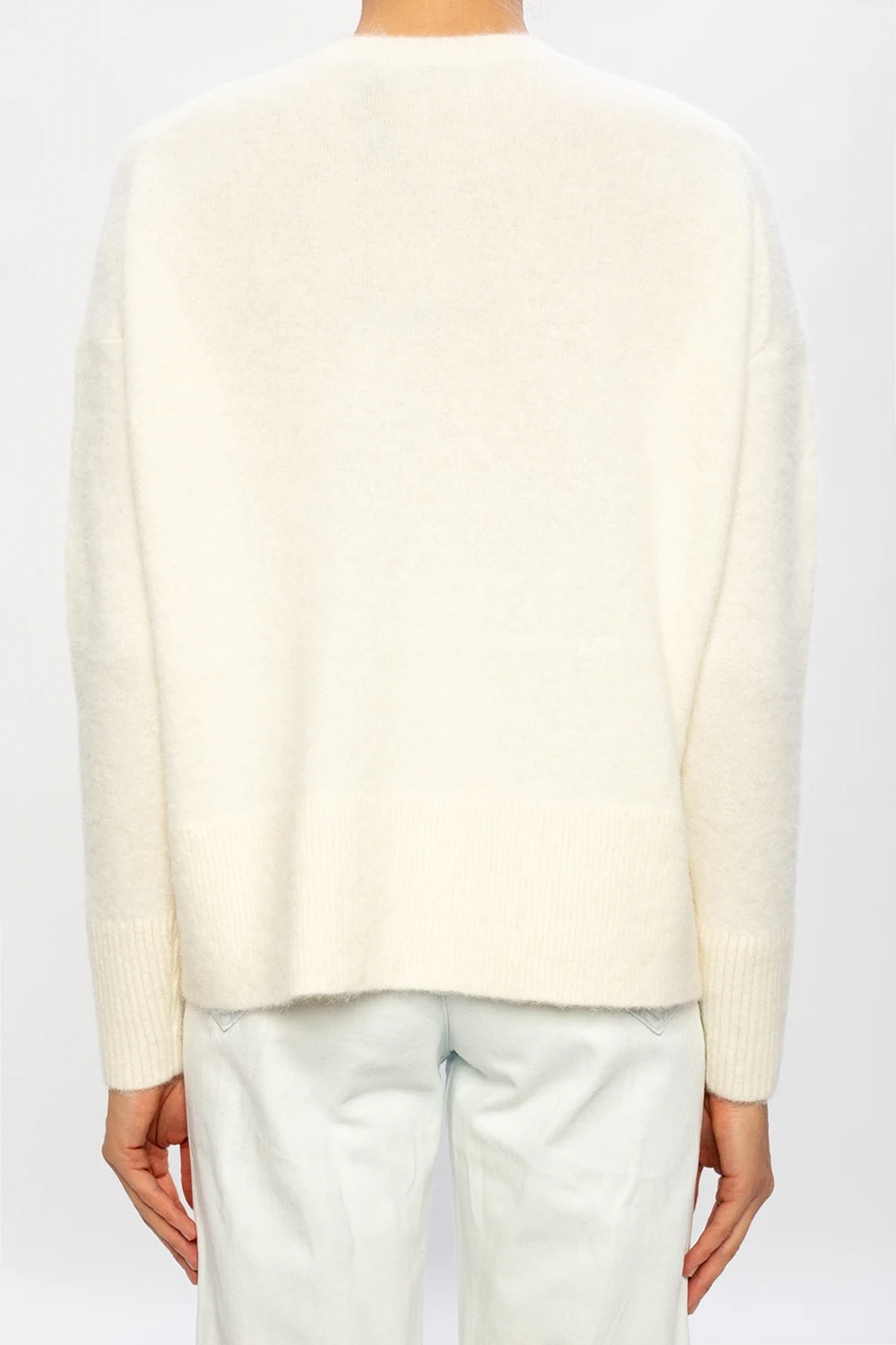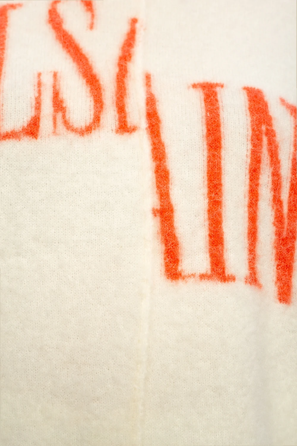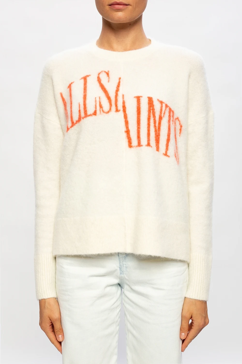 Kremowy sweter, model 'Split' AllSaints. Wykończony wełną. Ozdobiony wyszytym logo w kolorze pomarańczowym. Okrągły dekolt. Dół oraz rękawy zakończone ściągaczami.