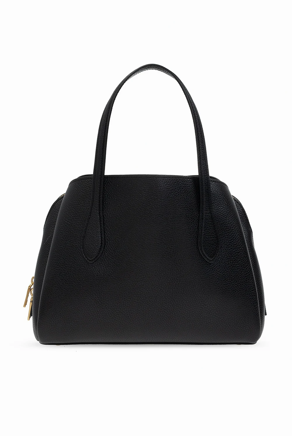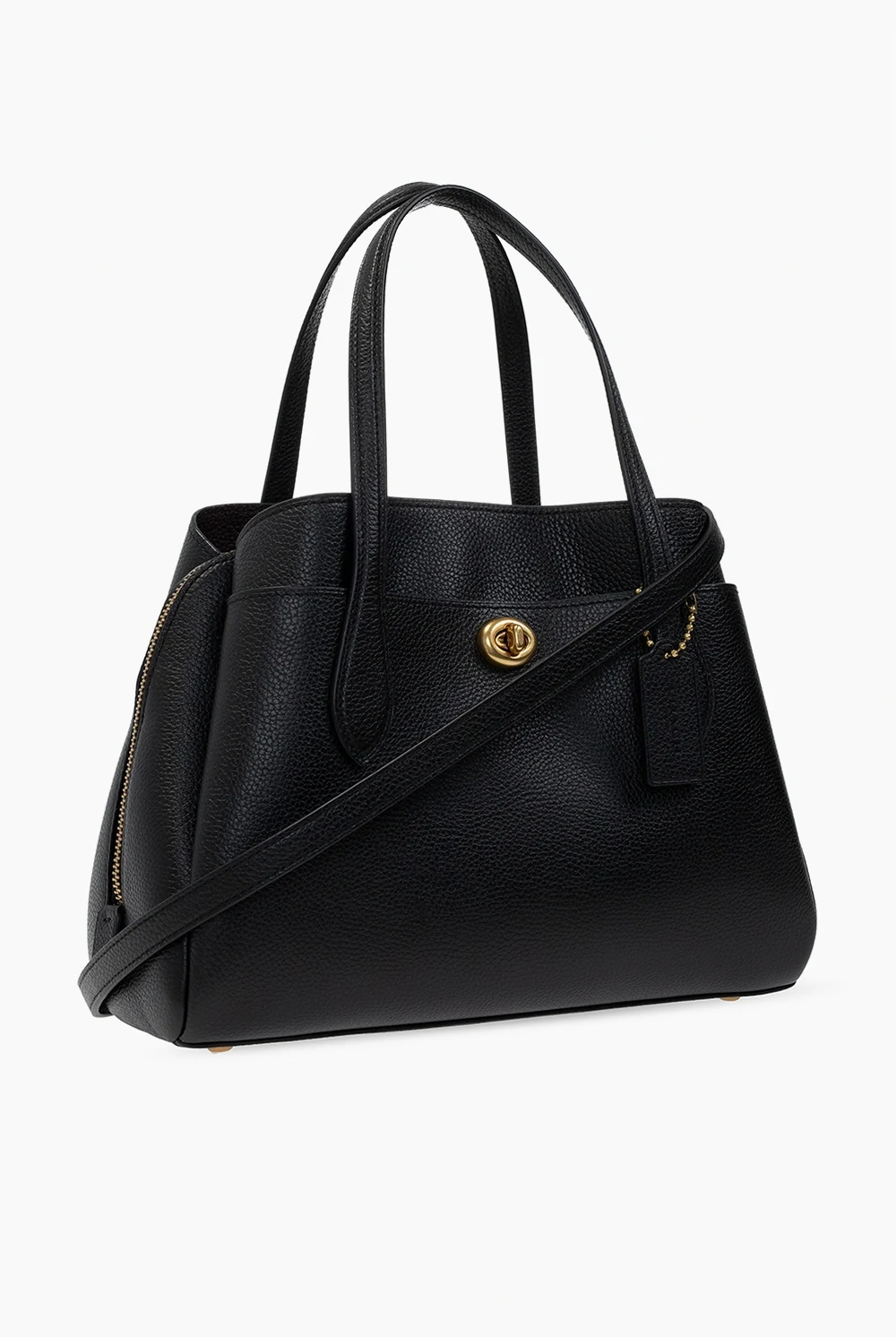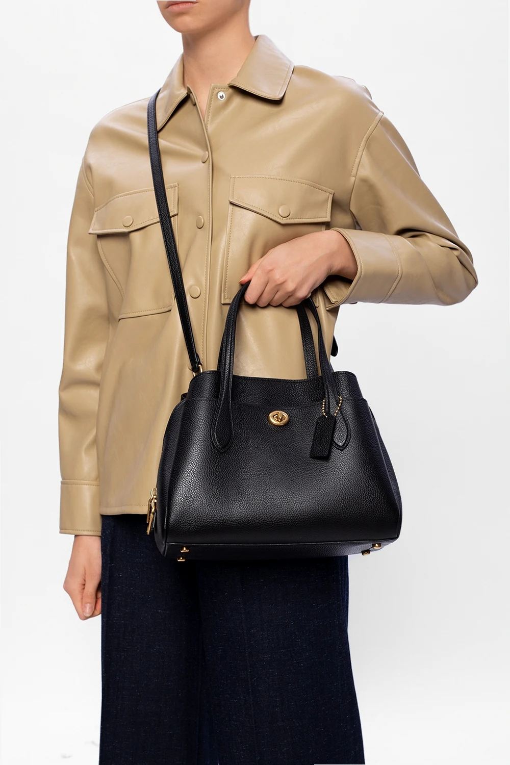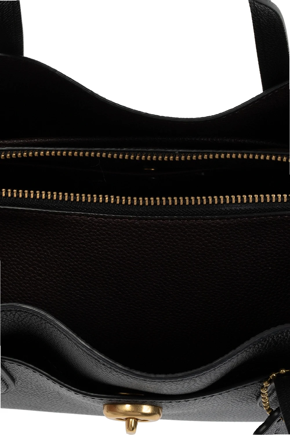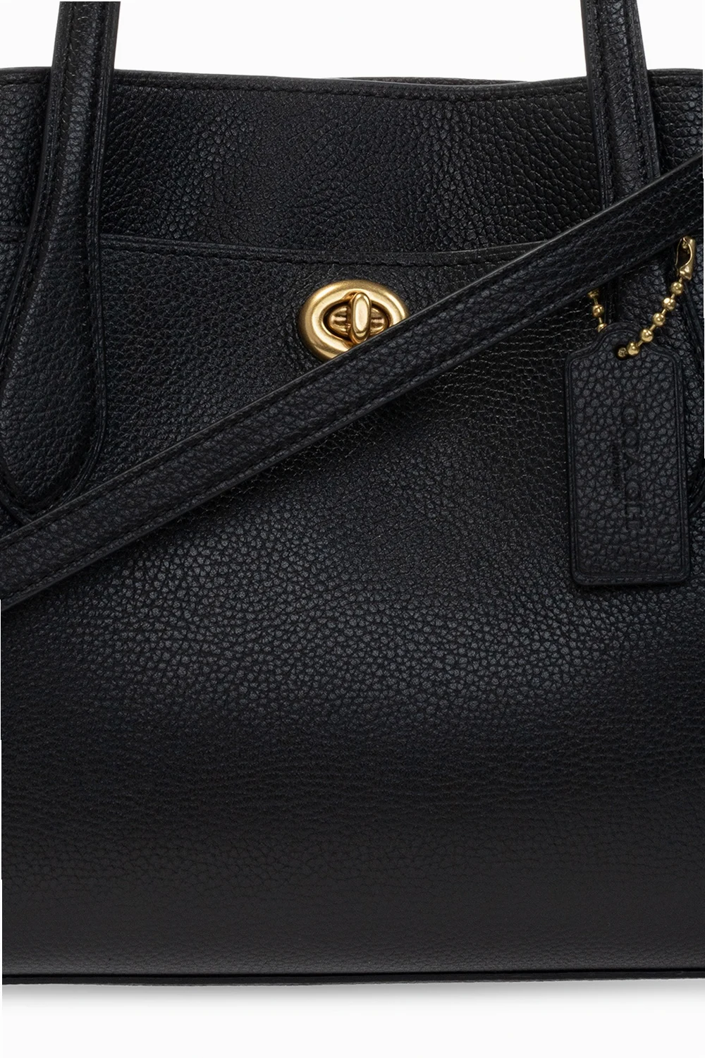 Czarno-fioletowa torba na ramię, model 'Lora' Coach. Wykonana ze skóry o ziarnistej fakturze. Z przodu kieszeń zamykana na dekoracyjne zapięcie. Dwie półokrągłe rączki oraz odpinany pasek na ramię z możliwością regulacji długości. Warstwa wewnętrzna w kolorze fioletowym. Wewnątrz trzy oddzielne komory – jedna zamykana na dwubiegunowy zamek z kieszenią zamykaną na zatrzask. Metalowe elementy w kolorze złotym.