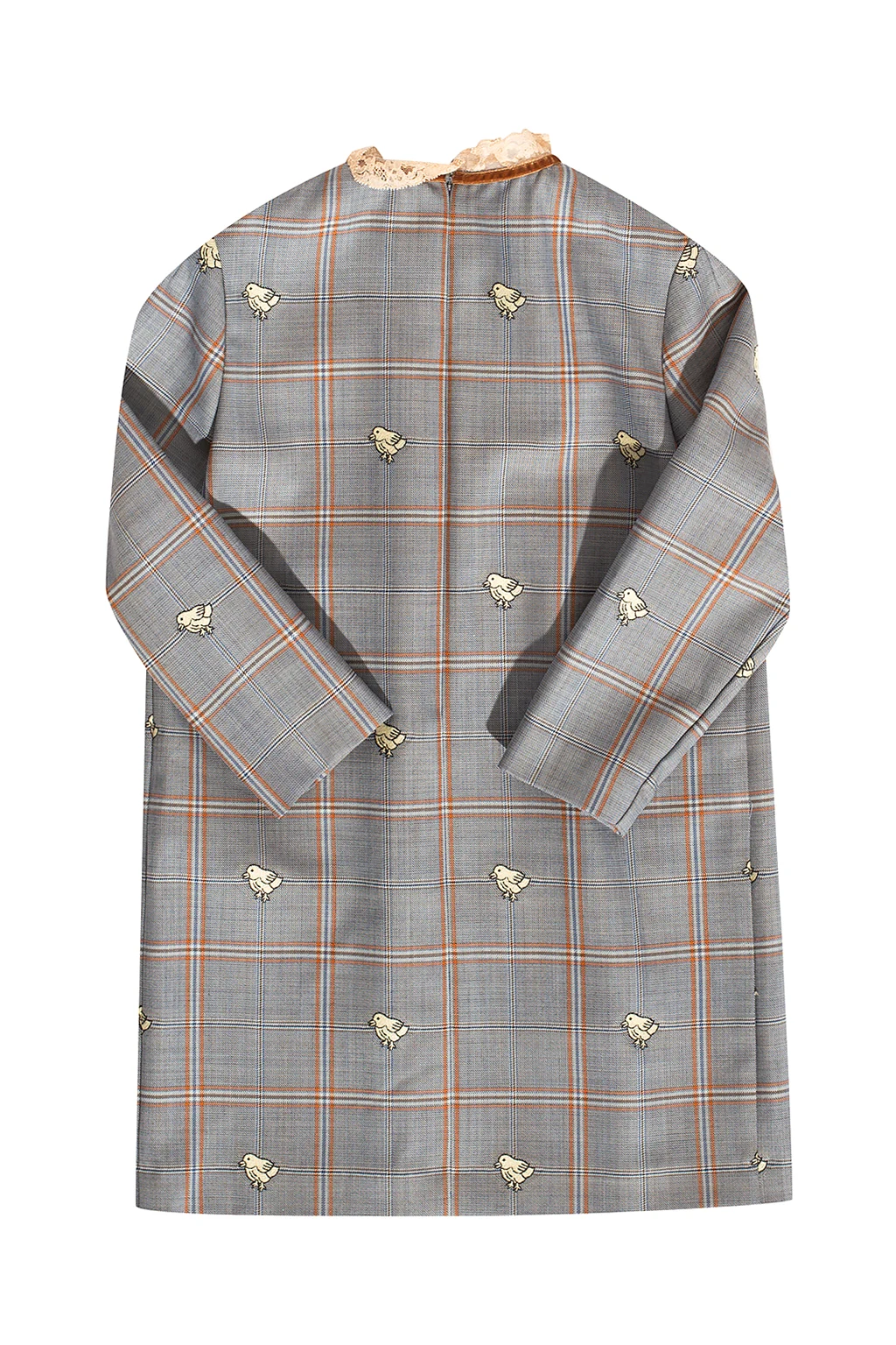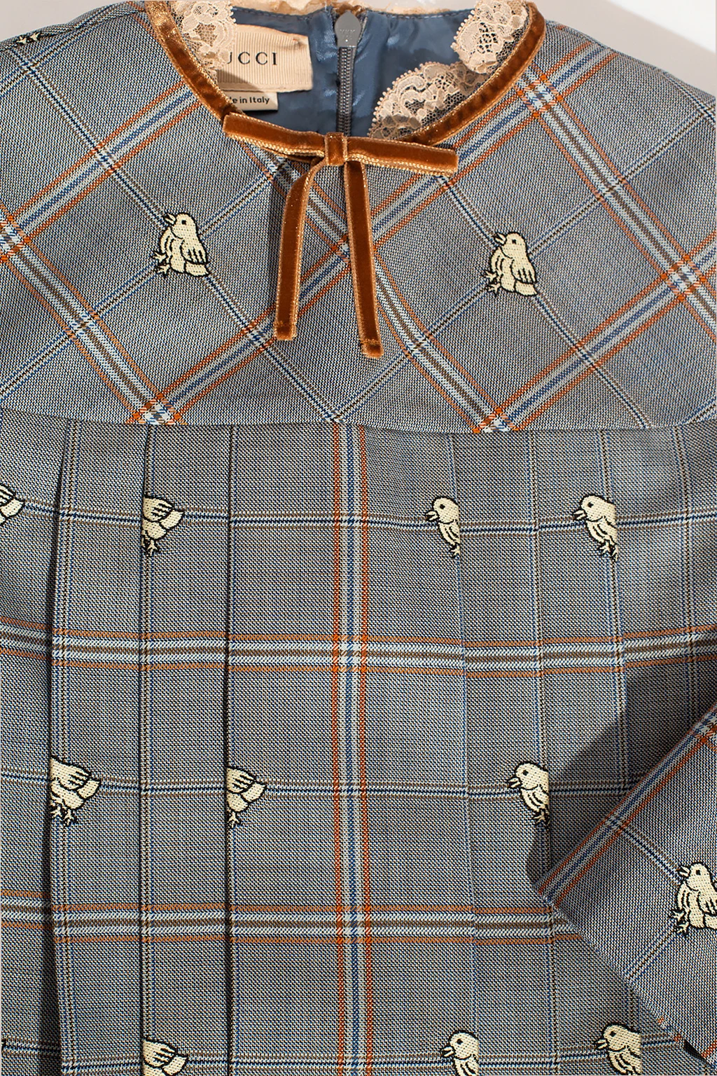 Szara, wełniana sukienka Gucci Kids. Zapinana z tyłu na zamek. Ozdobiona wzorem w brązowo-niebieską kratę oraz wyszytym wzorem. Okrągły dekolt z aksamitnym wykończeniem i beżową koronką. Długie rękawy.