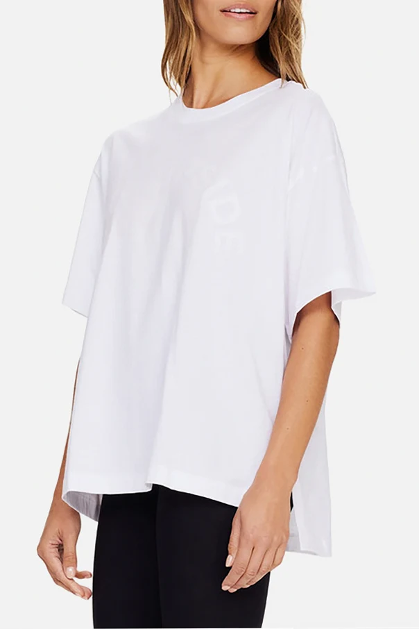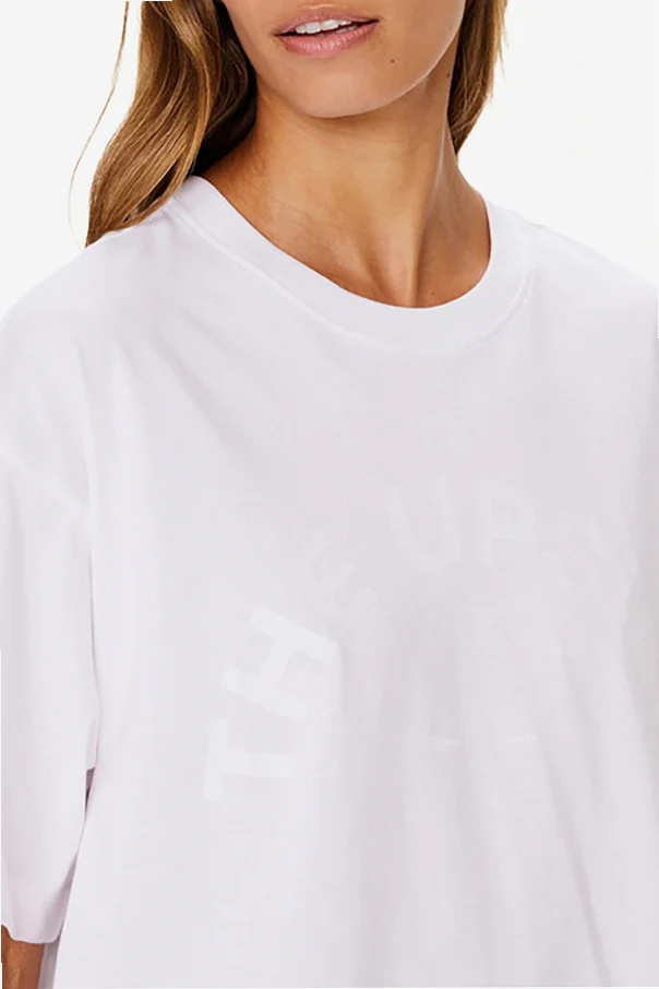 Uwagę przyciąga minimalistyczny, gładki front, na którym widoczny jest subtelny, tonalny napis „THE UPSIDE” , tworzący harmonijny łuk. Nadruk, niemal niewidoczny, wtapia się w śnieżnobiałą powierzchnię, eksponując luksus poprzez dyskretny akcent.