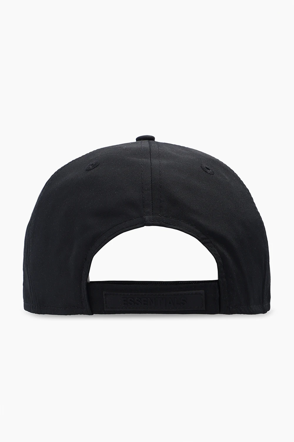 Czarna czapka z daszkiem Fear Of God Essentials x New Era. Ozdobiona nadrukowanym wzorem w kolorze kremowym oraz wyszytym logo. Z tyłu zapięcie na rzep.