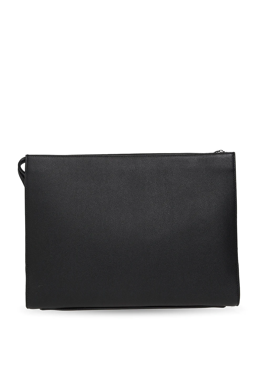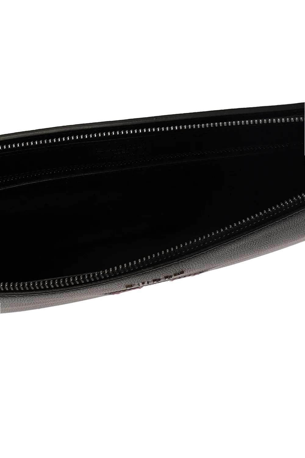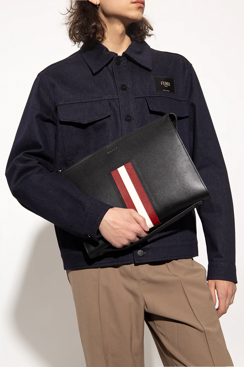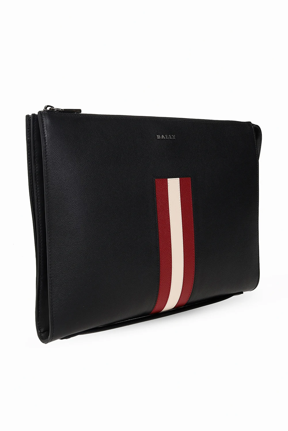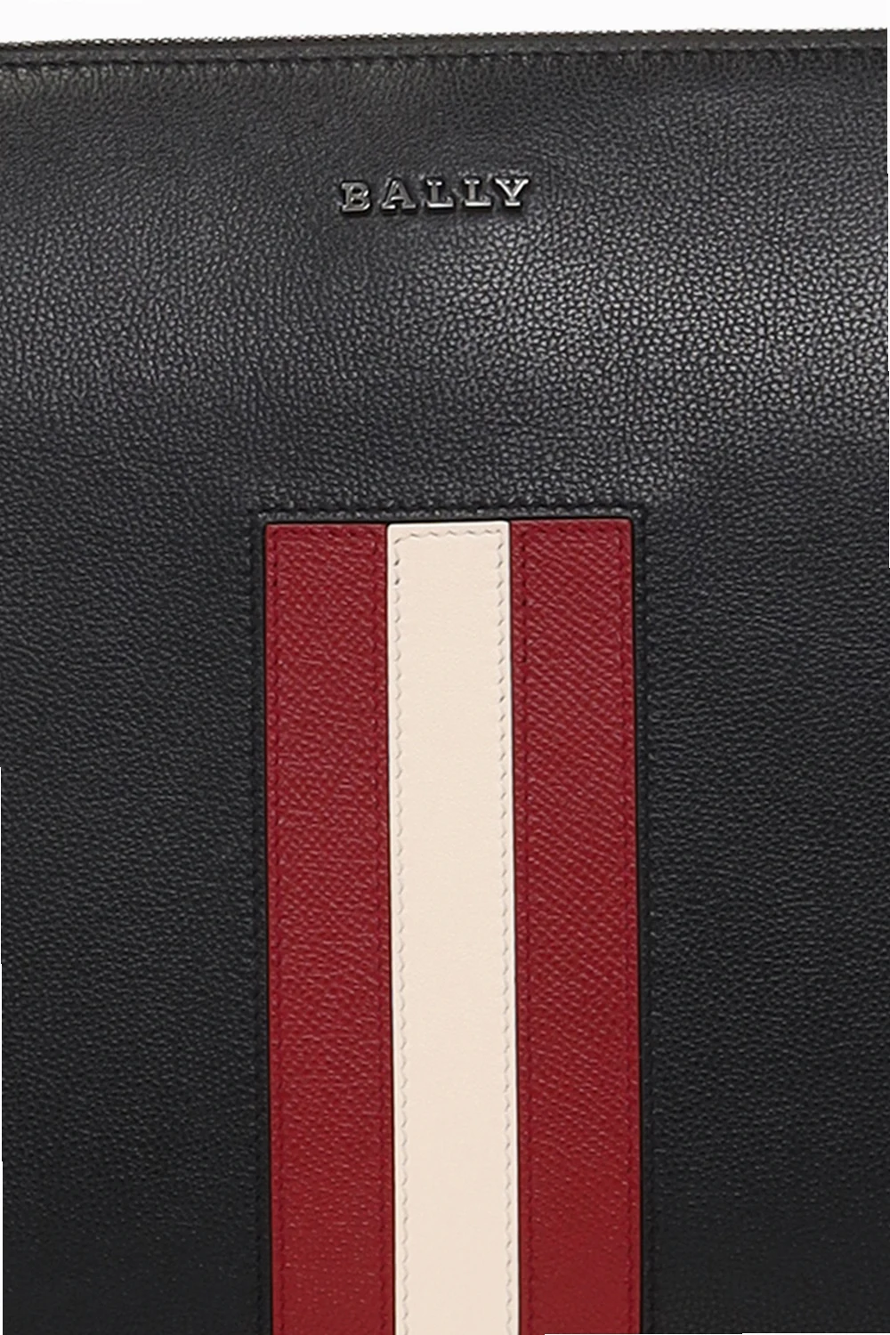 Czarna aktówka, model ‘Enzon’ Bally. Wykonana ze skóry bydlęcej. Zamykana na zamek. Z przodu ozdobiona metalową aplikacją z logo oraz charakterystycznymi dla marki paskami w kolorze czerwono-kremowym. Z tyłu komora na magnetyczne zatrzaski z dwiema przegrodami. Na dnie uchwyt. Wewnątrz komora z czterema kieszeniami: trzema wsuwanymi, w tym jedną bardzo wąską oraz zamykaną na zamek. Dodatkowo dwa miejsca na karty. Metalowe wykończenie w kolorze srebrnym.