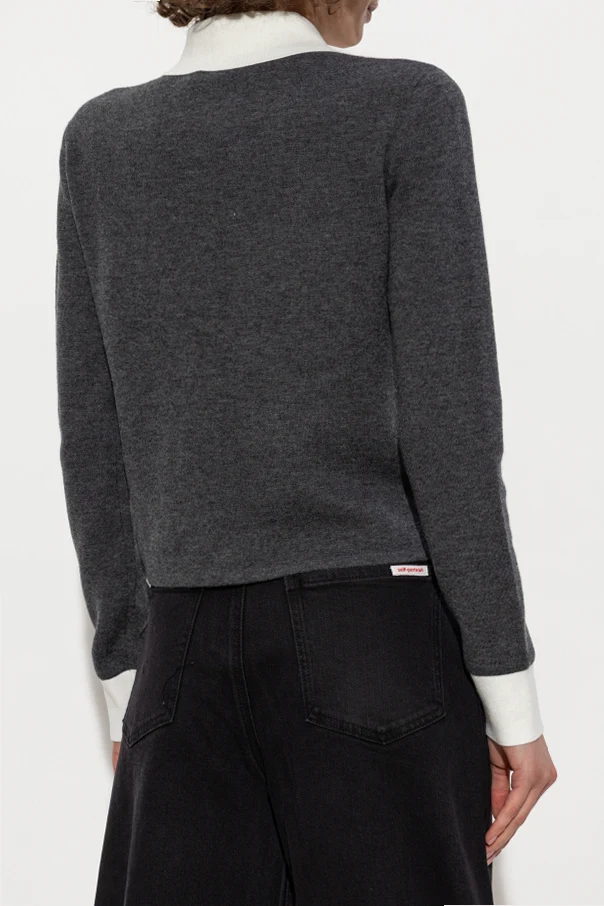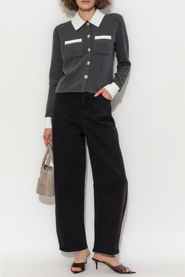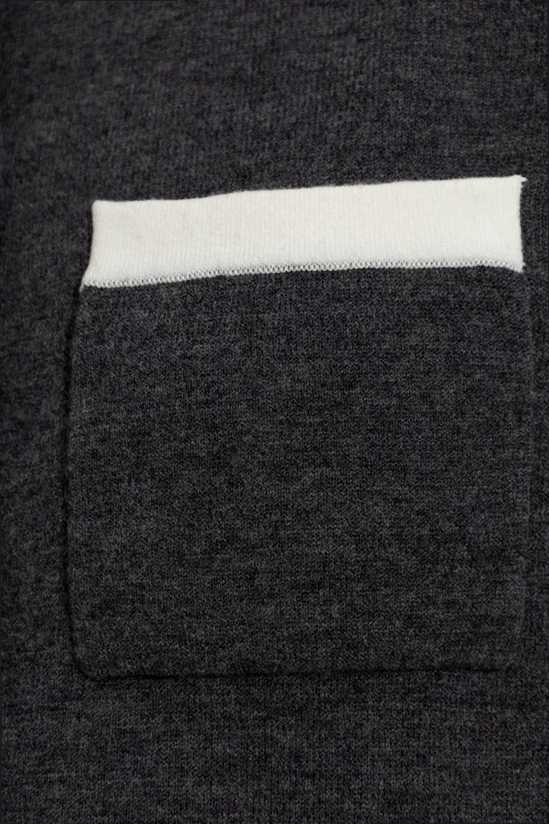 Cechą charakterystyczną kardiganu są kontrastowe, białe detale: elegancki kołnierz, mankiety oraz wykończenie dwóch kieszeni na piersi. Przednią część zdobią sześć ozdobnych guzików, które subtelnie lśnią złotym lub perłowym blaskiem. Dbałość o szczegóły potwierdza również obecność minimalistycznej metki projektanta przy dolnej krawędzi z tyłu.