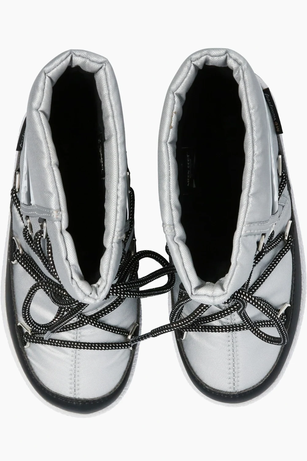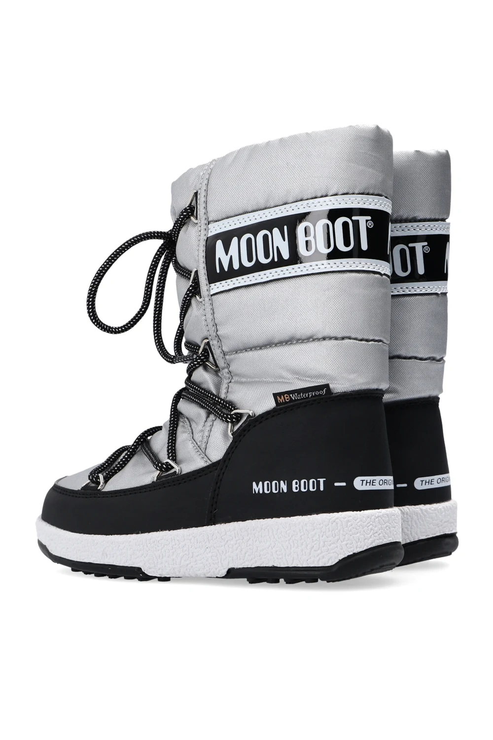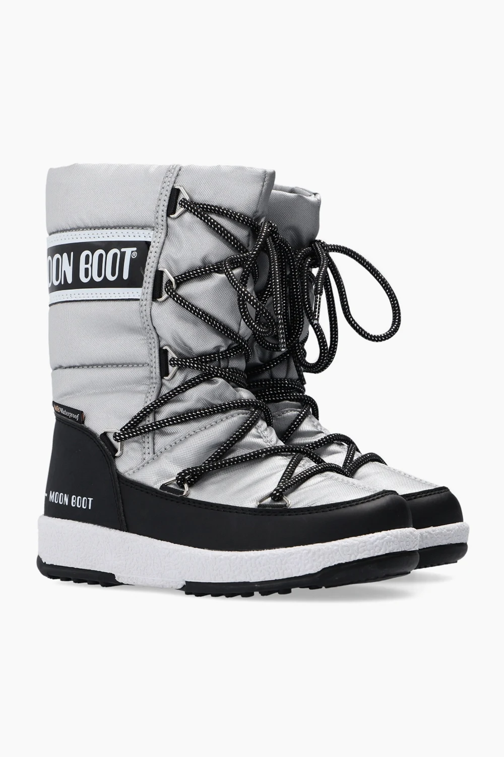 Sznurowane, wodoodporne śniegowce w kolorze srebrnym, model ‘JR Girl Quilted WP’ Moon Boot Kids. Ozdobione naszywką z logo w kolorze biało-czarnym. Czarna, gumowa podeszwa.