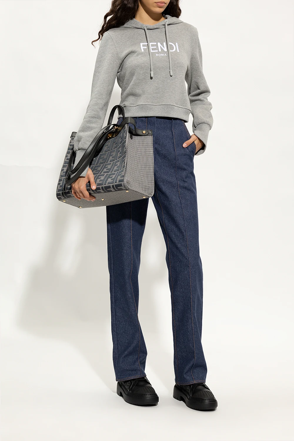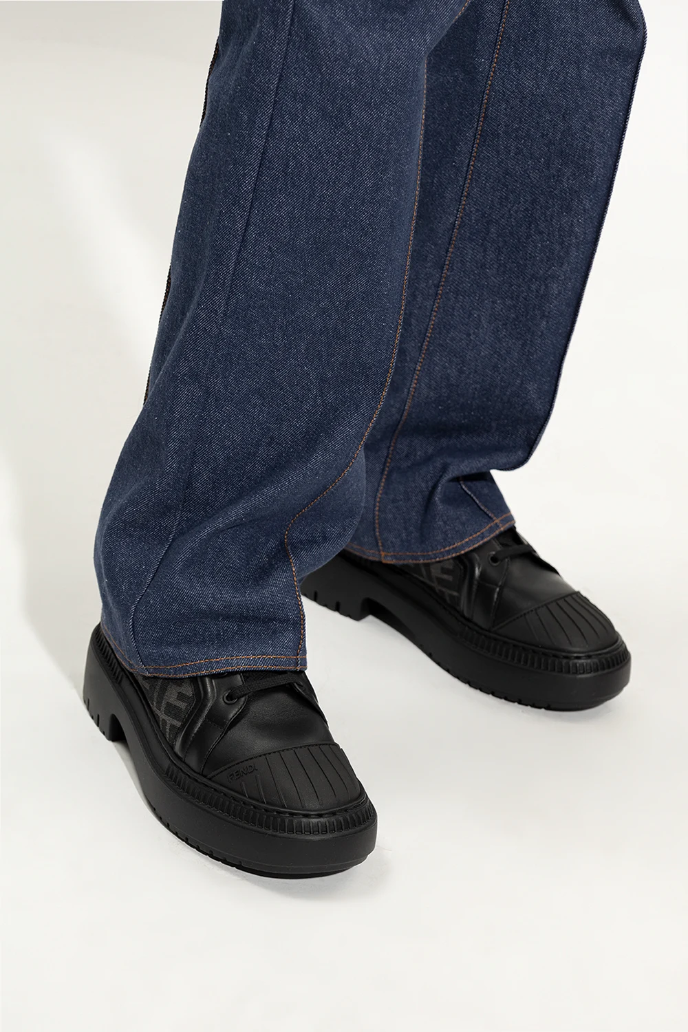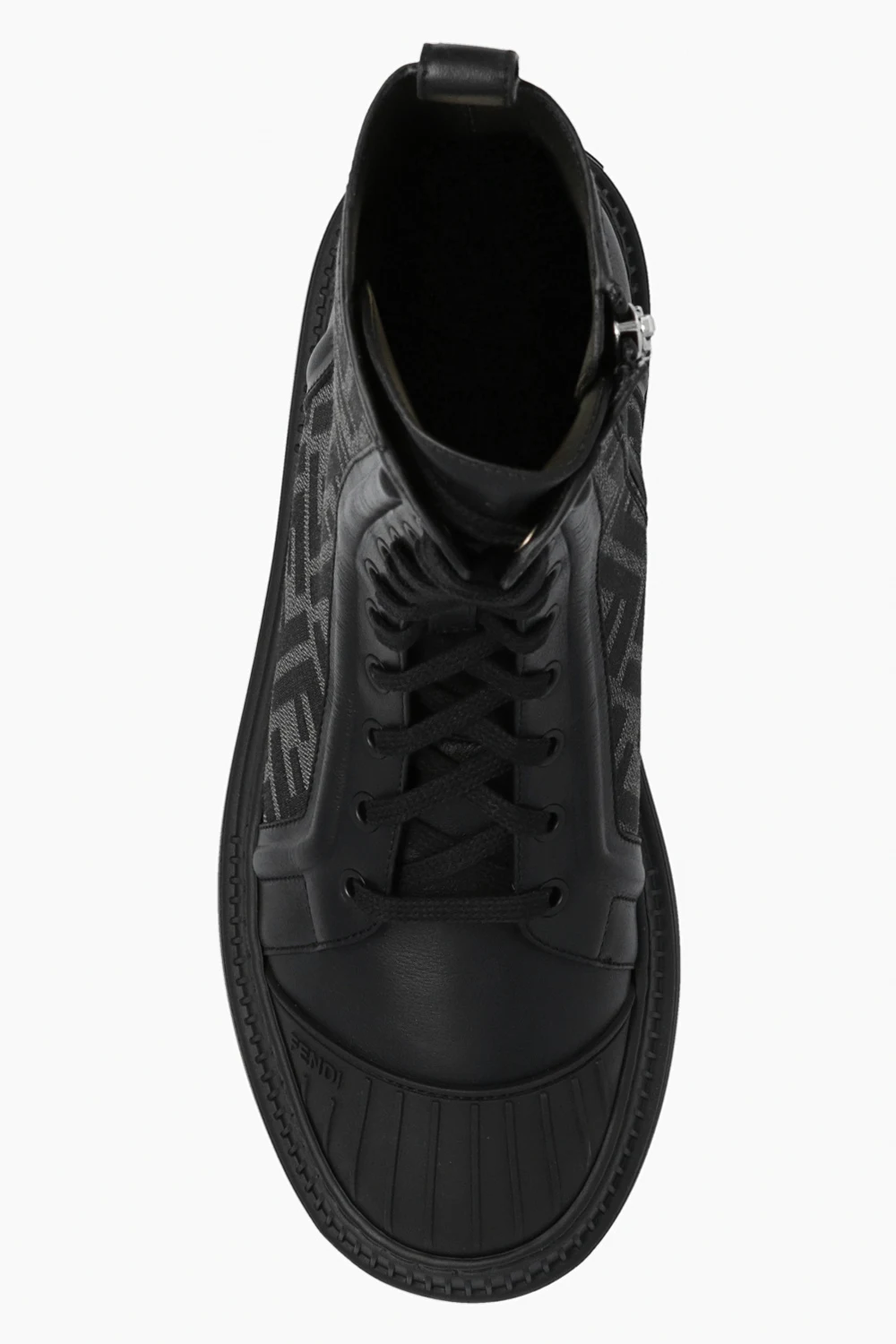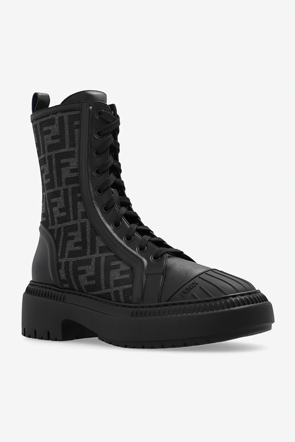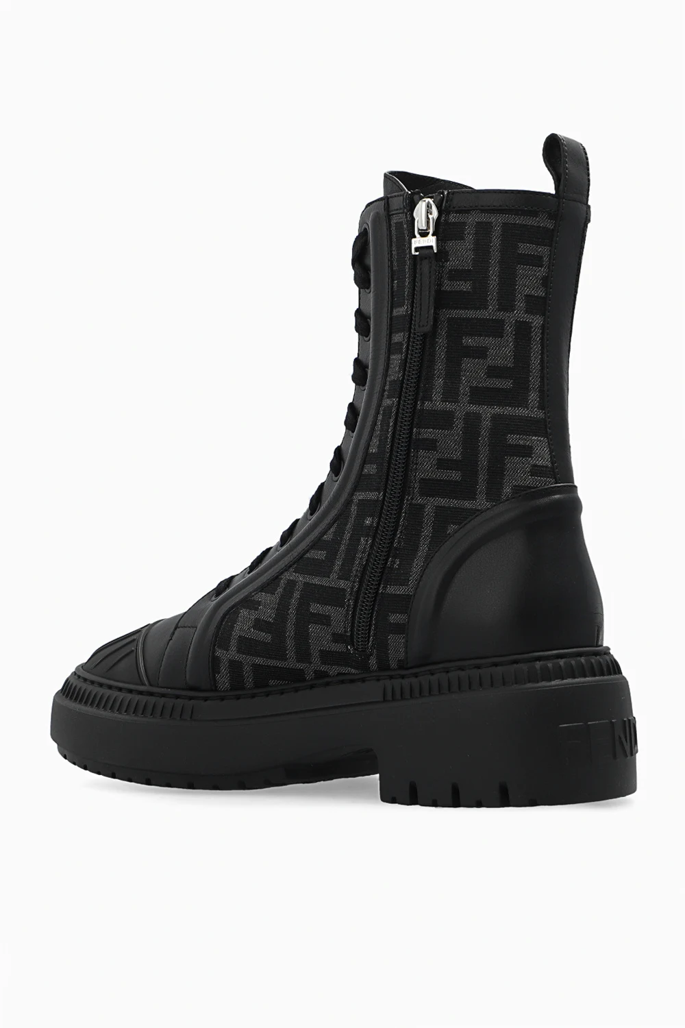 Czarno-szare, sznurowane botki, model ‘Domino’ Fendi. Wykonane z cielęcej skóry. Wykończone płótnem z monogramem. Z boku zapinane na zamek. Czarna, gumowa podeszwa.