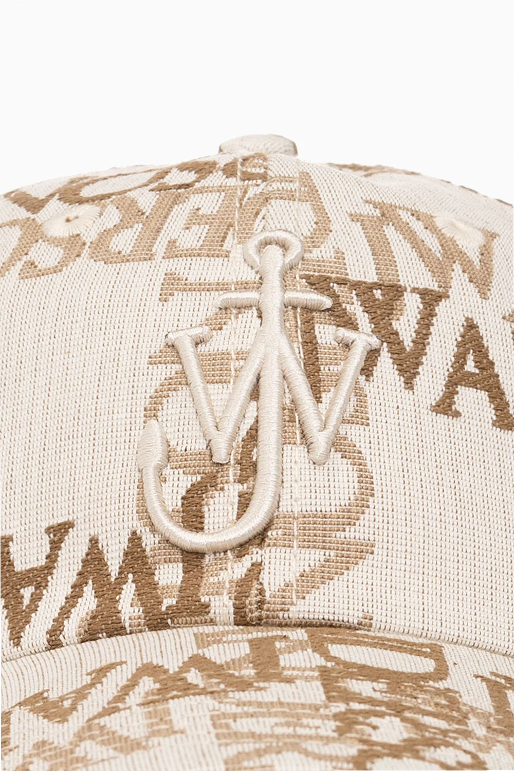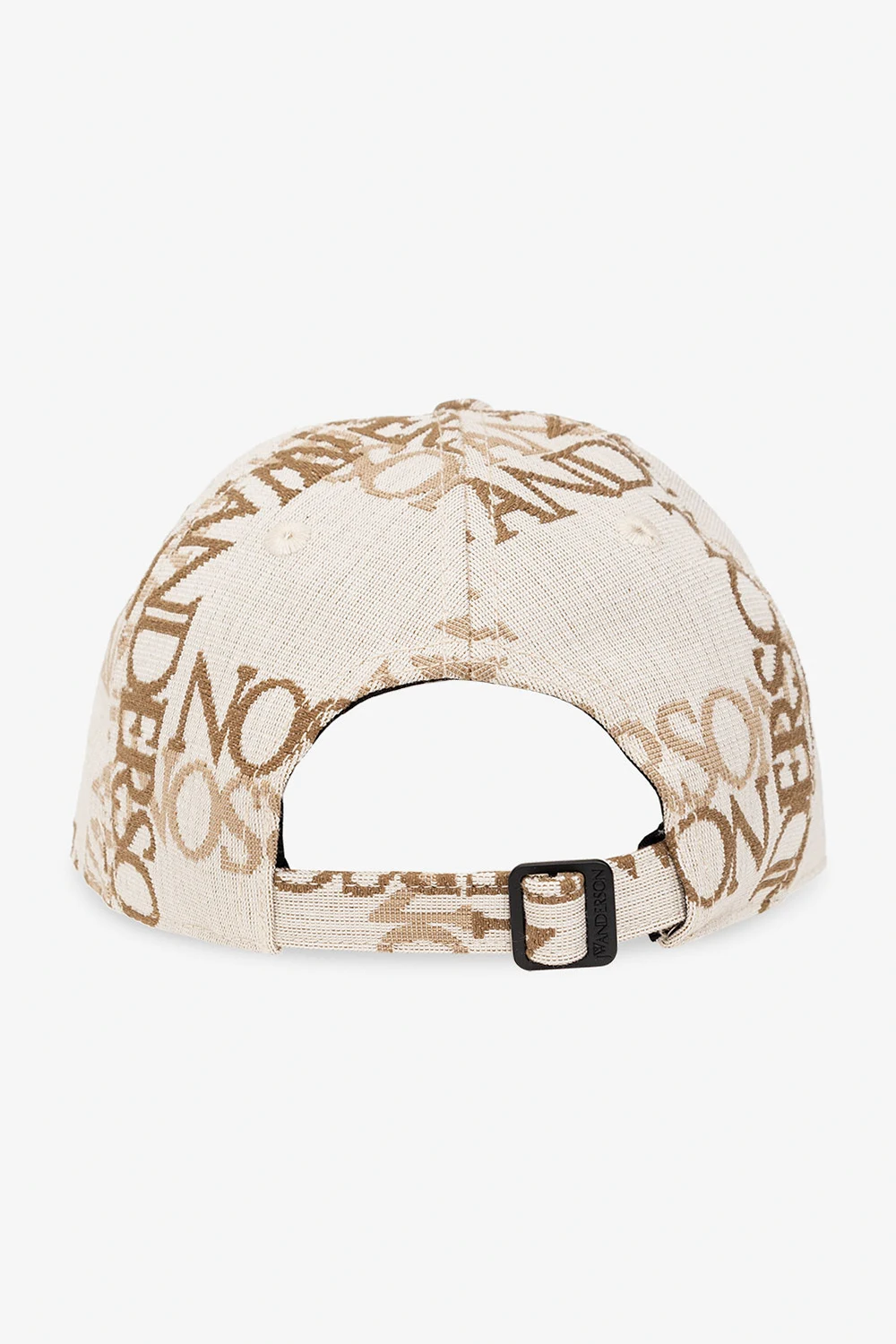 Kremowa czapka z daszkiem JW Anderson. Wykonana z bawełny. Ozdobiona wyszytym wzorem z logo w kolorze beżowo-brązowym. Z tyłu regulowany pasek z klamrą.