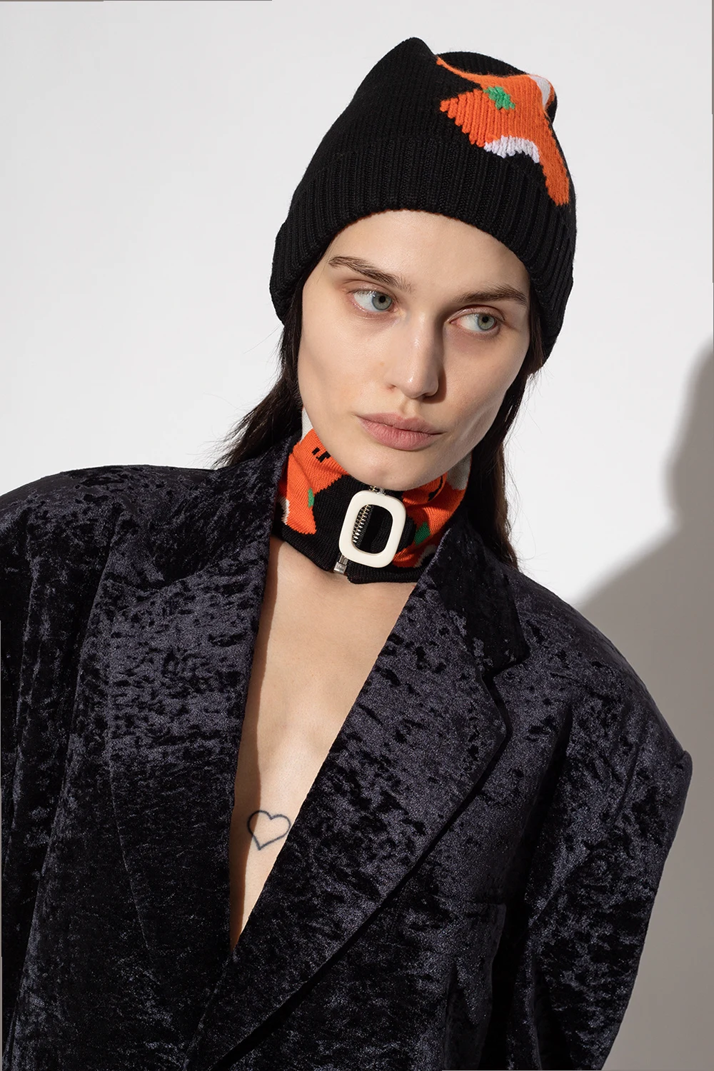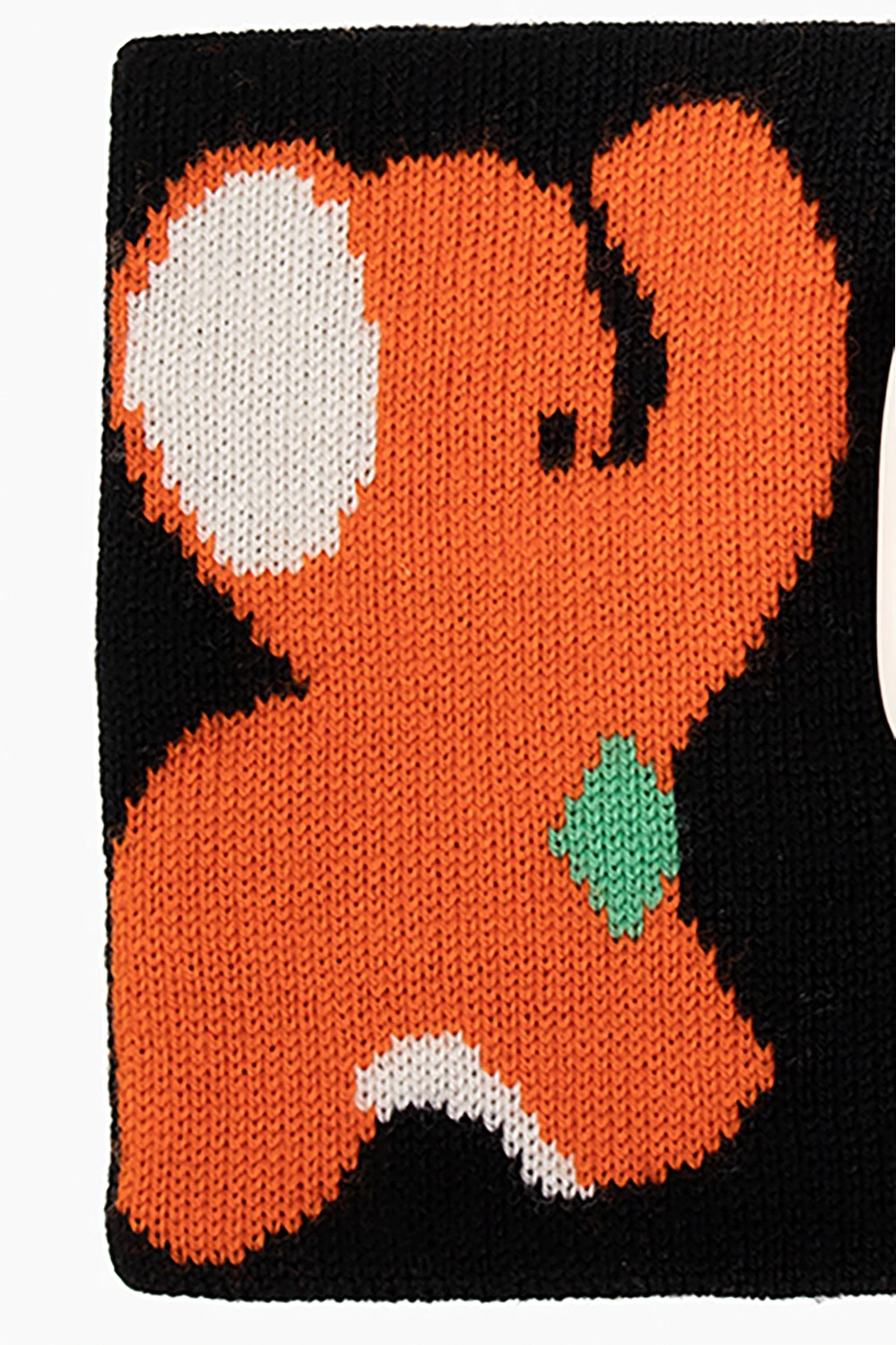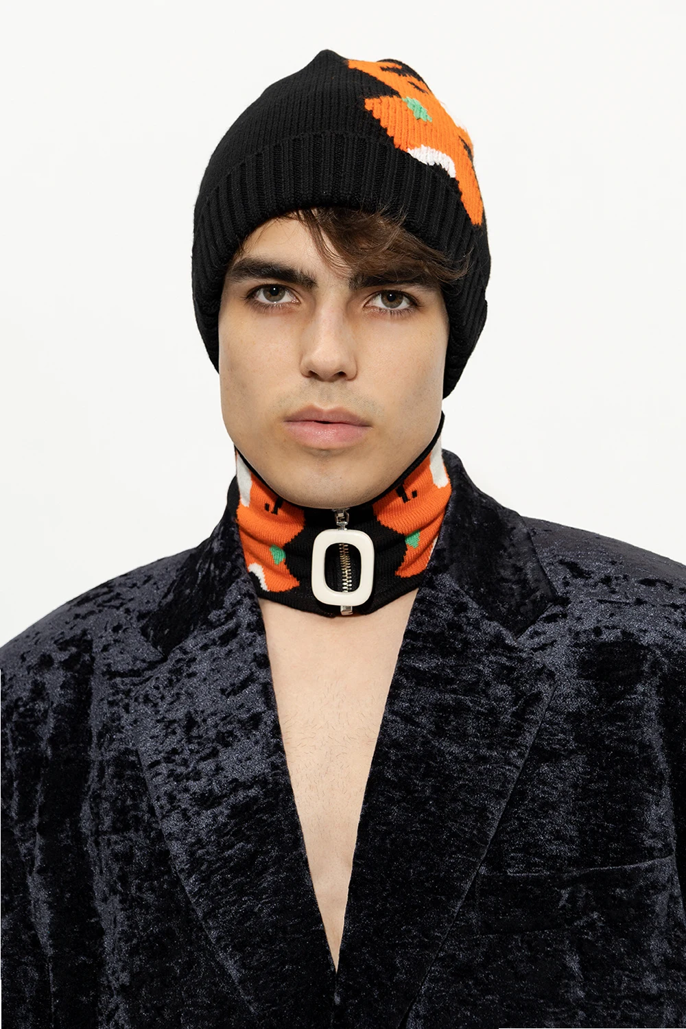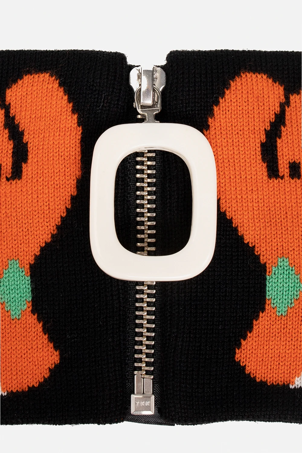 Czarno-pomarańczowo-kremowa opaska na szyję JW Anderson. Wykonana z wełny. Zapinana na zamek. Ozdobiona wzorem z motywem zwierzęcym.