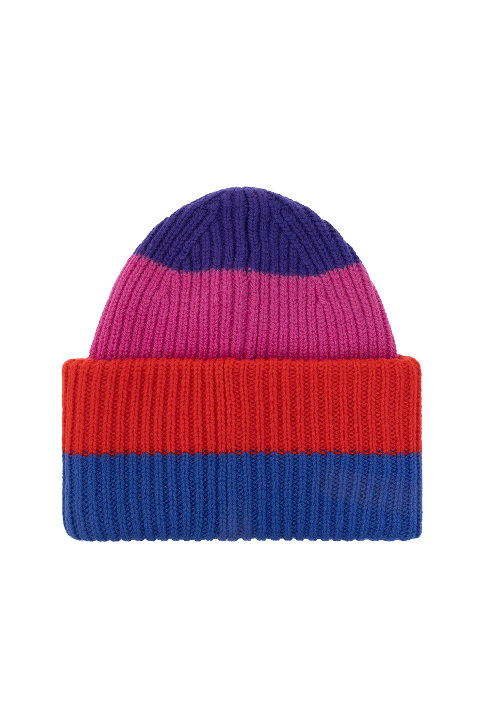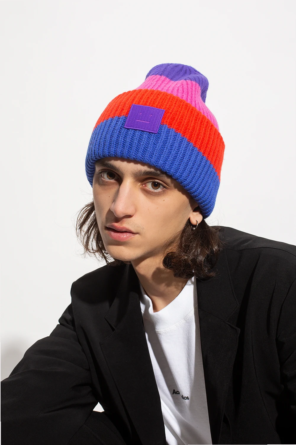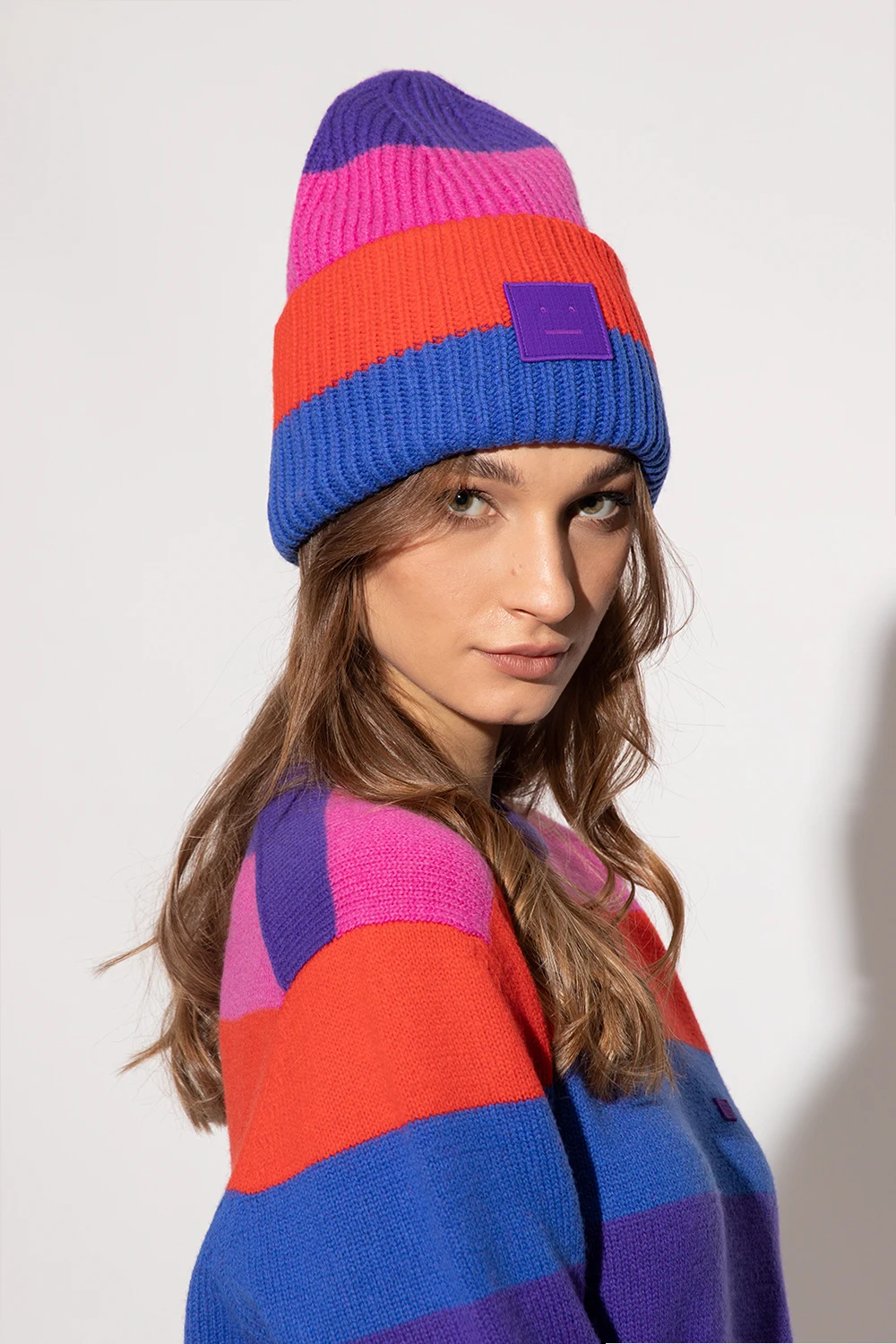Kolorowa, prążkowana czapka Acne Studios. Wykonana z wełny. Ozdobiona naszywką z logo w kolorze fioletowym.