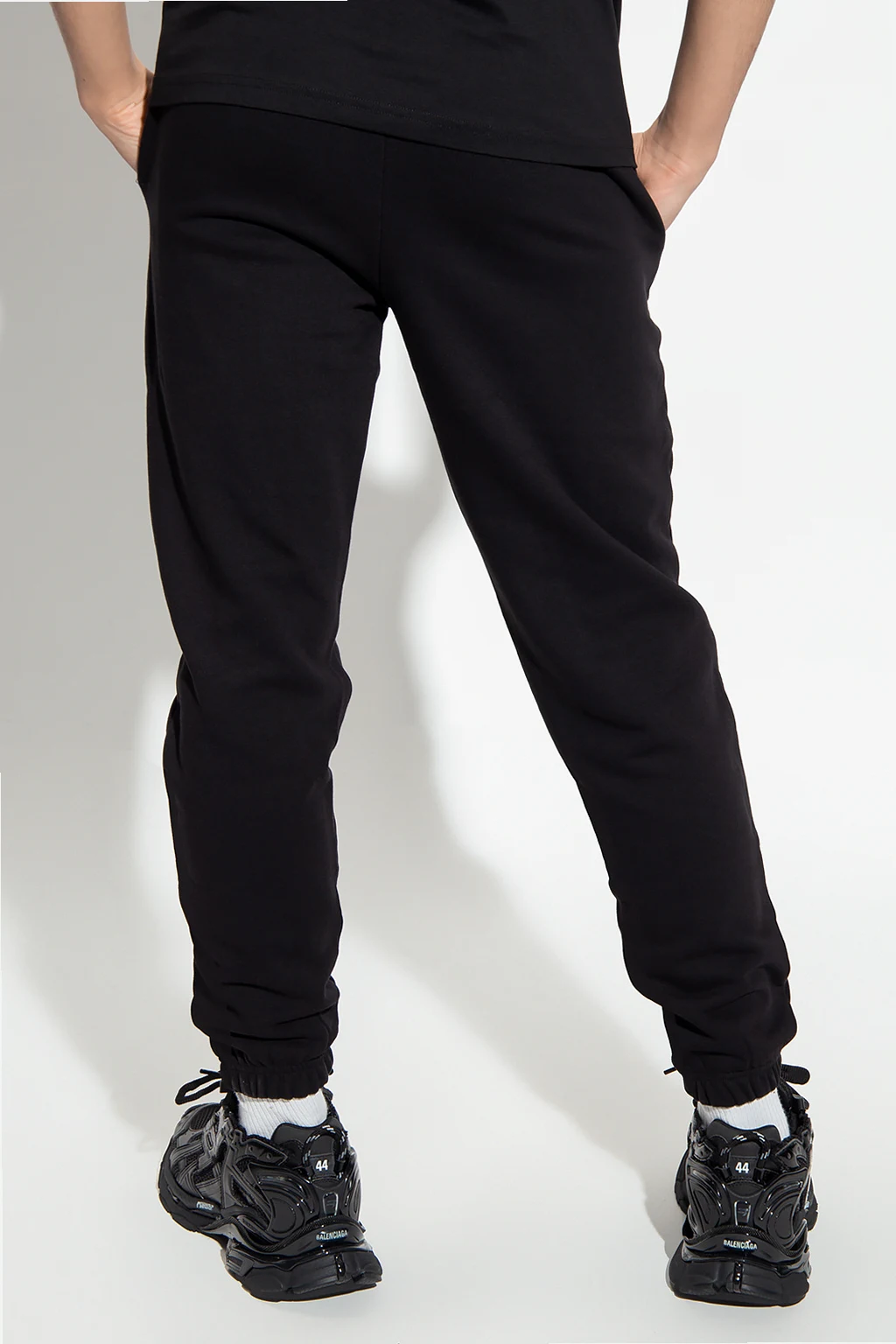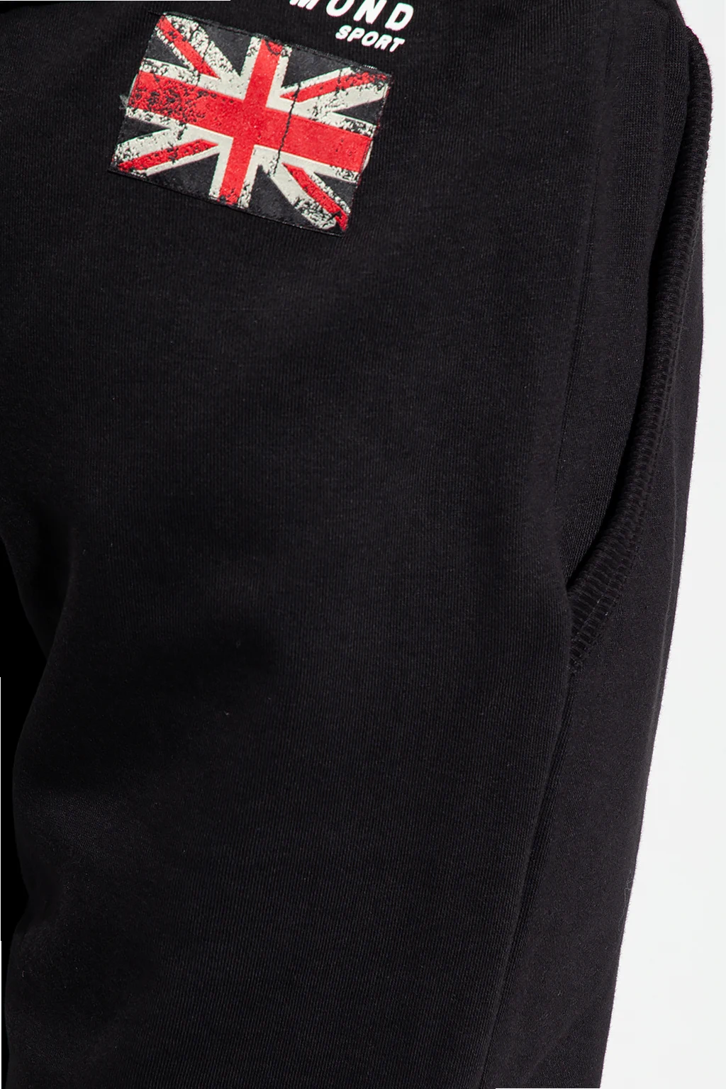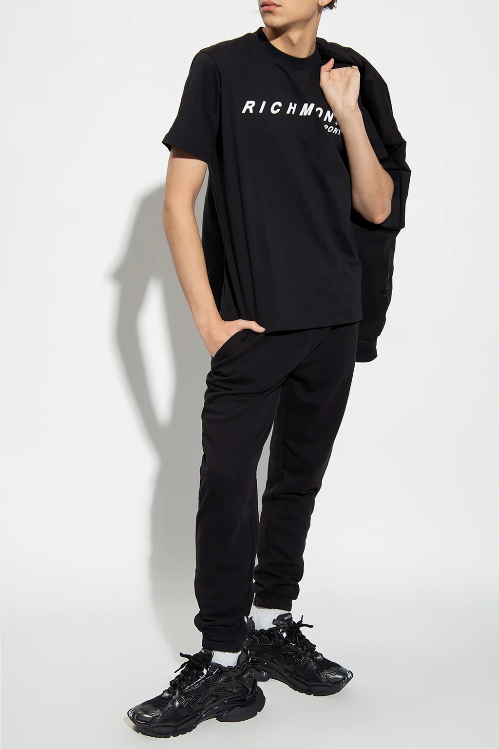 Czarne spodnie dresowe John Richmond. Wykonane z bawełny. W pasie wszyta guma ściągana trokami. Ozdobione naszywką z logo w kolorze biało-czarno-czerwonym. Dwie kieszenie wsuwane. Długie nogawki zakończone ściągaczem.