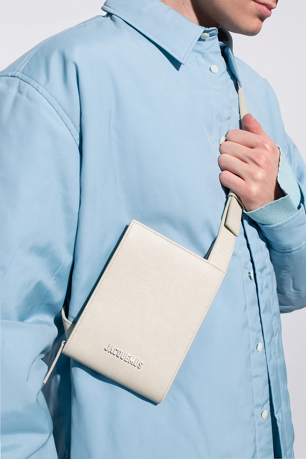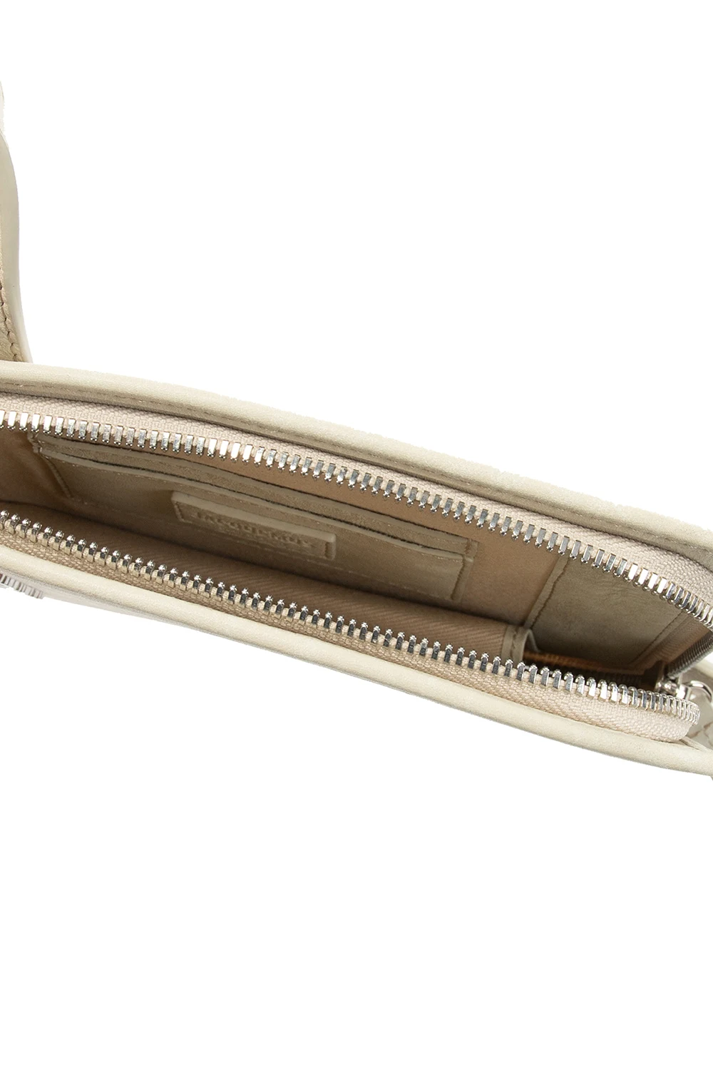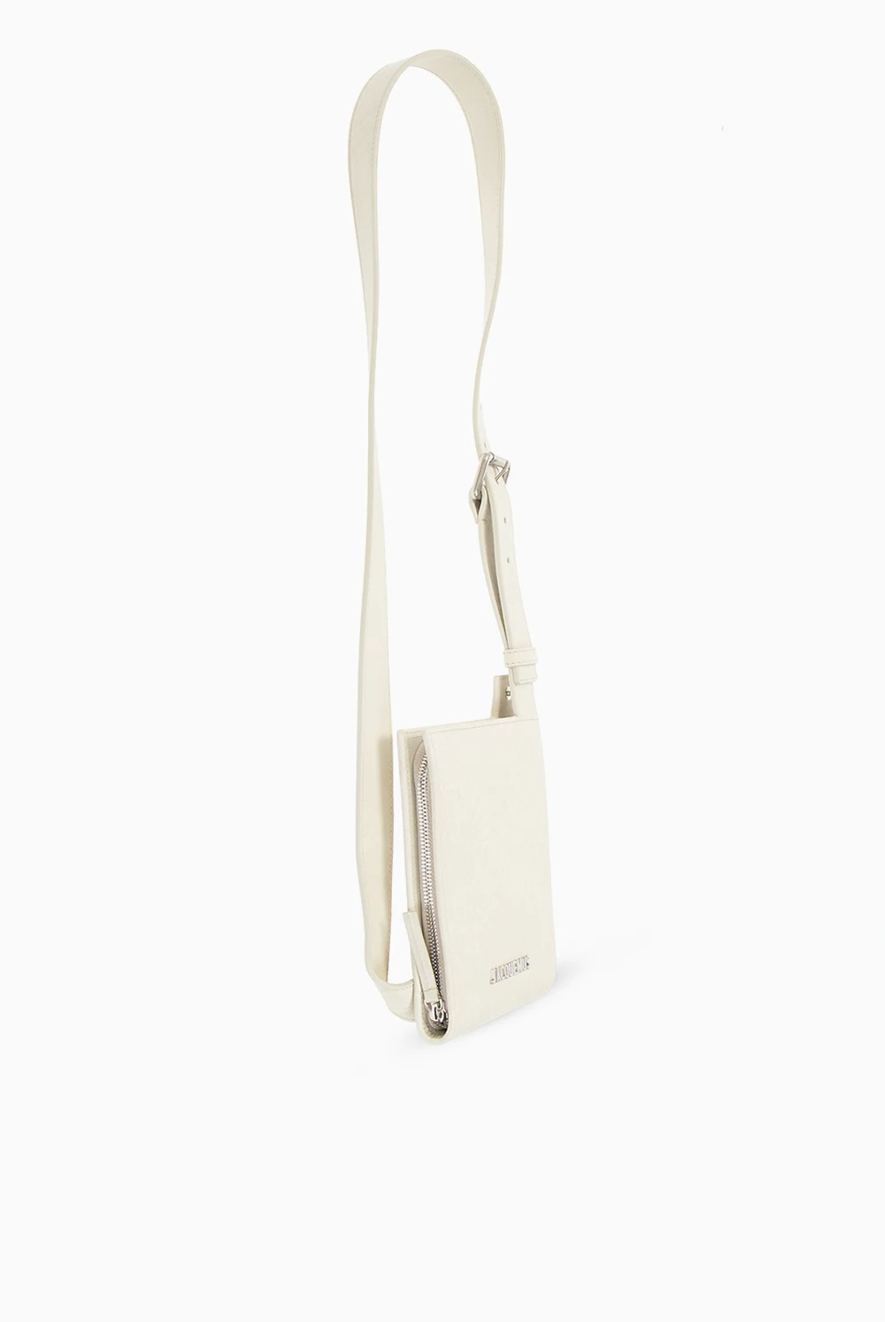 Jasnobeżowa saszetka na ramię, model ‘Le Carru’ Jacquemus. Wykonana ze skóry. Zamykana na zamek. Z przodu metalowe logo. Regulowany pasek. Wewnątrz komora i dwa miejsca na karty. Metalowe elementy w kolorze srebrnym.