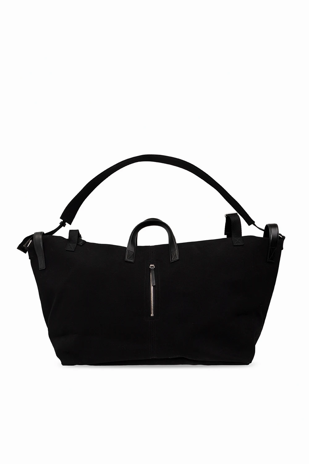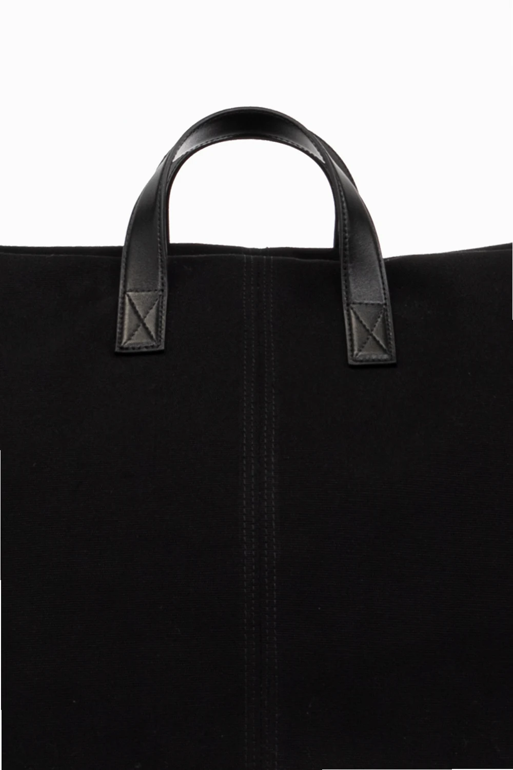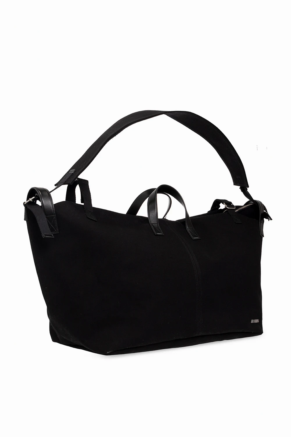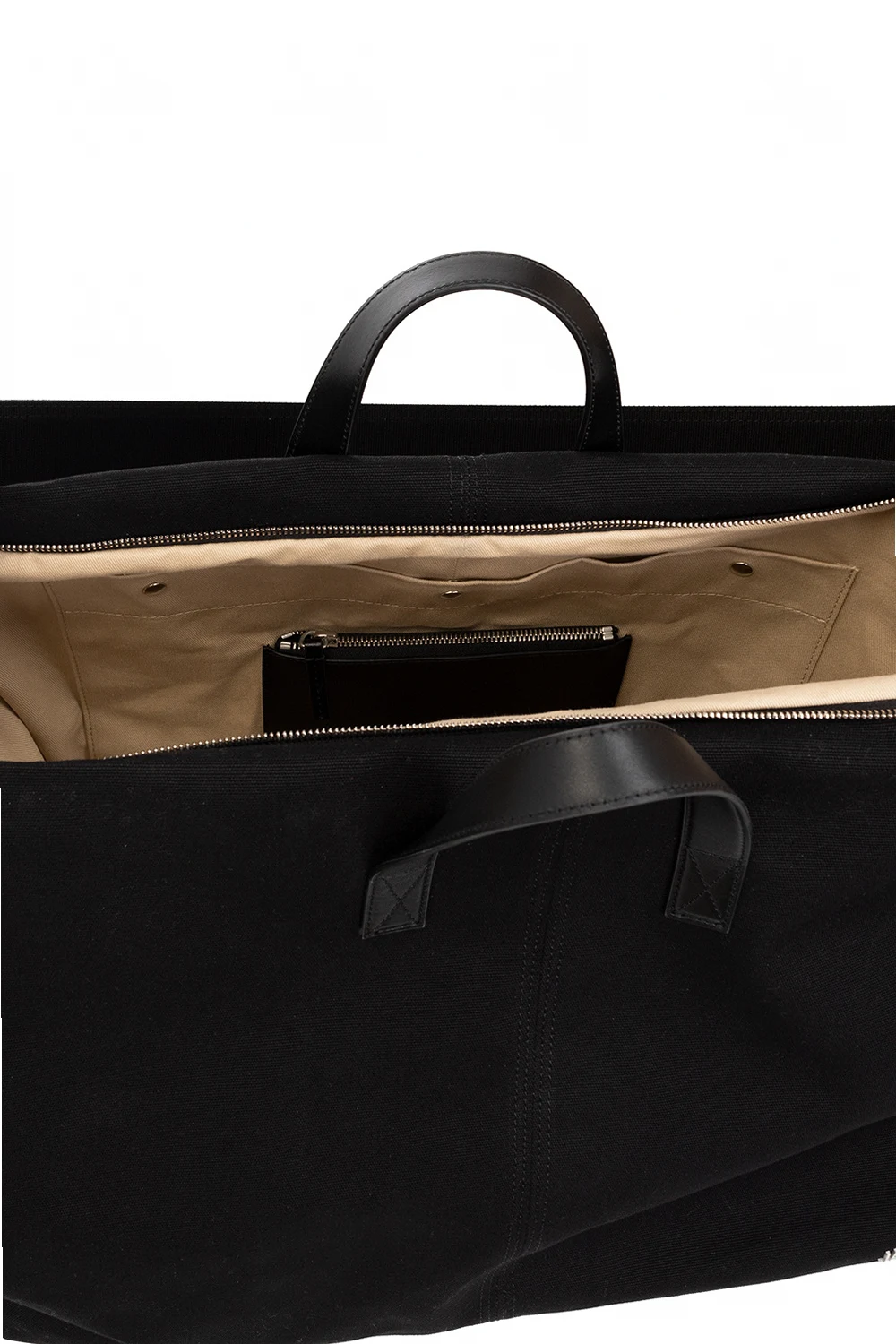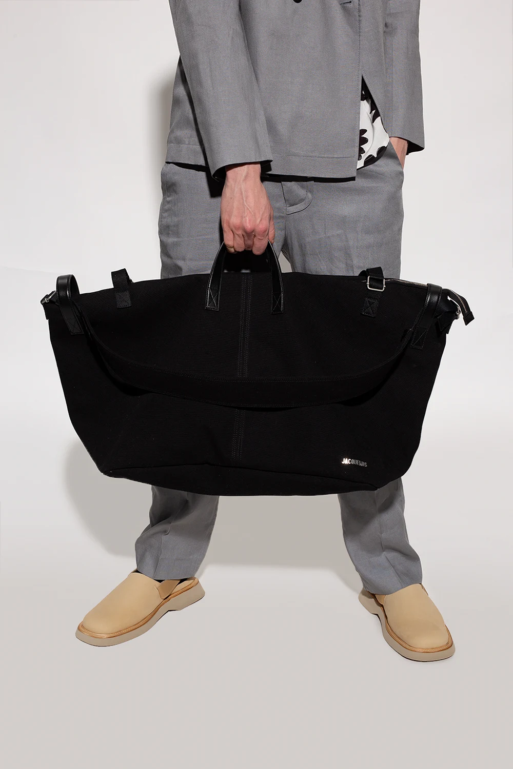 Czarna torba podręczna, model ‘Le Sac A Linge’ Jacquemus. Wykonana z bawełnianego płótna. Zamykana na zamek i paski z klamrą. Z przodu metalowa aplikacja z logo w kolorze srebrnym. Z tyłu kieszeń zamykana na zamek. Dwie półokrągłe rączki oraz pas na ramię. Wewnątrz beżowa komora z dwiema kieszeniami: zamykaną na zatrzaski oraz na zamek. Metalowe wykończenie w kolorze srebrnym.