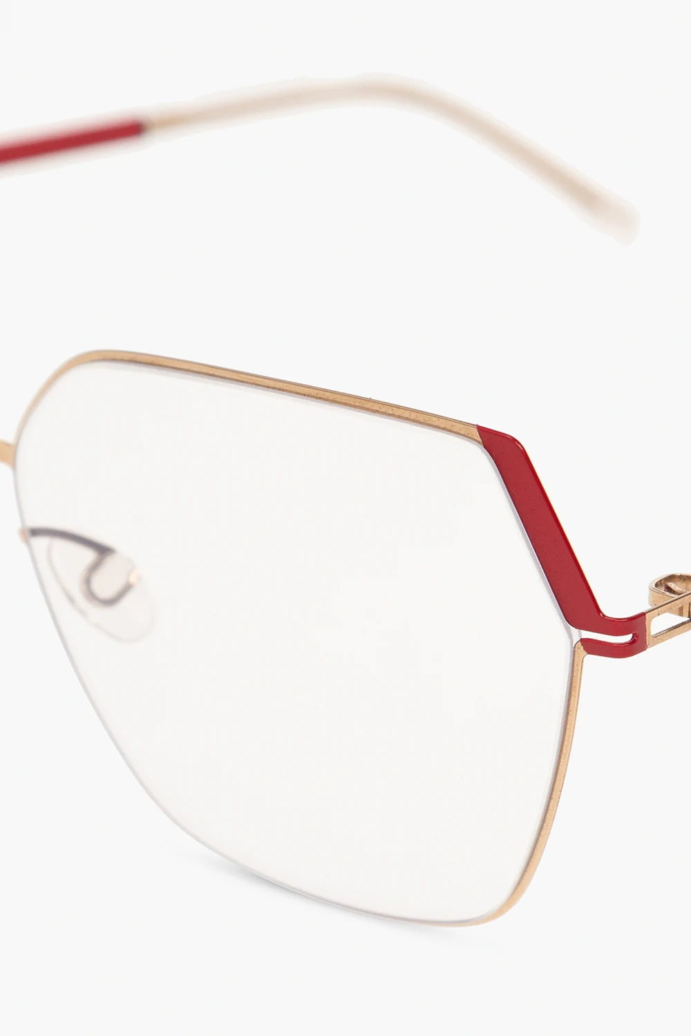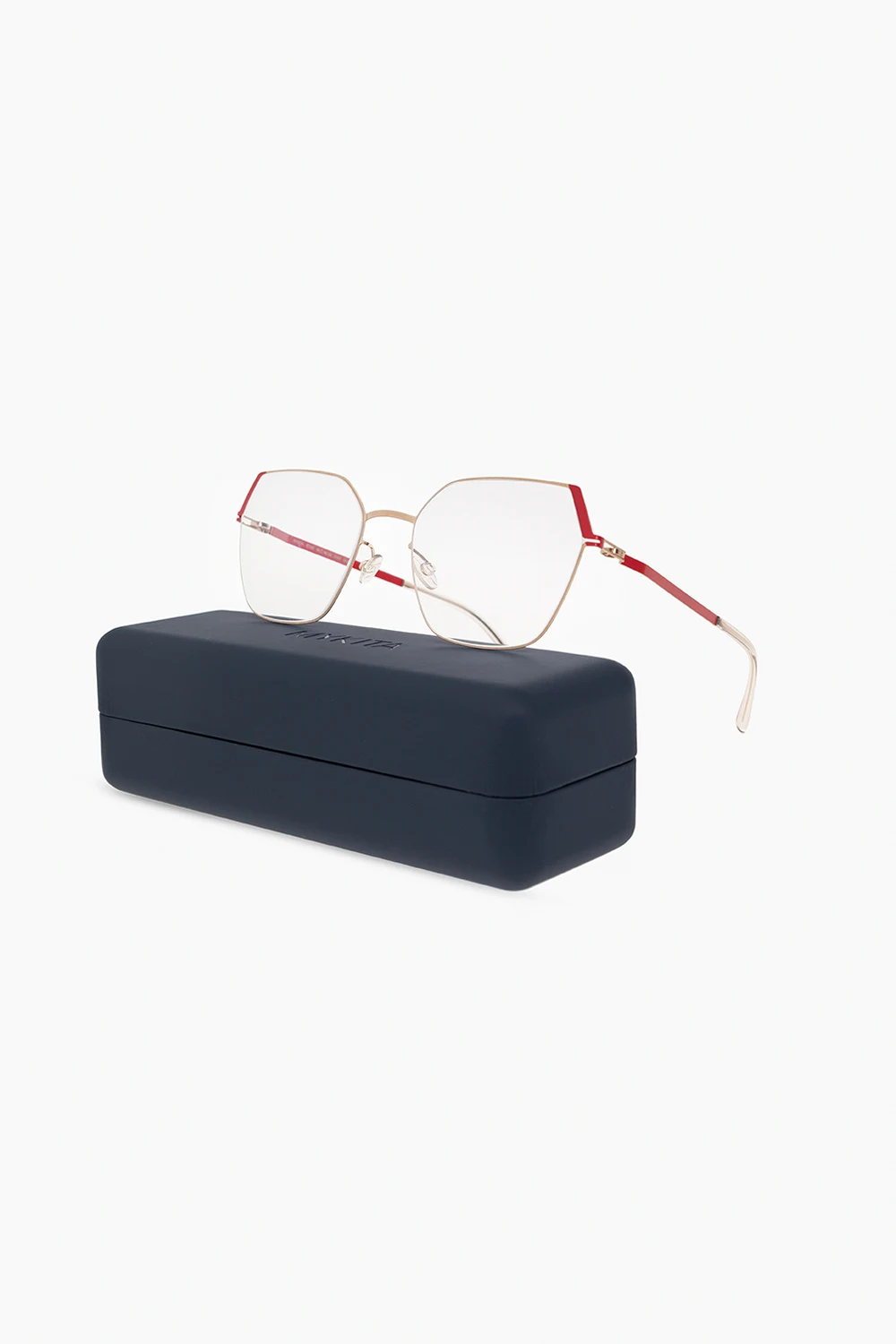 Okulary korekcyjne w kolorze złota i czerwieni, model ‘Stine Shiny’ Mykita. Wykonane z lekkiej stali nierdzewnej. Zauszniki z opatentowanym zawiasem spiralnym. Ręcznie wykonane w Berlinie. Dołączone etui.
