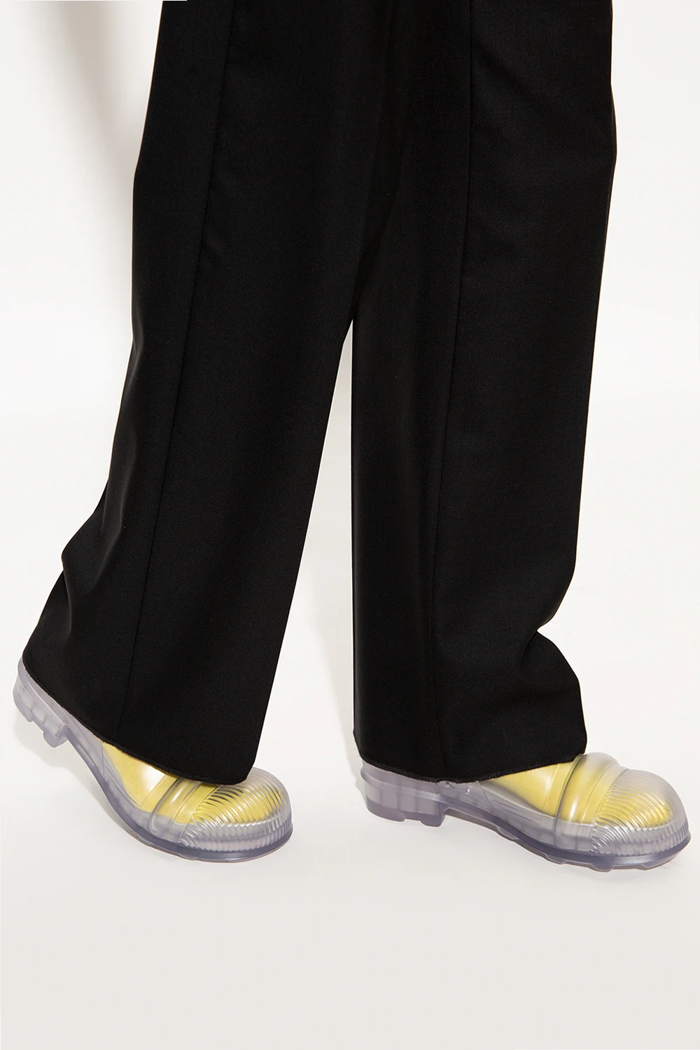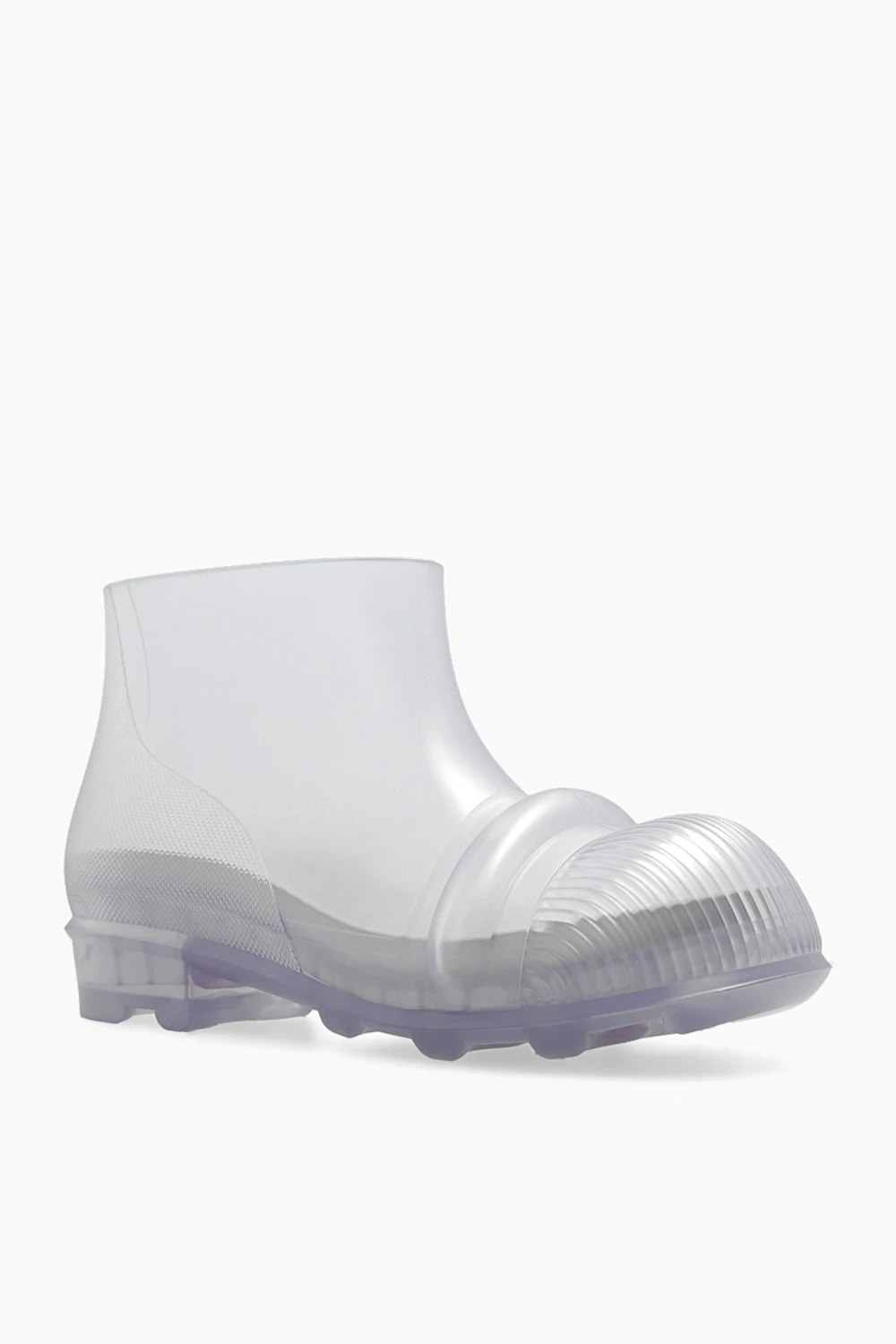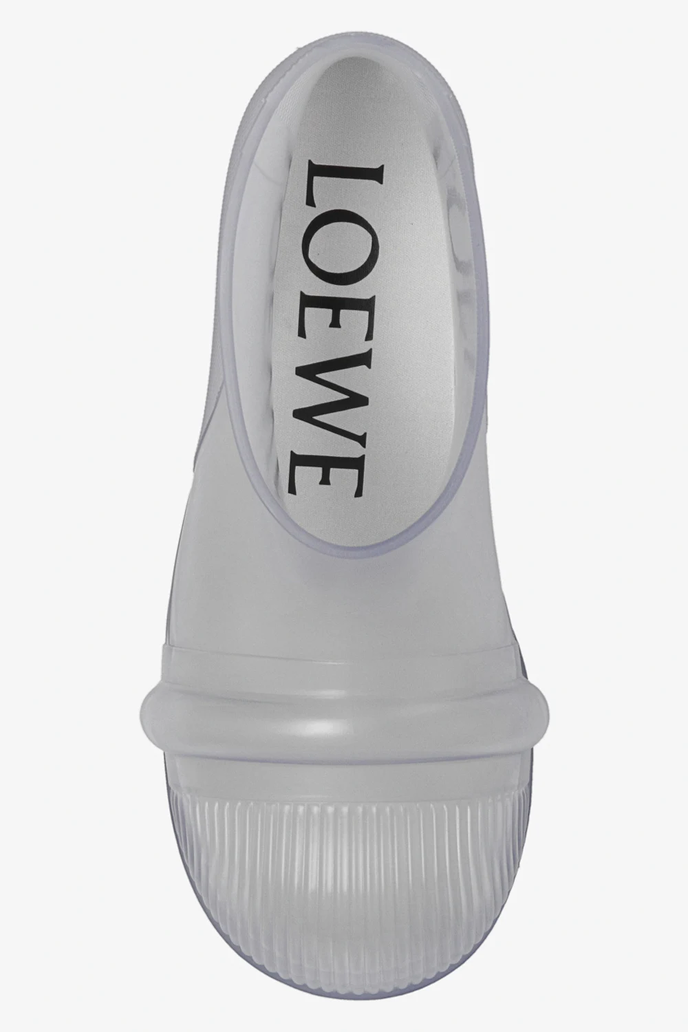 Transparentne, gumowe kalosze Loewe. Z przodu dekoracyjne prążkowanie. Z tyłu specjalna faktura.