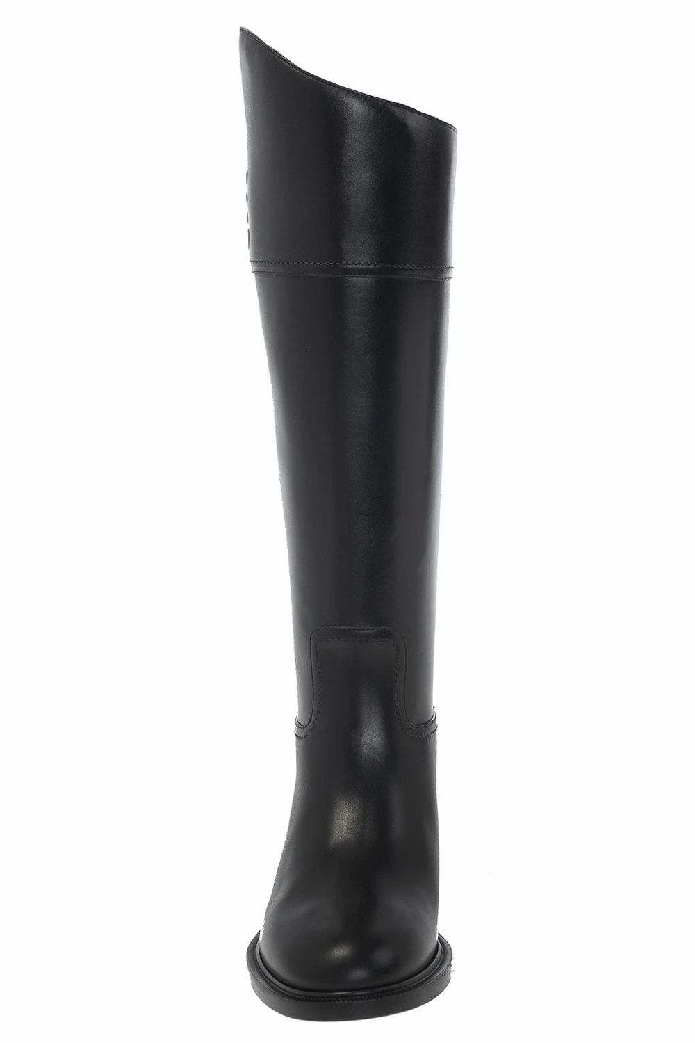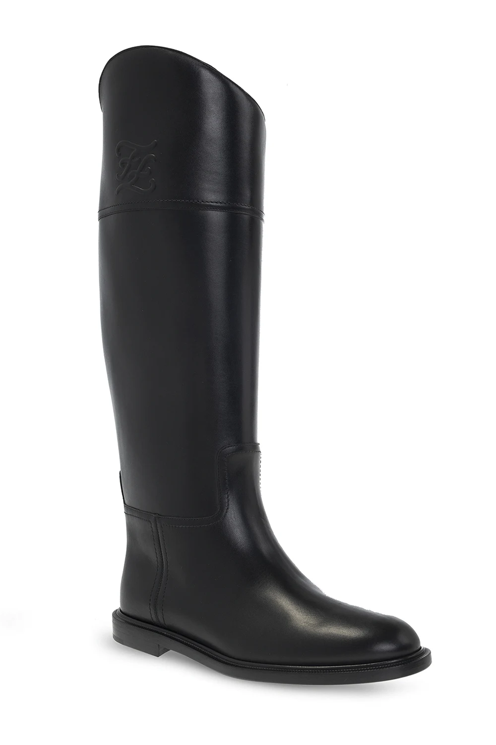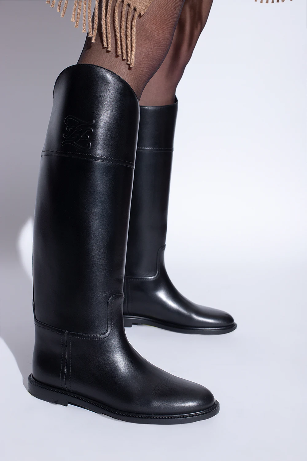 Czarne kozaki Fendi. Wykonane ze skóry. Ozdobione wytłoczonym wzorem z logo. Migdałowy nosek. Czarna, skórzana podeszwa.