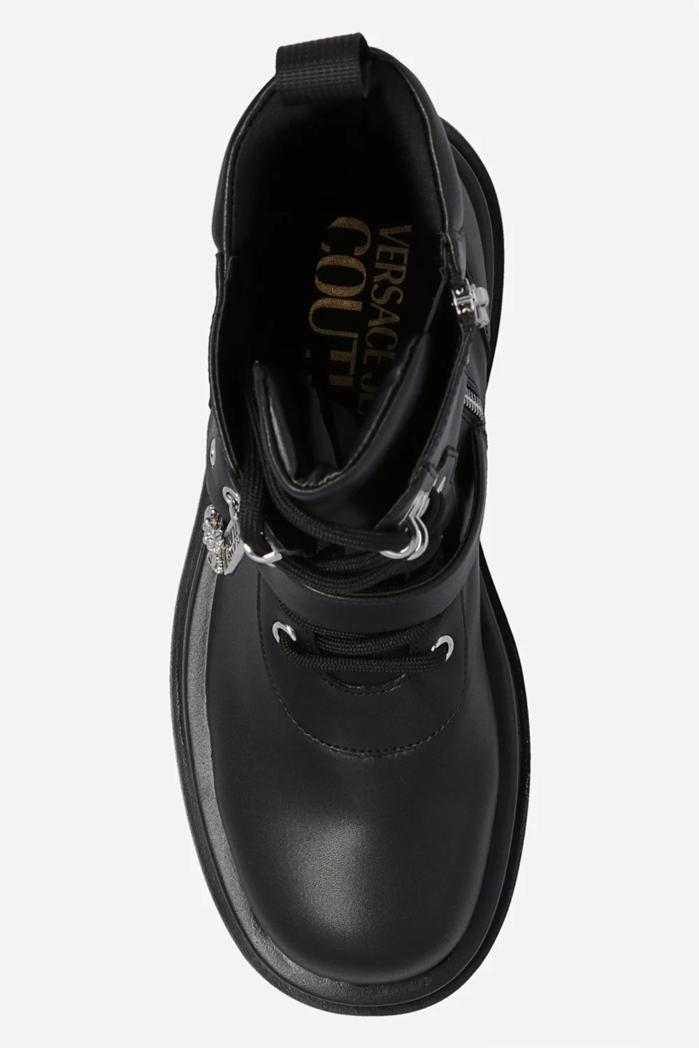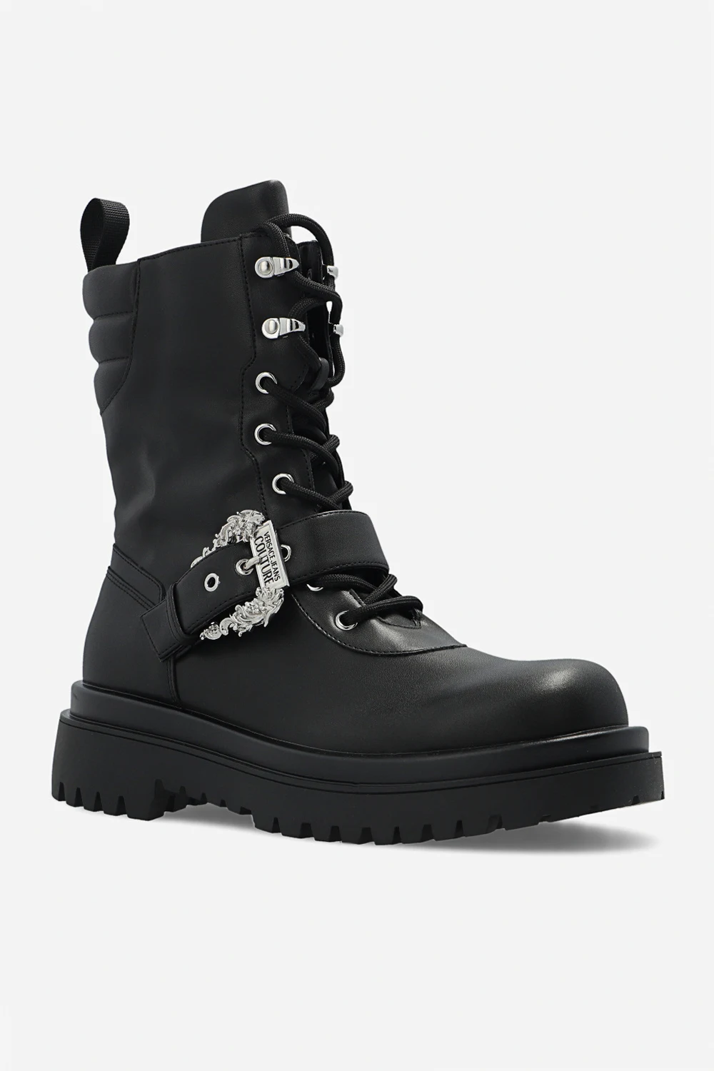 Czarne, sznurowane buty za kostkę typu ‘combat’ Versace Jeans Couture. Wykonane z imitacji skóry. Zapinane z boku na zamek. Z przodu dekoracyjny pasek z zapięciem na charakterystyczną dla marki, barokową klamrę. Z tyłu rypsowy pasek. Metalowe wykończenie w kolorze srebrnym. Czarna, gumowa podeszwa.
