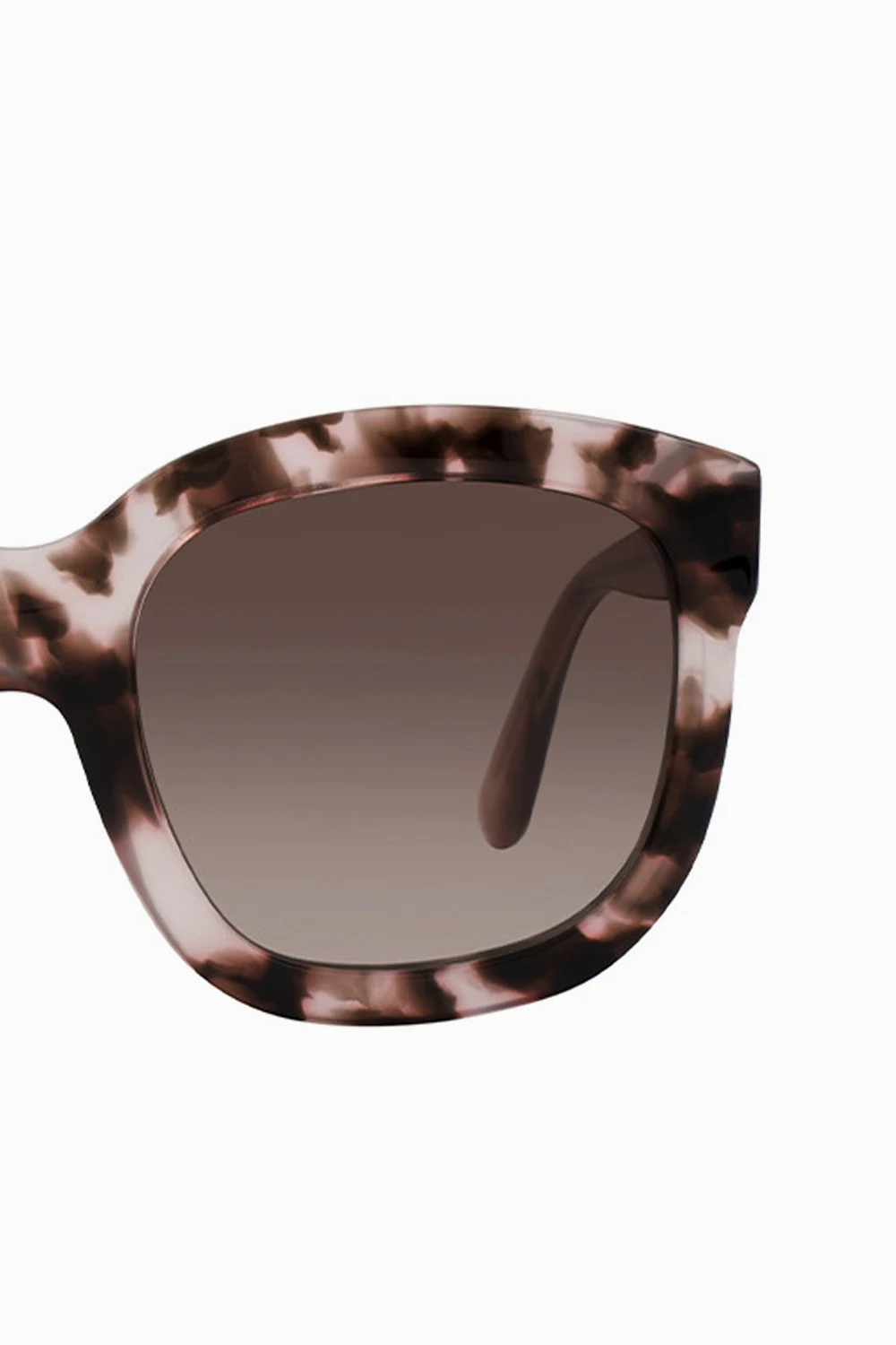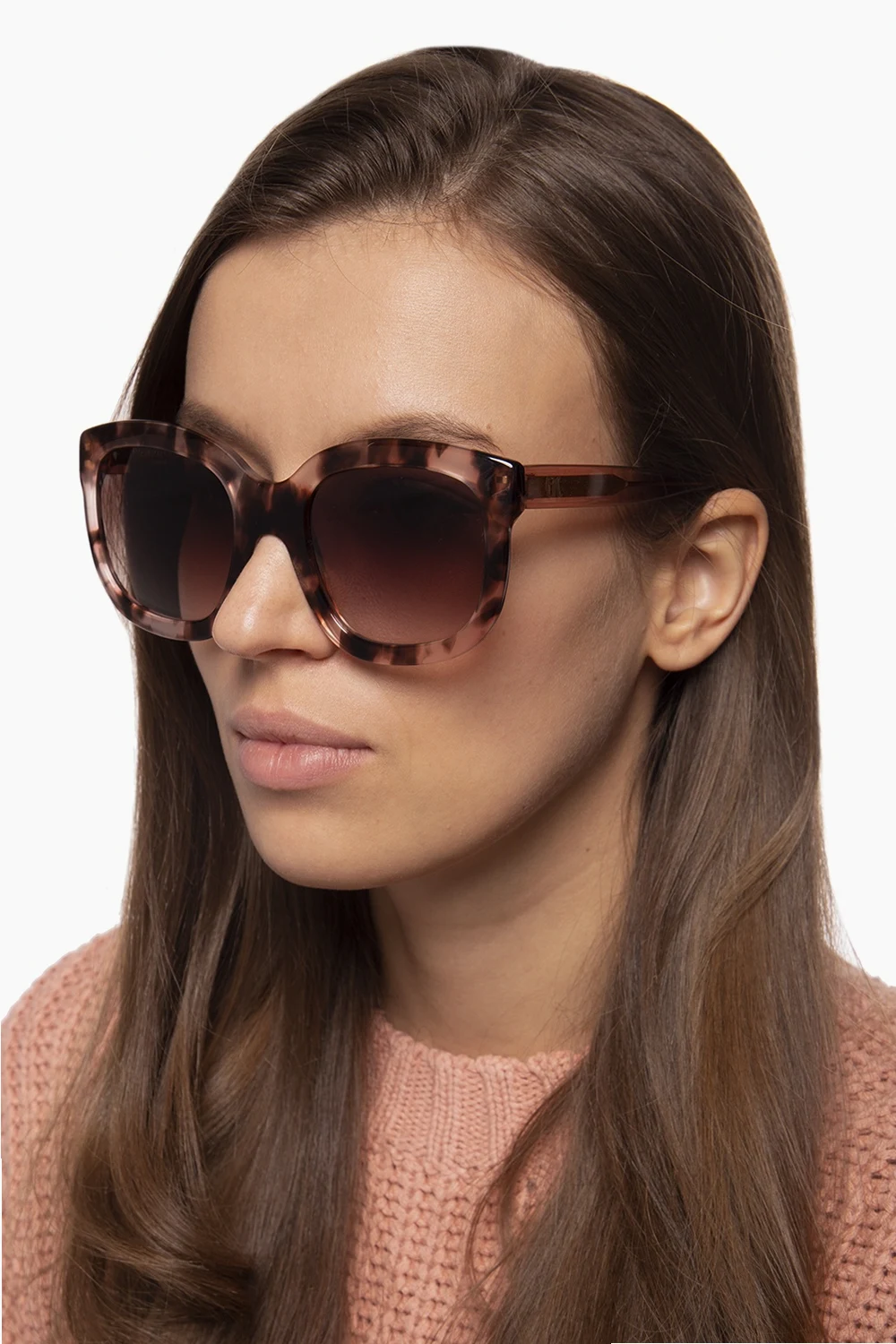 Różowo-brązowe okulary przeciwsłoneczne Emmanuelle Khanh. Ręcznie wykonane. Ozdobione nadrukowanym wzorem w cętki. Zauszniki z efektem brokatowym w kolorze złotym. Brązowe, certyfikowane soczewki UVA/UVB. Dołączone czarne etui zamykane na dekoracyjny zatrzask.