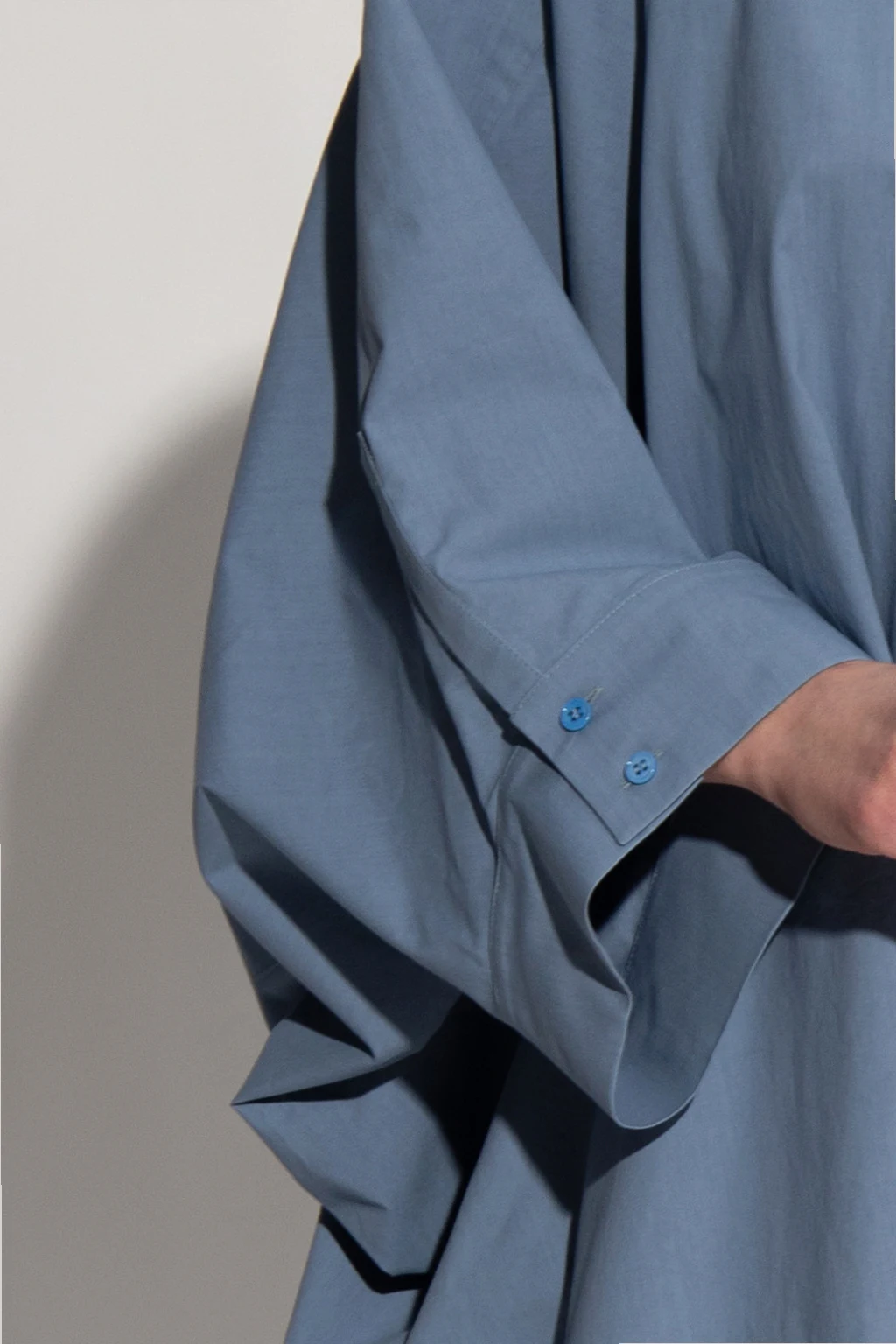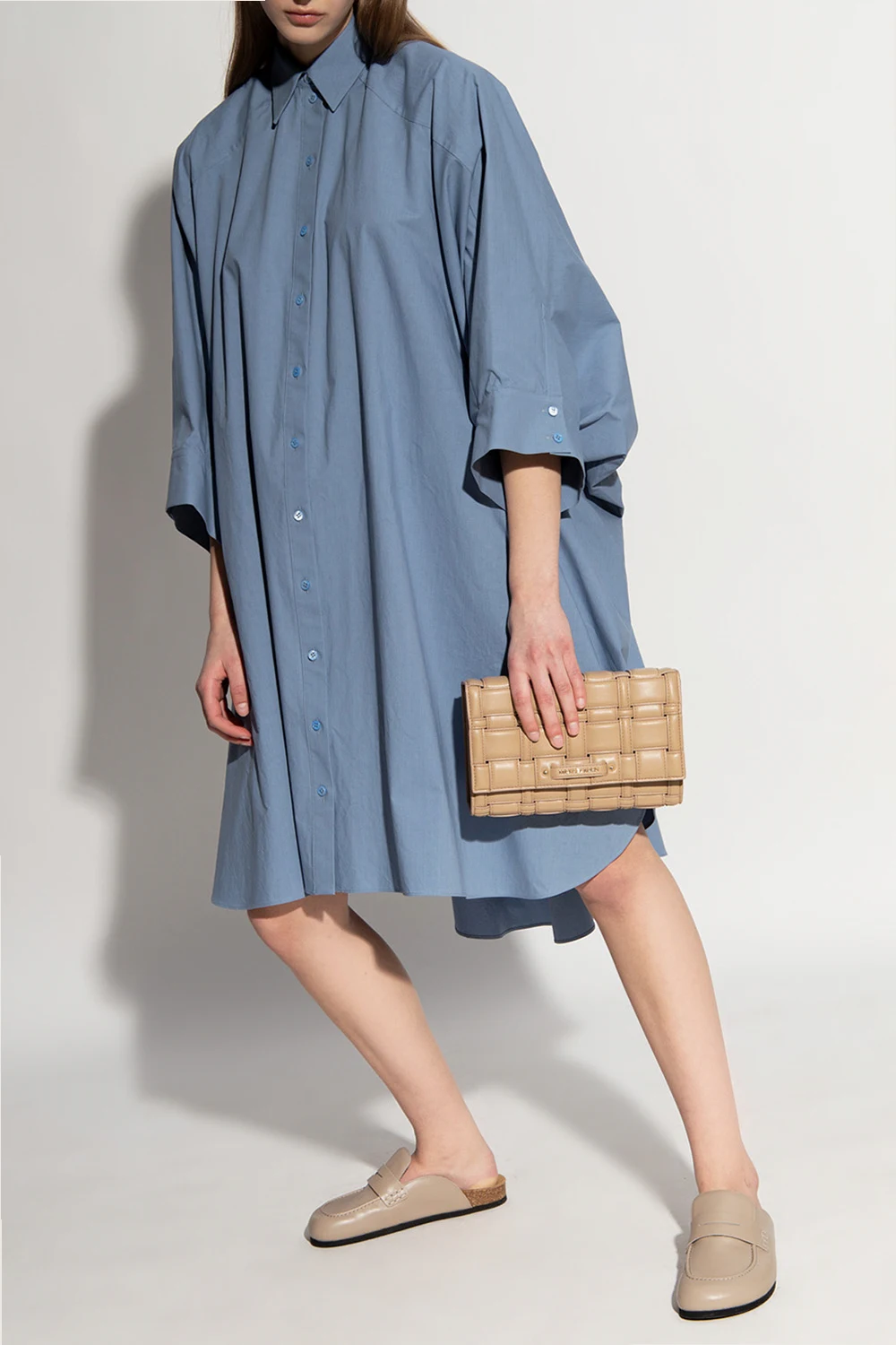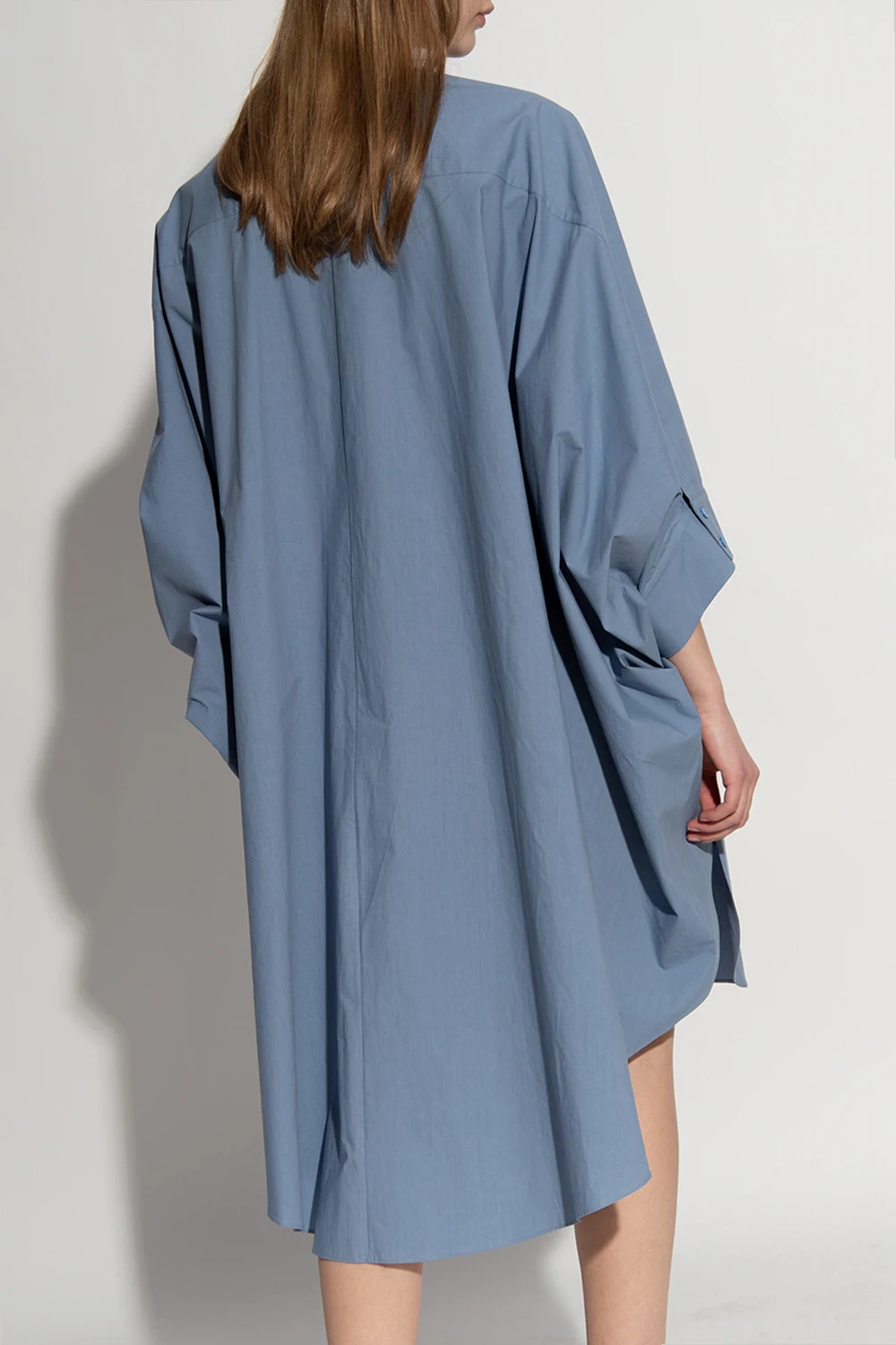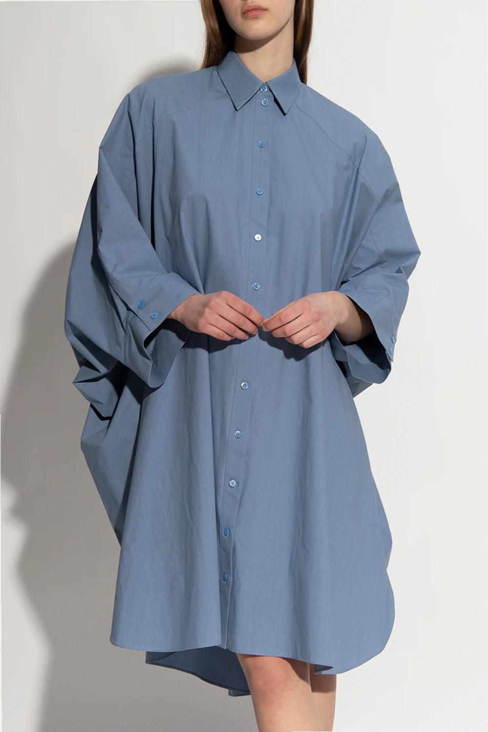 Niebieska, bawełniana, koszulowa sukienka typu ‘oversize’ Michael Kors. Zapinana na guziki. Z przodu dwie wsuwane kieszenie.