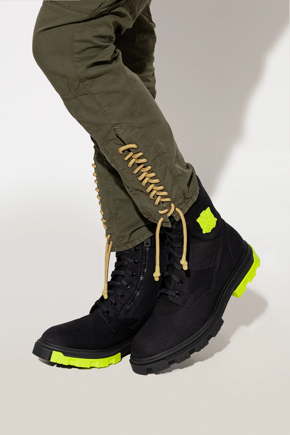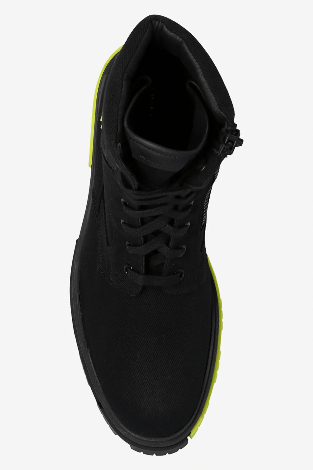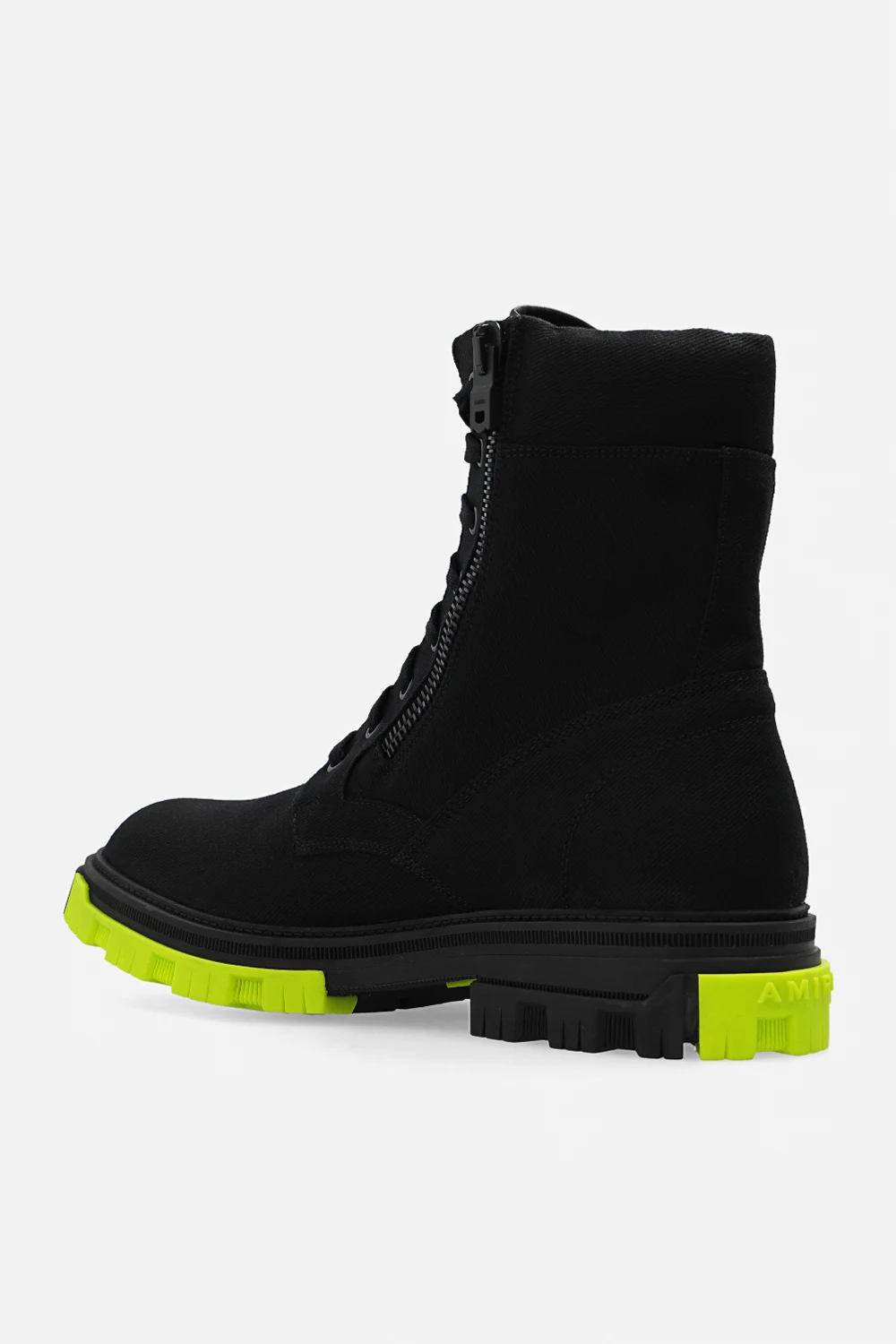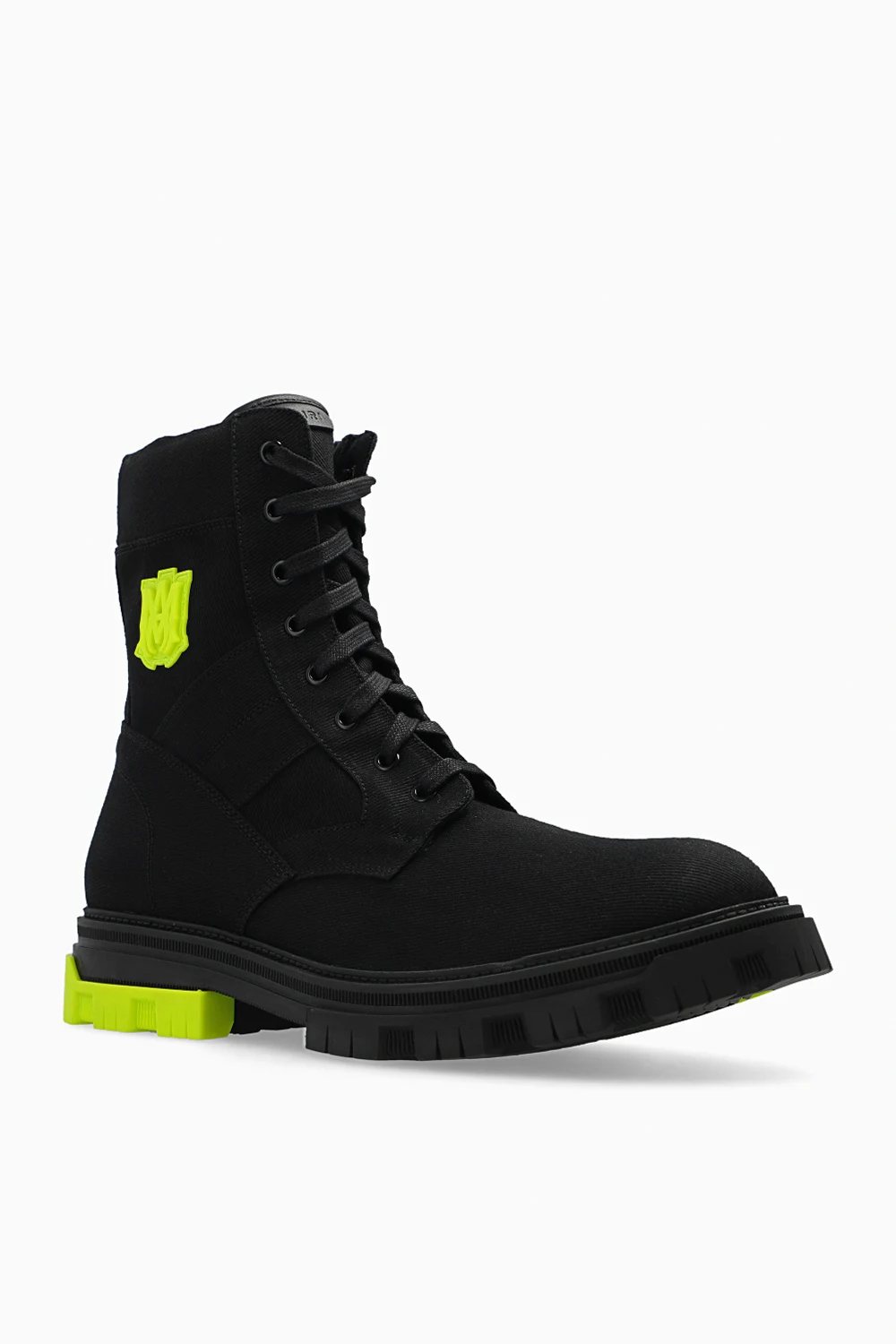 Czarne, sznurowane buty typu ‘combat’ Amiri. Z boku zapięcie na zamek. Ozdobione naszywką z wytłoczonym logo w kolorze zielonym. Czarno-zielona, gumowa podeszwa.
