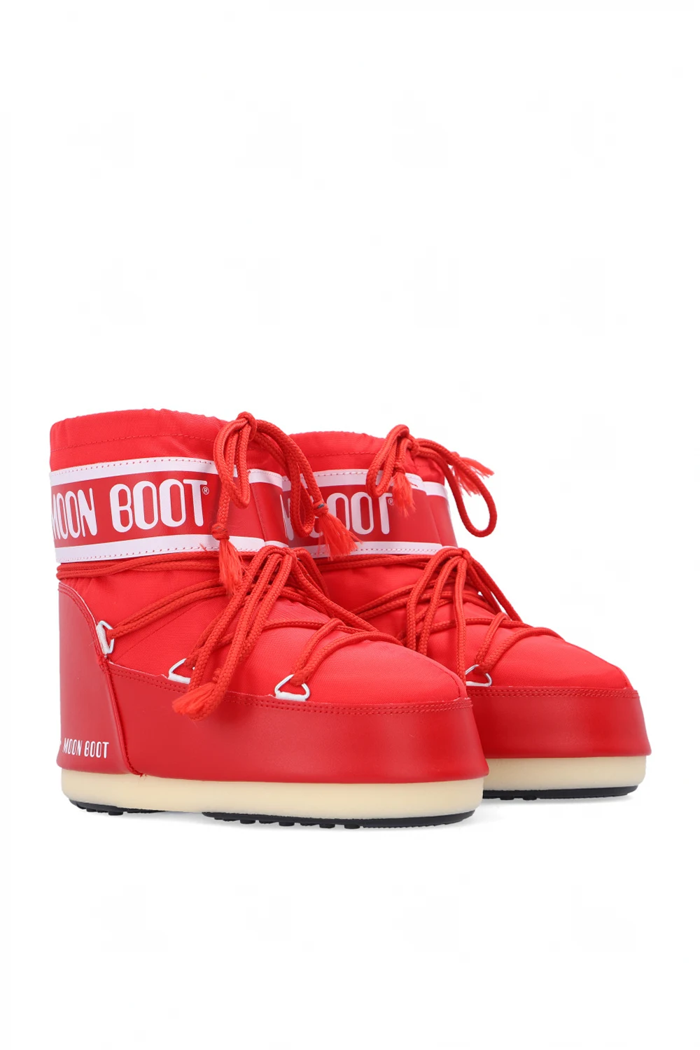 Czerwono-białe, sznurowane śniegowce, model ‘Classic Low 2’ Moon Boot Kids. Wykończone materiałem imitującym skórę. Nadruk z logo. Kremowo-czarna, gumowa podeszwa. Metalowe elementy w kolorze srebrnym. Śniegowce inspirowane specyficznym kształtem i technologią butów dla astronautów, zaprojektowane w 1969 roku, kiedy pierwszy człowiek stanął na Księżycu.