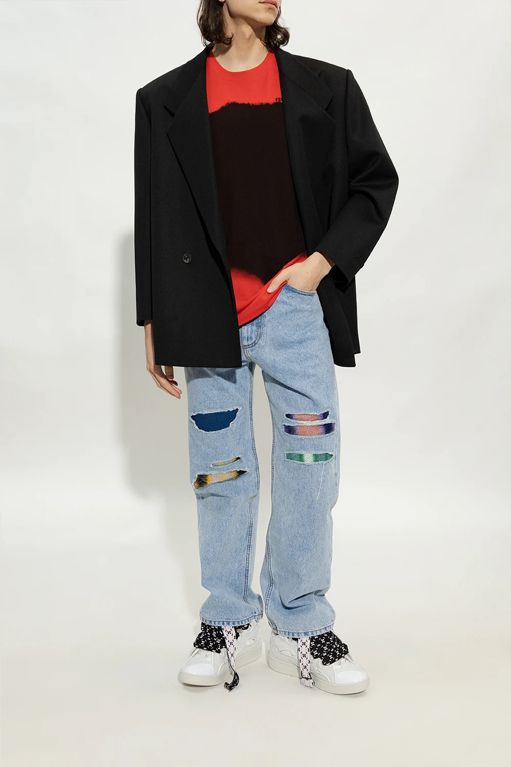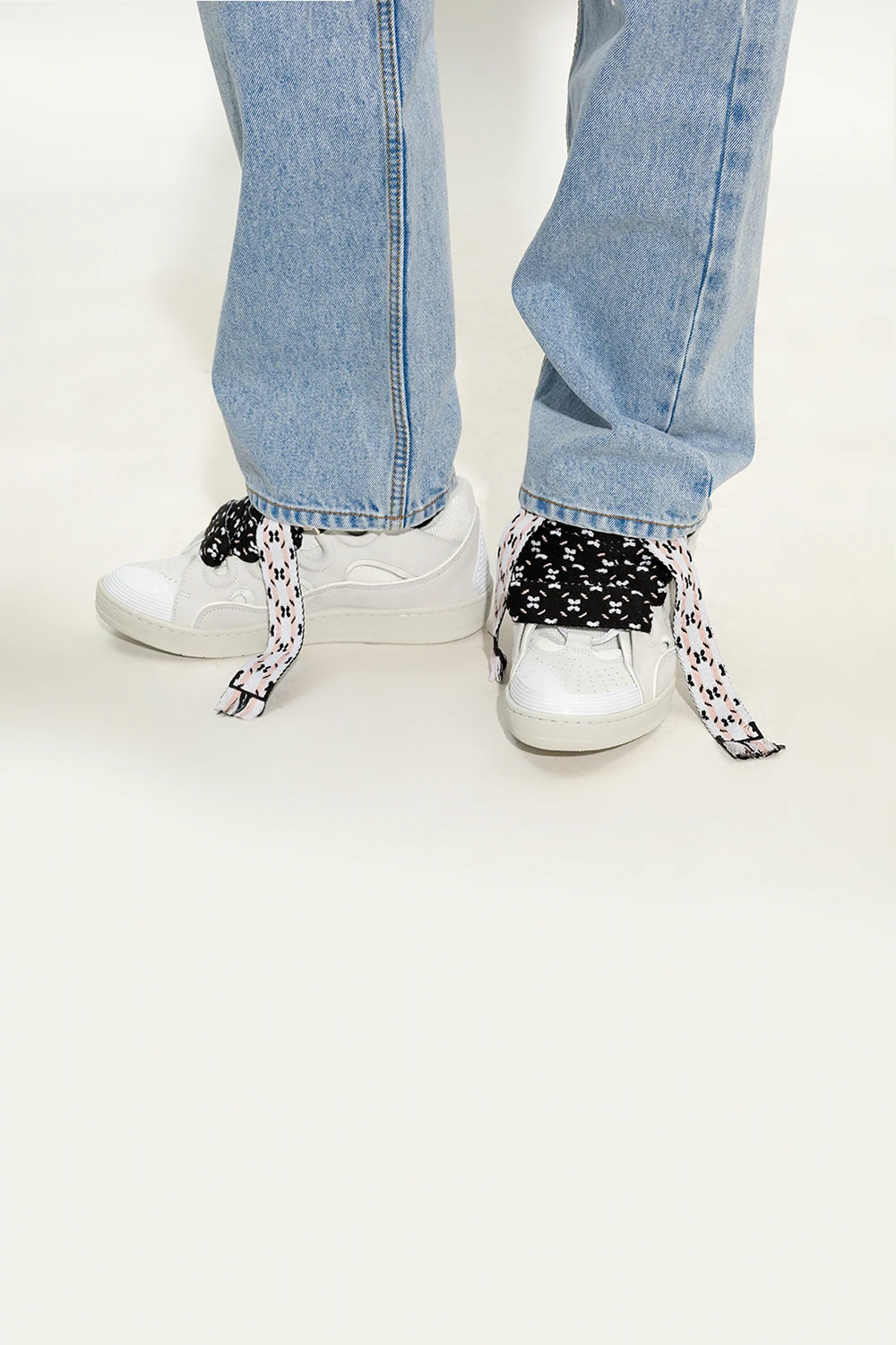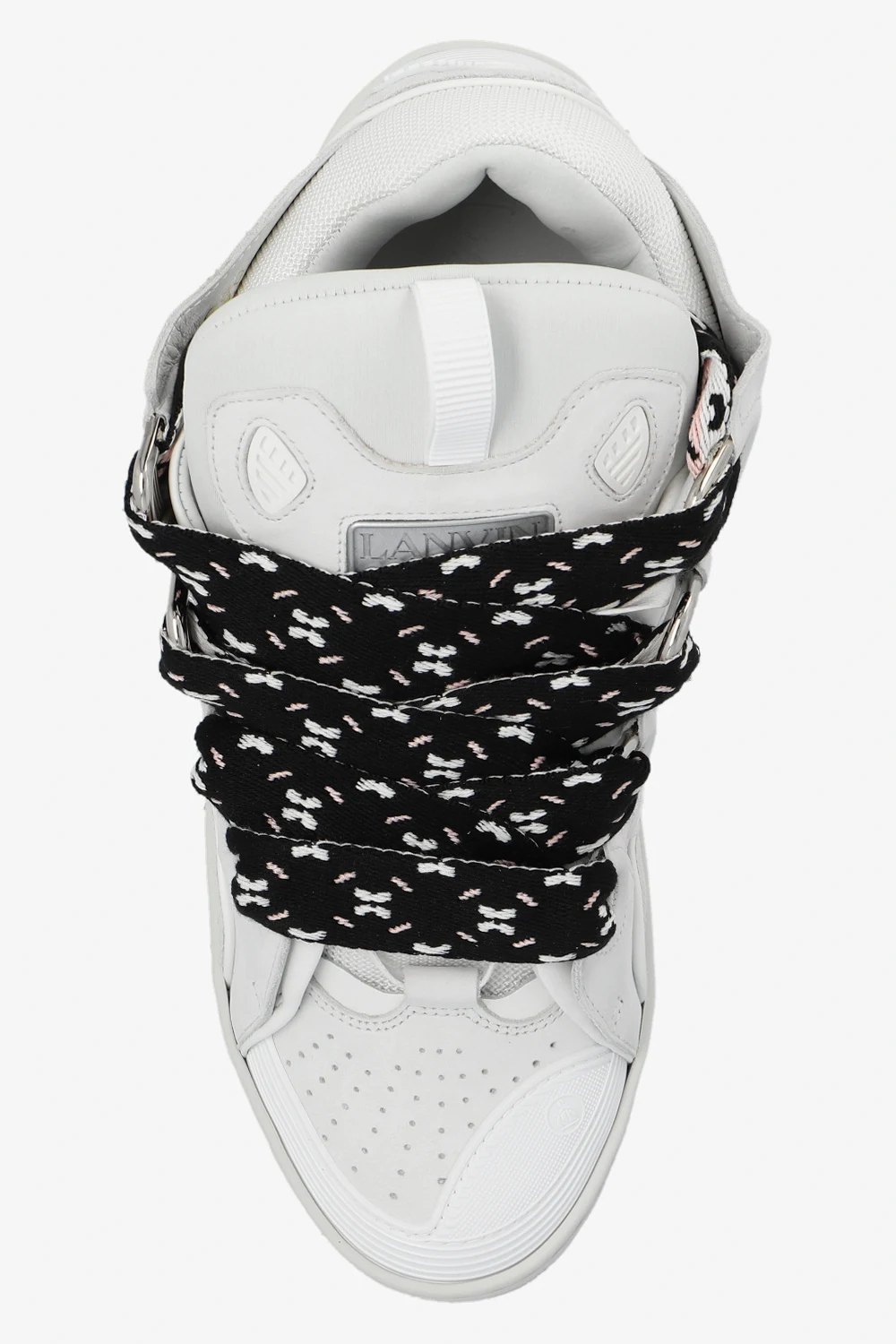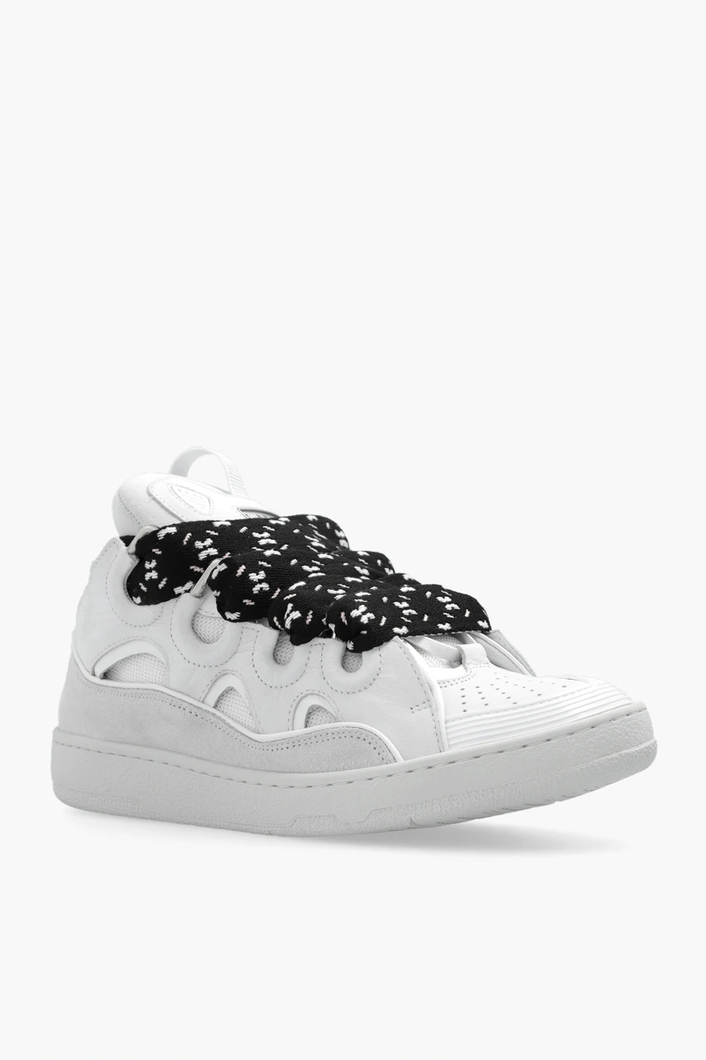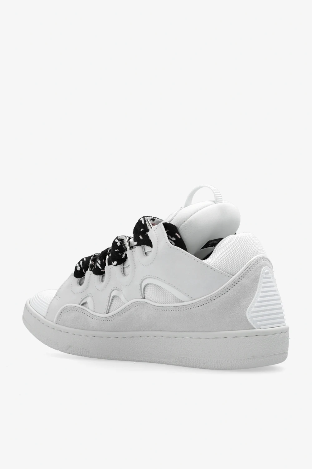 Białe, sznurowane buty sportowe, model ‘Curb’ Lanvin. Wykonane z zamszu i wykończone materiałem. Ozdobione wytłoczonym logo i naszywką w kolorze srebrnym. Dekoracyjne, szerokie sznurowadła w kolorze czarno-różowo-białym. Biała, gumowa podeszwa.