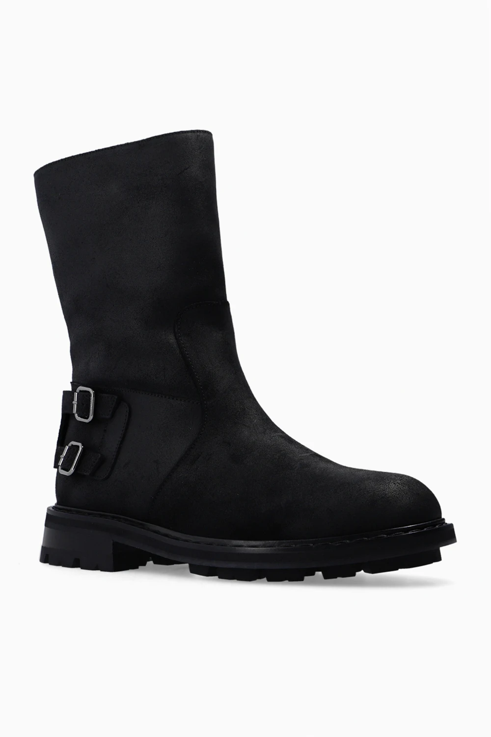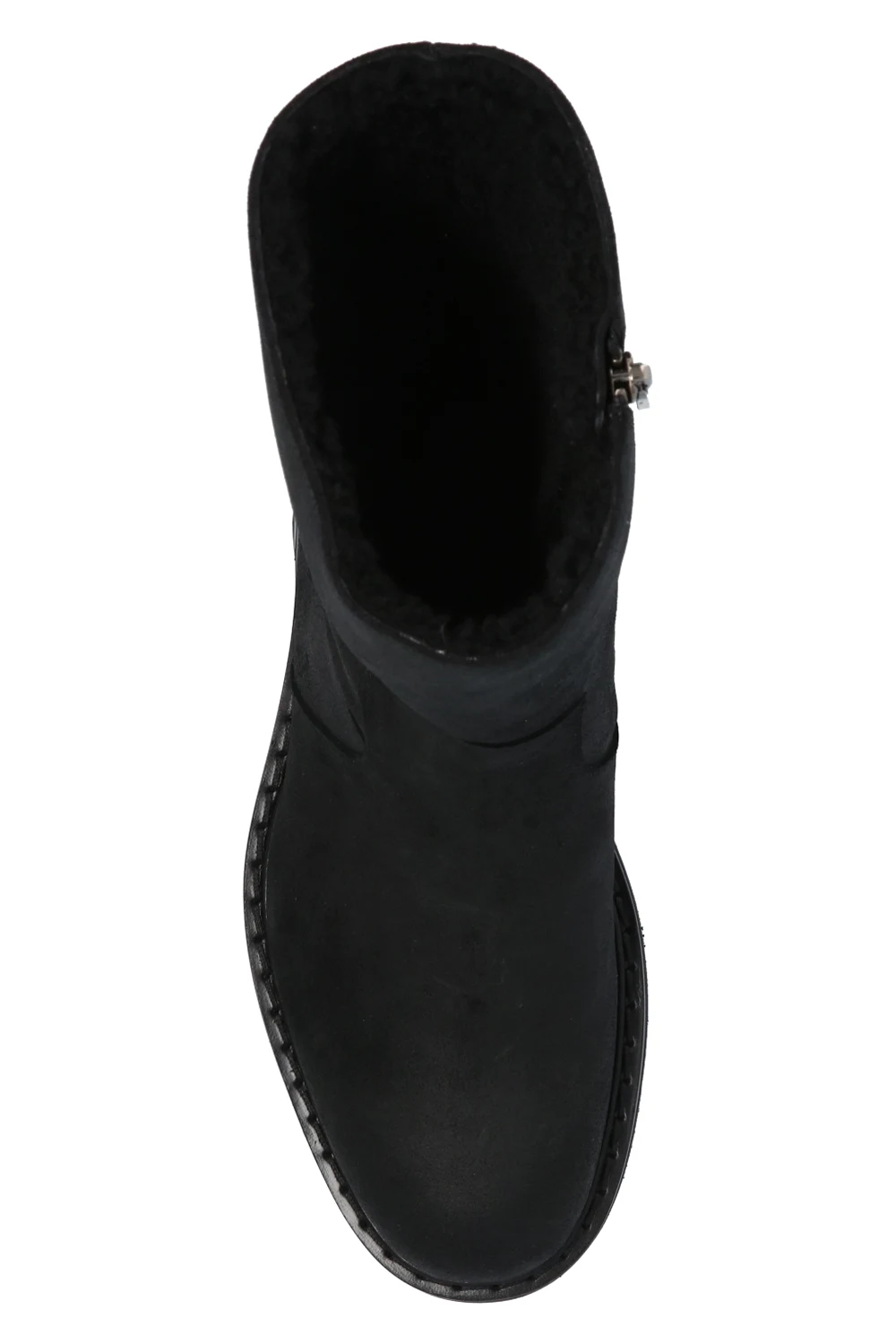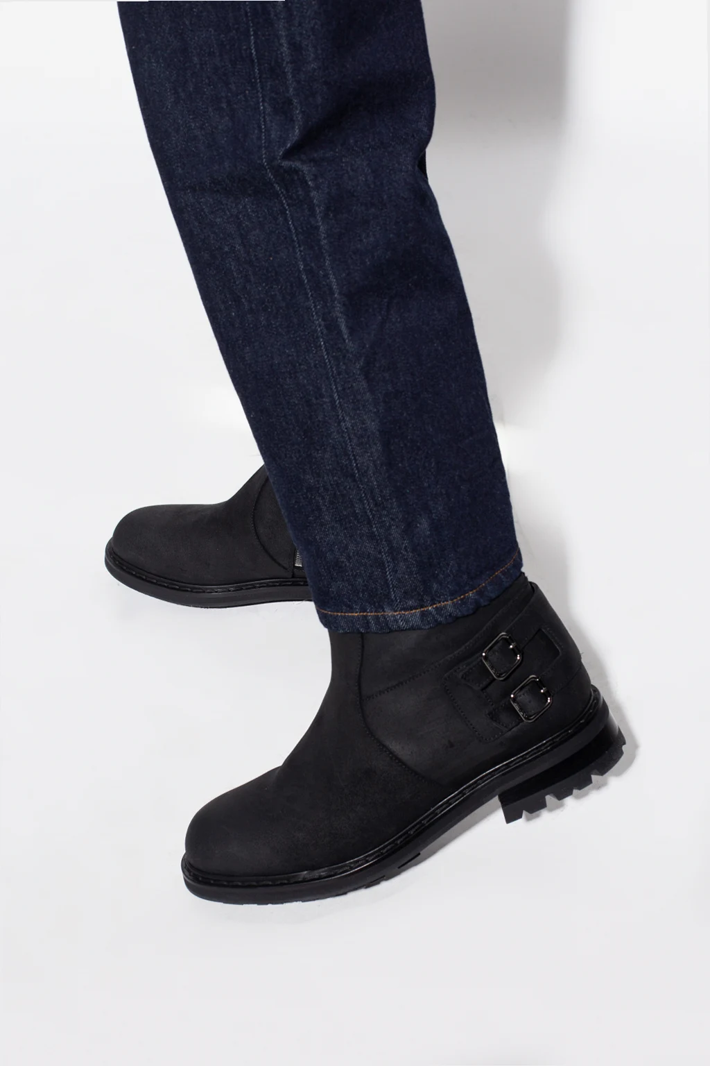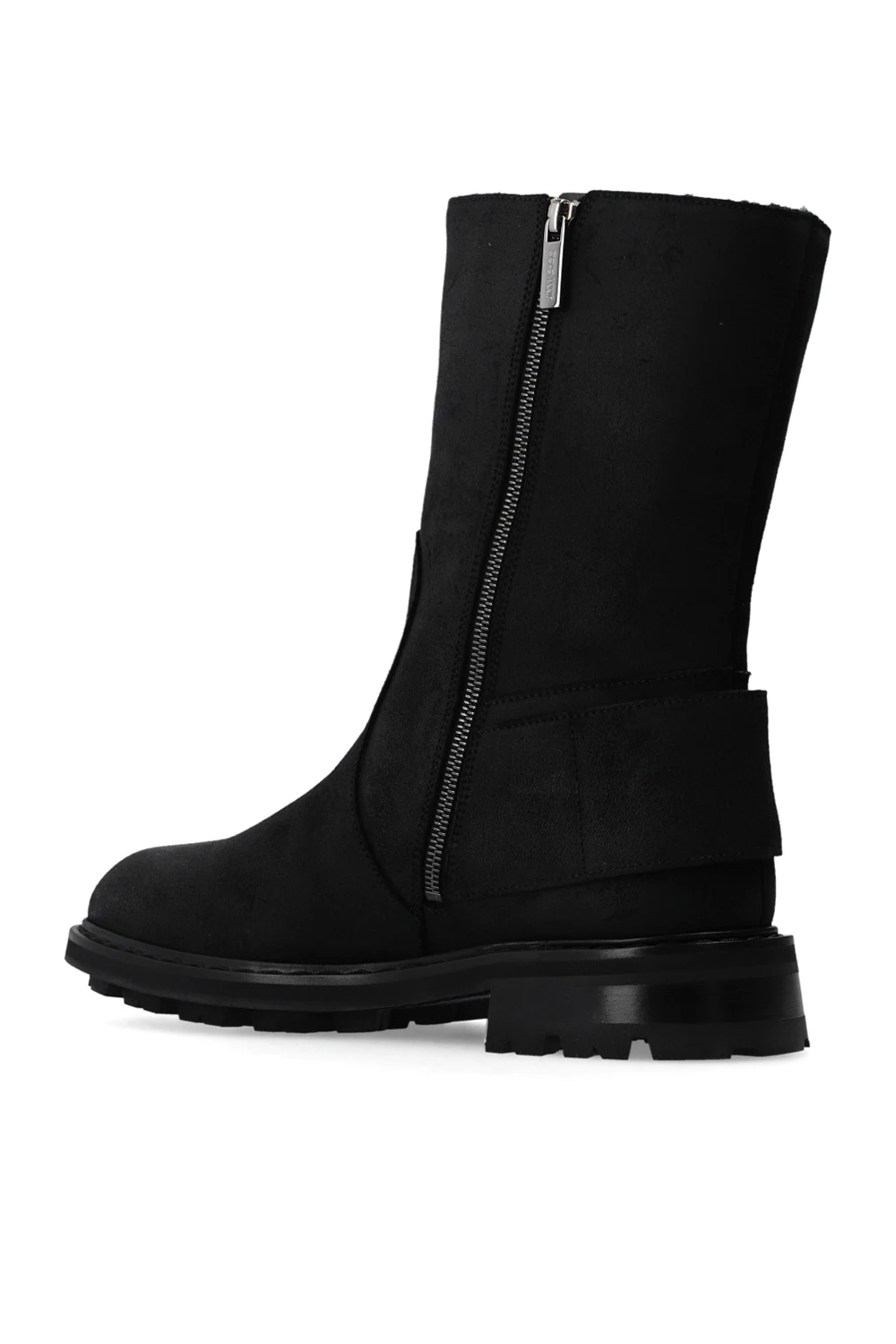 Czarne, ocieplane botki ‘Roscoe’ Jimmy Choo. Wykonane z zamszu. Z boku zapinane na zamek. Z tyłu ozdobione paskiem z dwiema klamrami w kolorze srebrnym. Czarna, gumowa podeszwa.