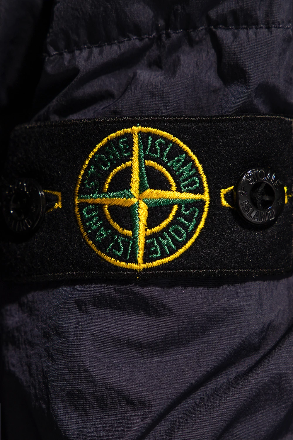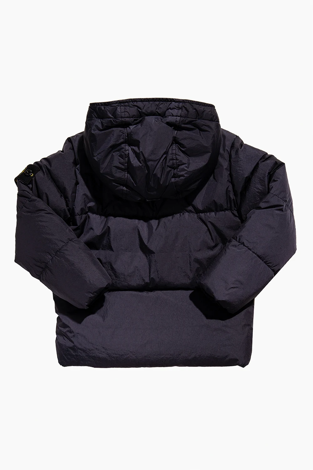 Granatowa kurtka z kapturem Stone Island Kids. Wypełniona kaczym puchem oraz pierzem. Zapinana na zamek. Na rękawie odpinana naszywka z logo. Z przodu dwie kieszenie zapinane na zamek.