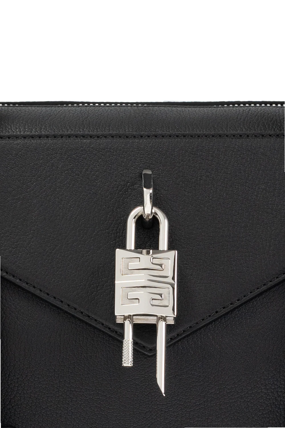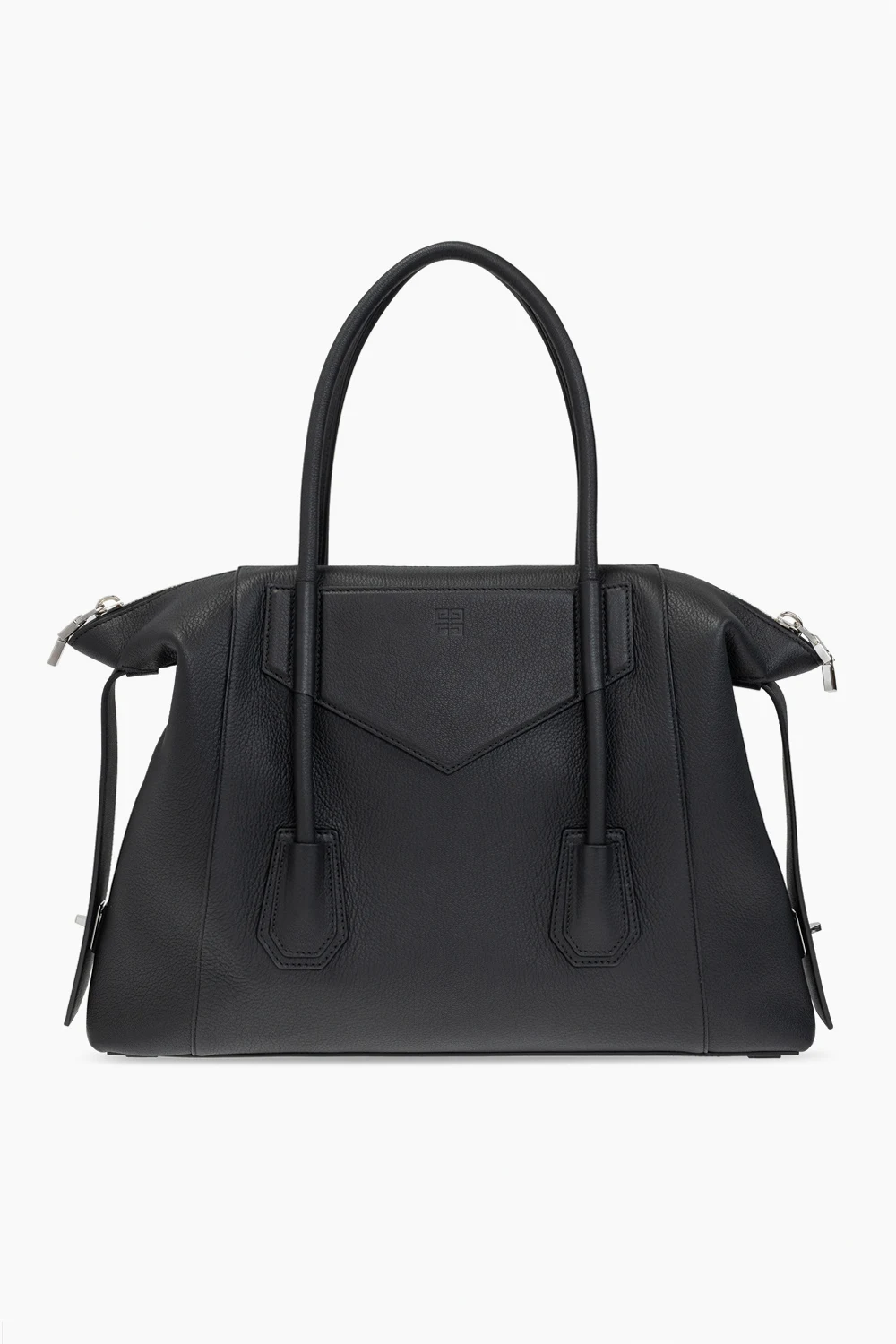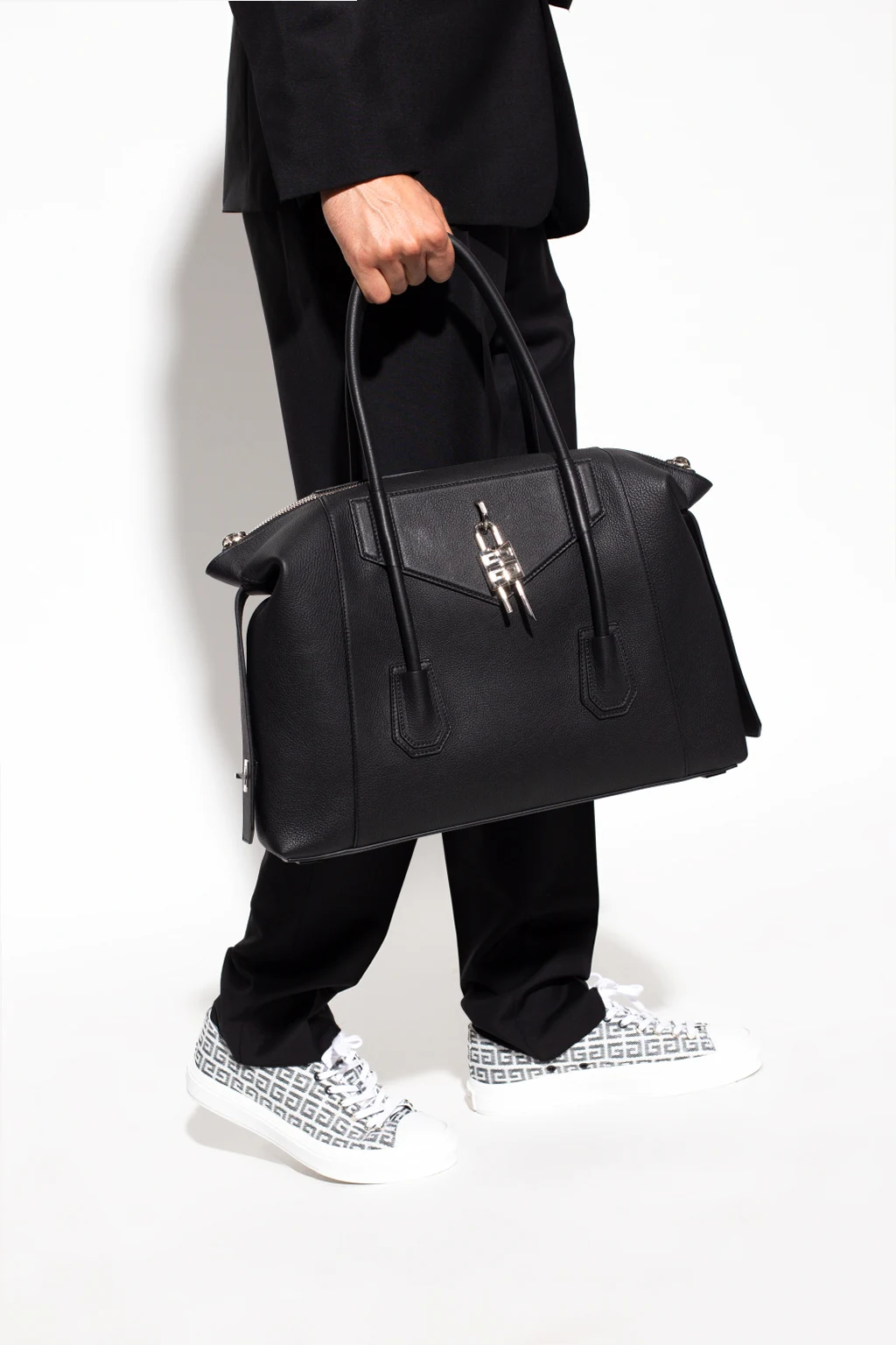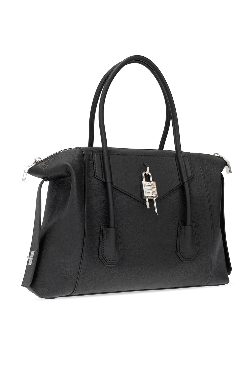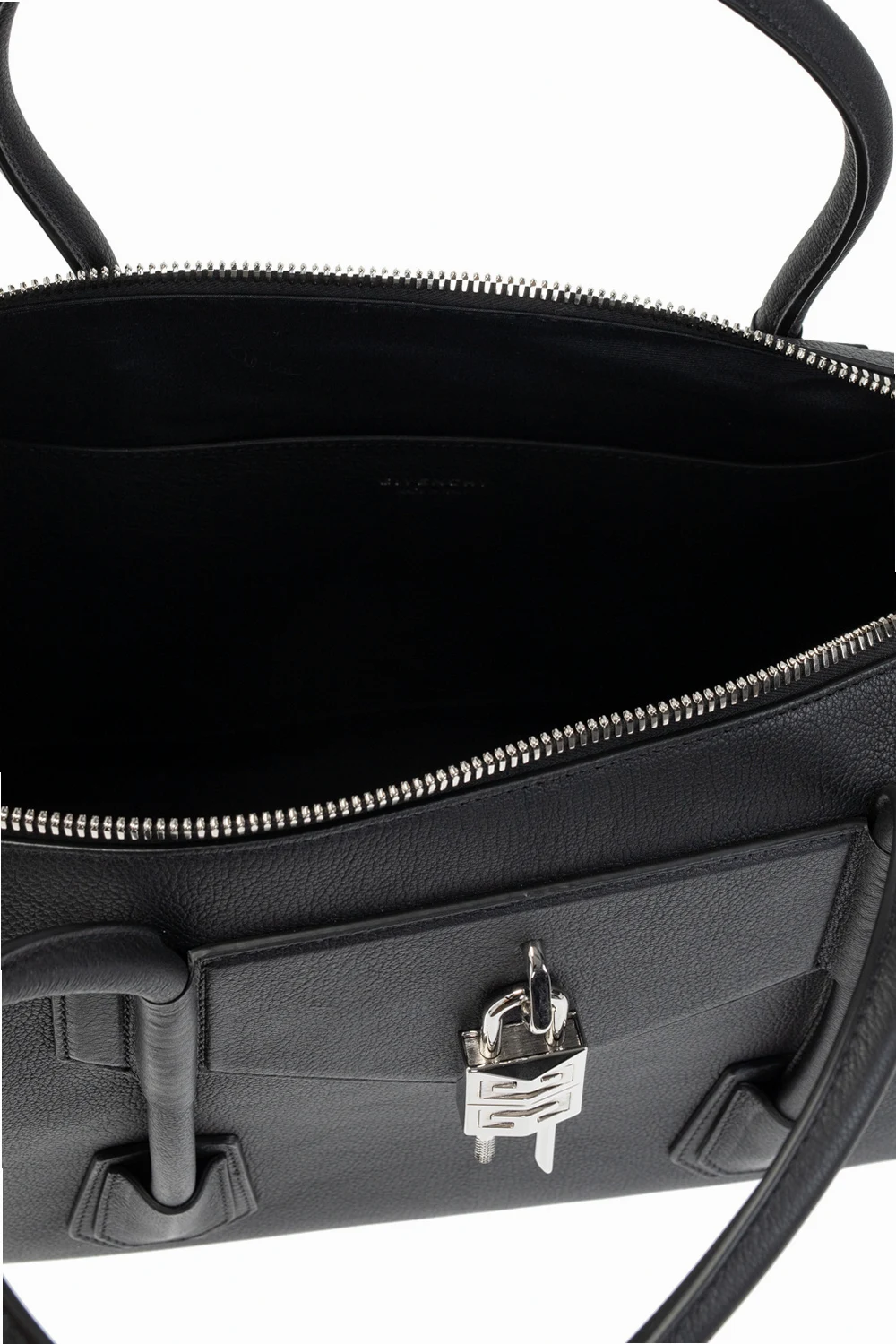 Czarna torba podręczna, model ‘Antigona Soft Medium’ Givenchy. Wykonana z koziej skóry. Zamykana na zamek. Dekoracyjna wstawka z kłódką. Dwie półokrągłe rączki. Wewnątrz komora i wsuwana kieszeń. Metalowe wykończenie w kolorze srebrnym.