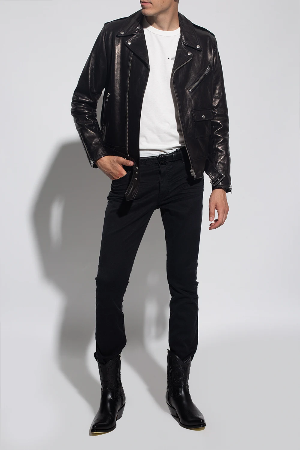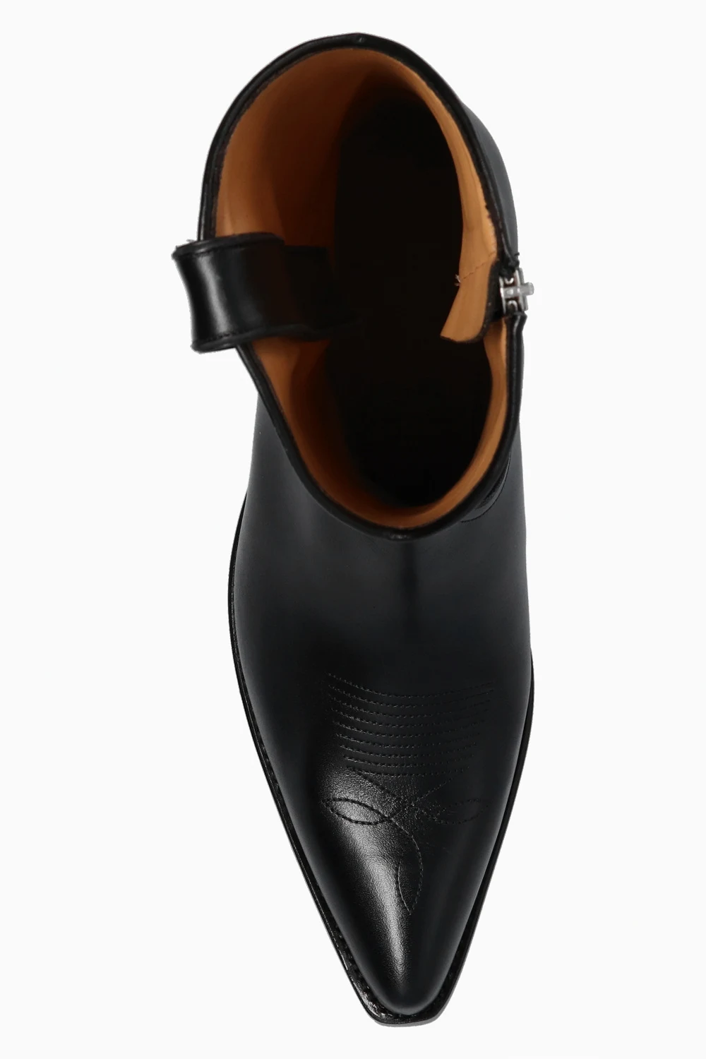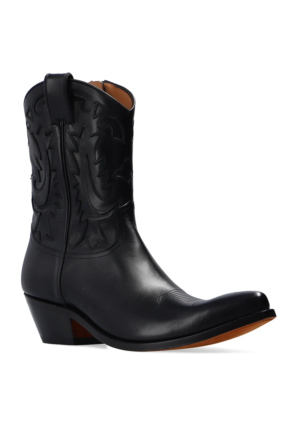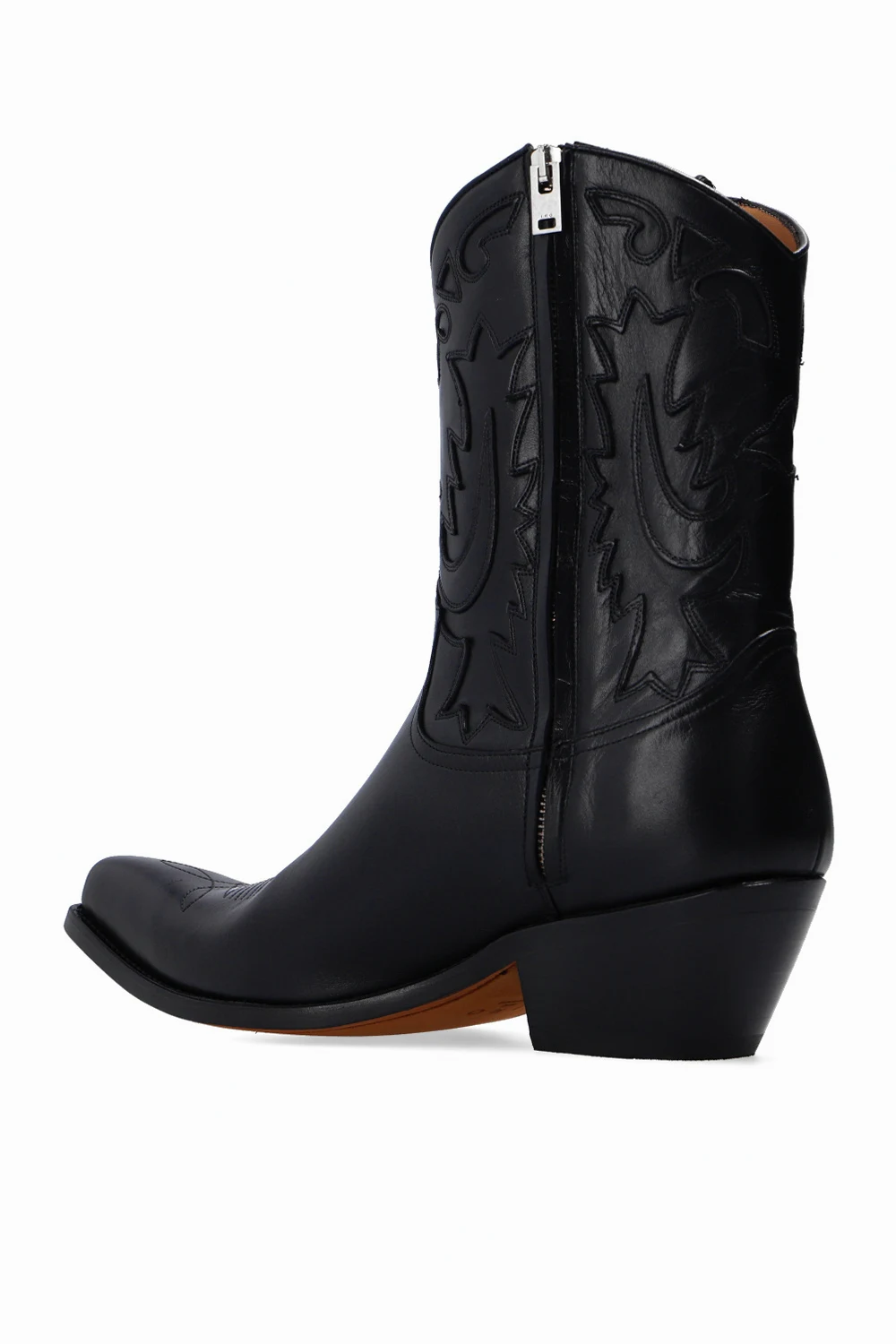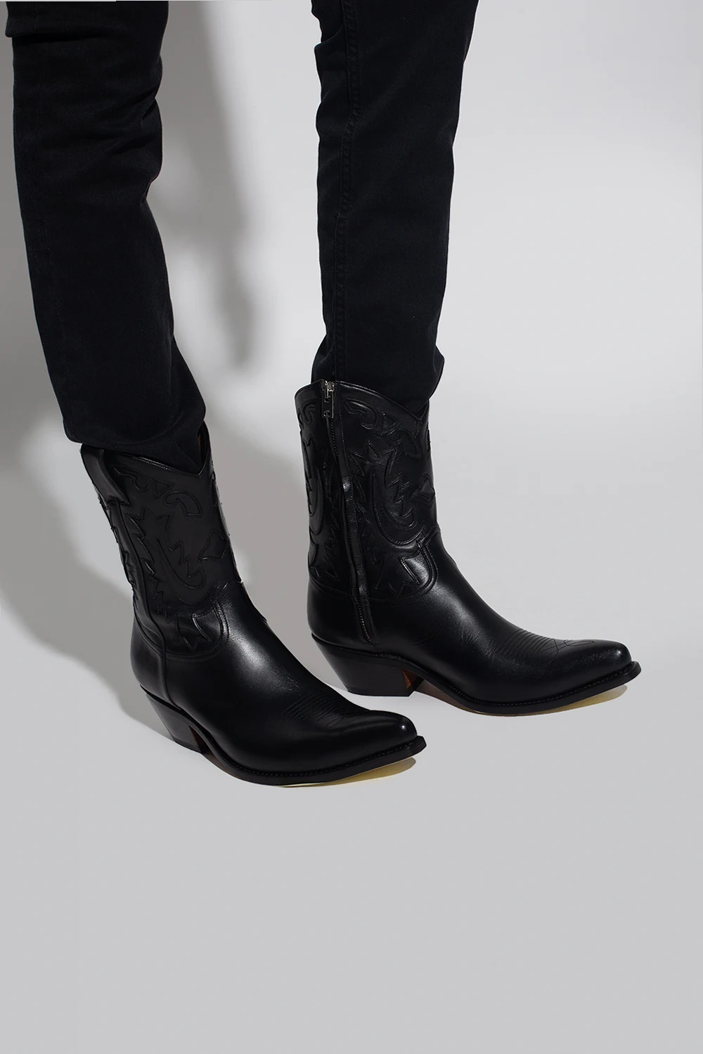 Czarne kowbojki, model 'Jhones' Iro. Wykonane ze skóry. Zapinane na z boku na zamek. Ozdobione przeszyciami w kolorze czarnym. Nosek w szpic. Brązowa, skórzana podeszwa.