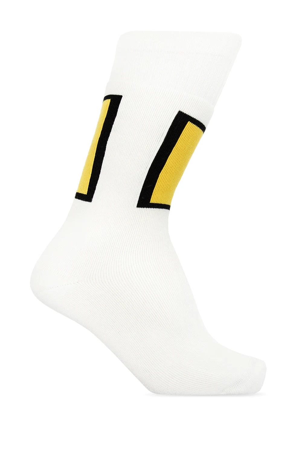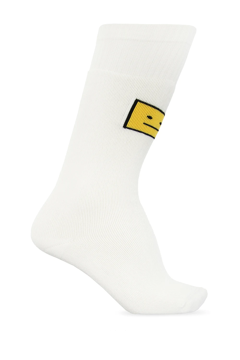 Białe skarpety Acne Studios. Wykonane z bawełny. Ozdobione wzorem z logo w kolorze żółto-czarnym. Wykończone ściągaczem.