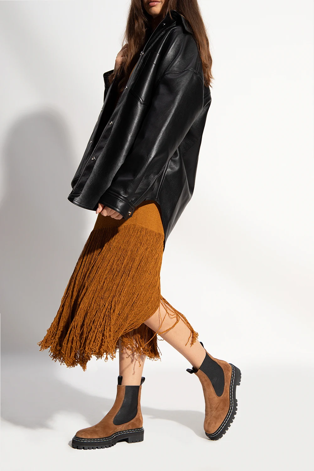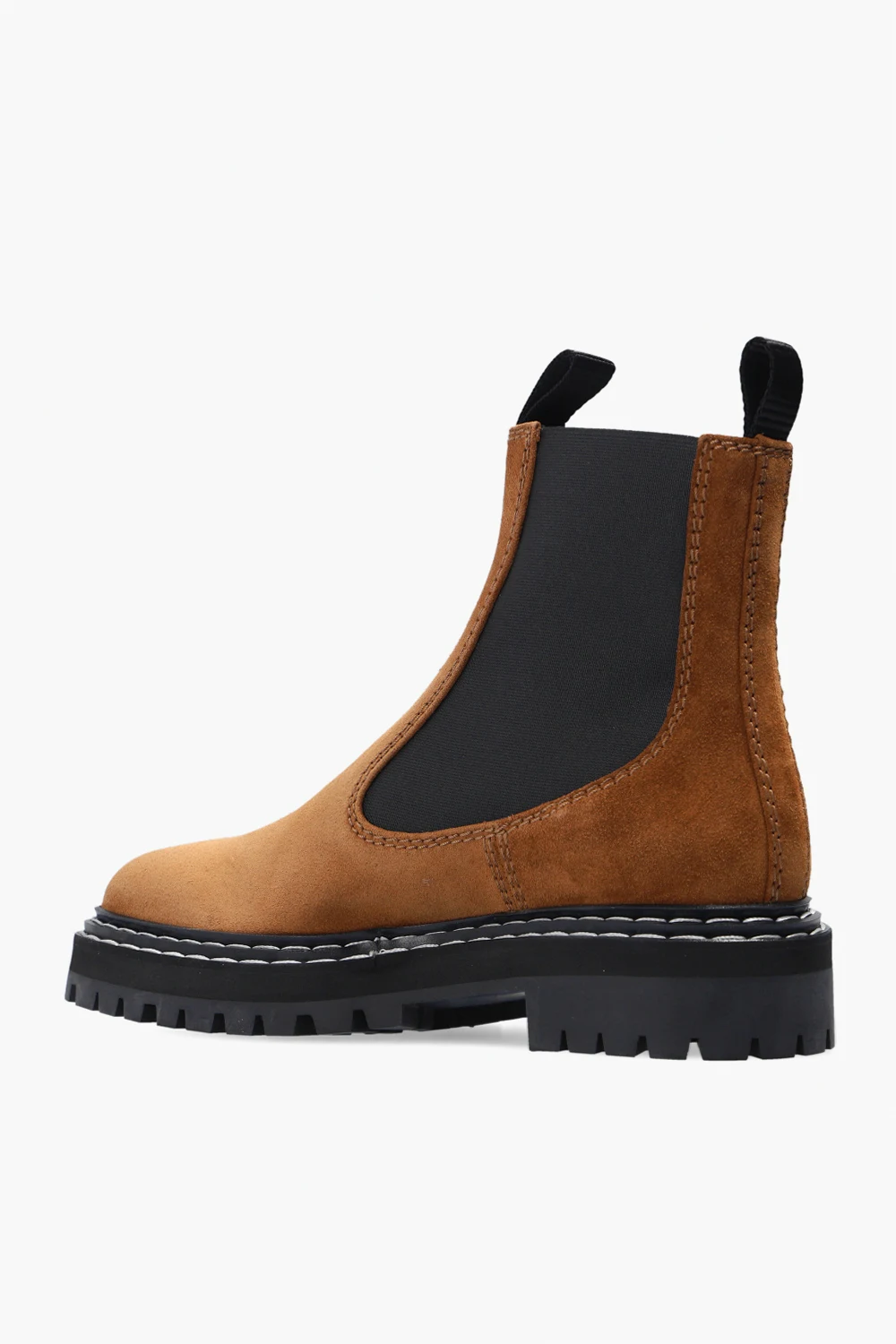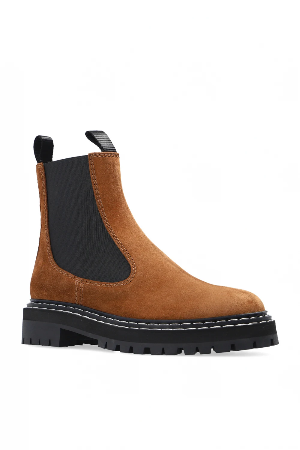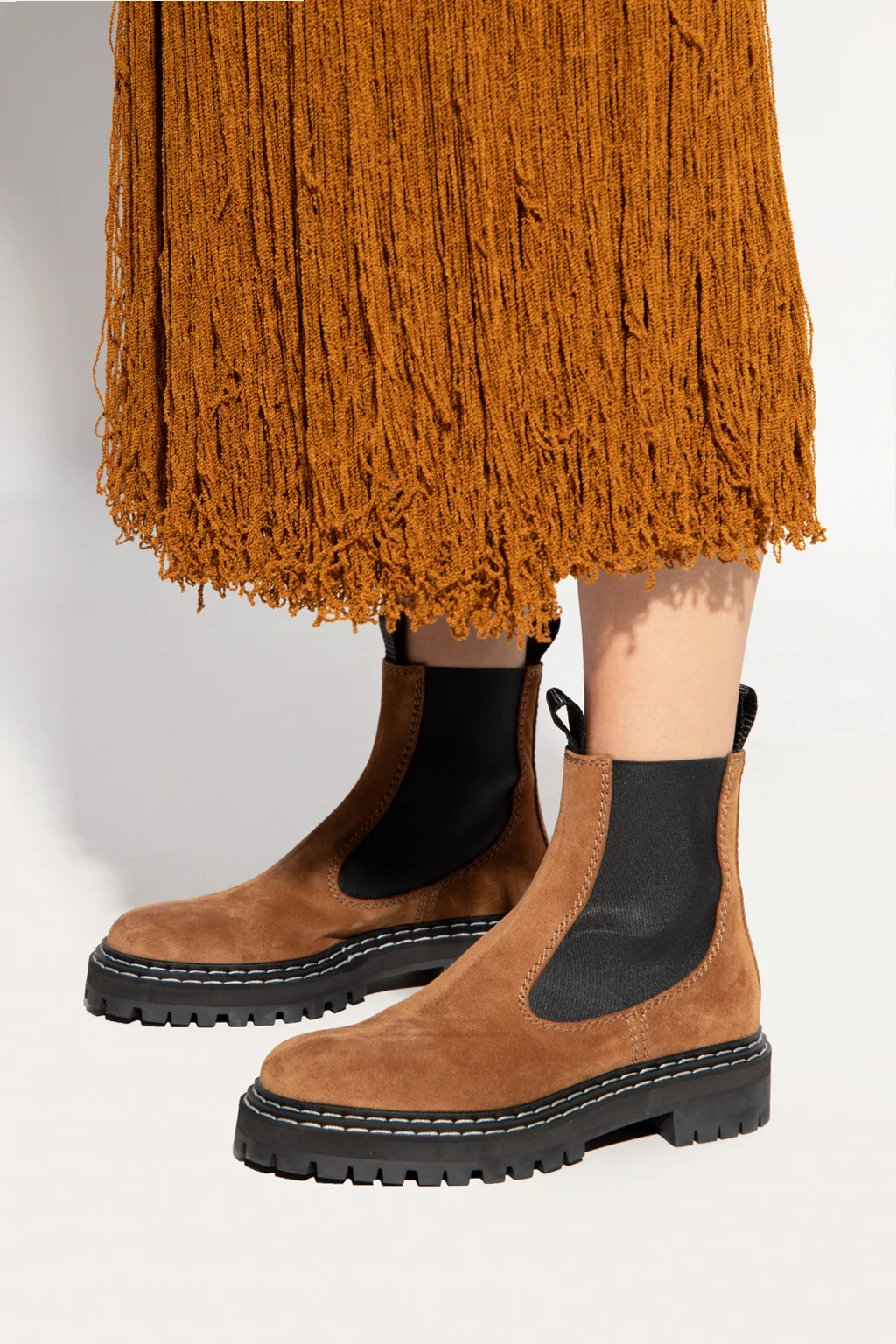 Brązowe botki Proenza Schouler. Wykonane z cielęcego zamszu. Po bokach ściągacze w kolorze czarnym. Czarna, gumowa podeszwa z białymi przeszyciami.