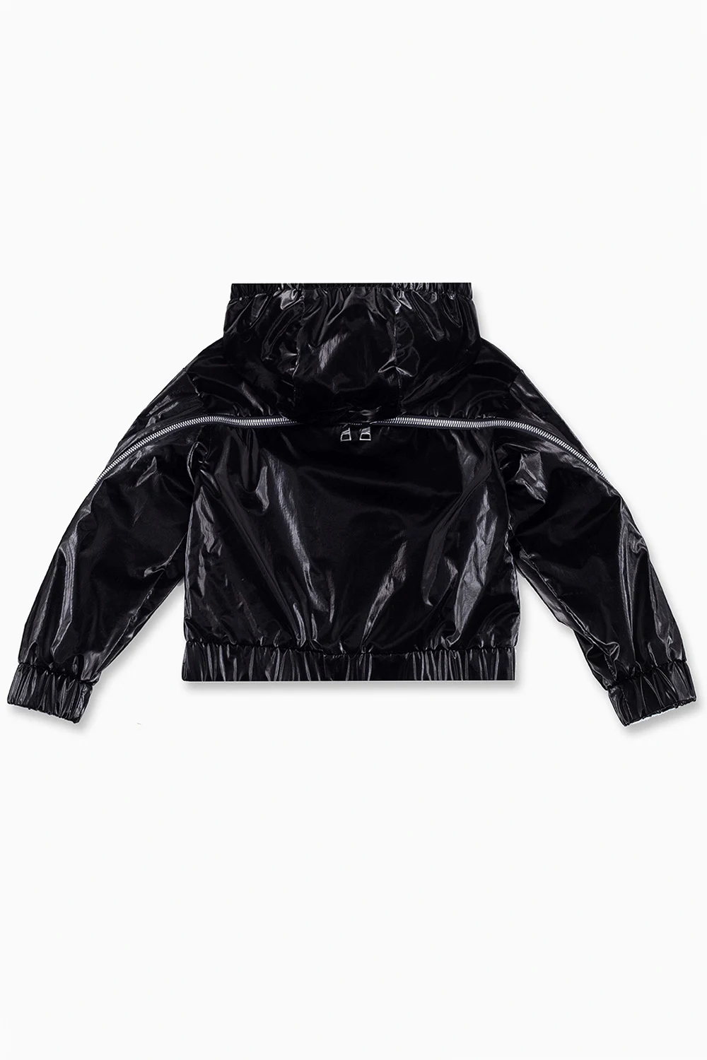Czarna kurtka z kapturem, model ‘Brienne’ Moncler Enfant. Wykonana z połyskującego materiału. Z przodu zapinana na zamek. Z tyłu dekoracyjny, dwubiegunowy zamek i nadrukowane logo w kolorze kremowym. Kaptur, długie rękawy i dół zakończone ściągaczem.