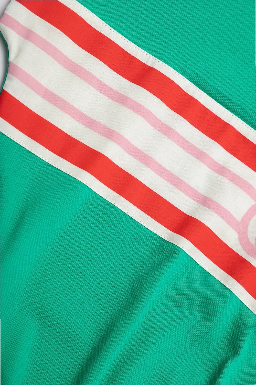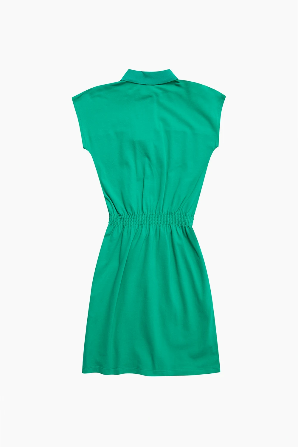 Zielona sukienka z kołnierzem polo Gucci Kids. Wykonana z bawełny. W pasie wszyta elastyczna guma. Przód ozdobiony naszytym pasem z logo w kolorze kremowo-czerwono-różowym. Krótkie rękawy.