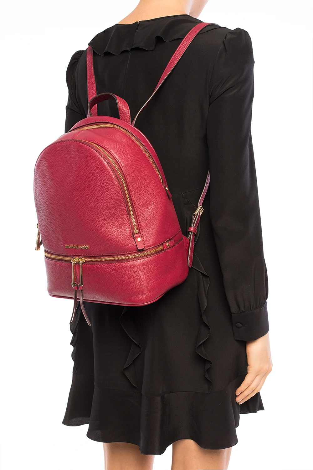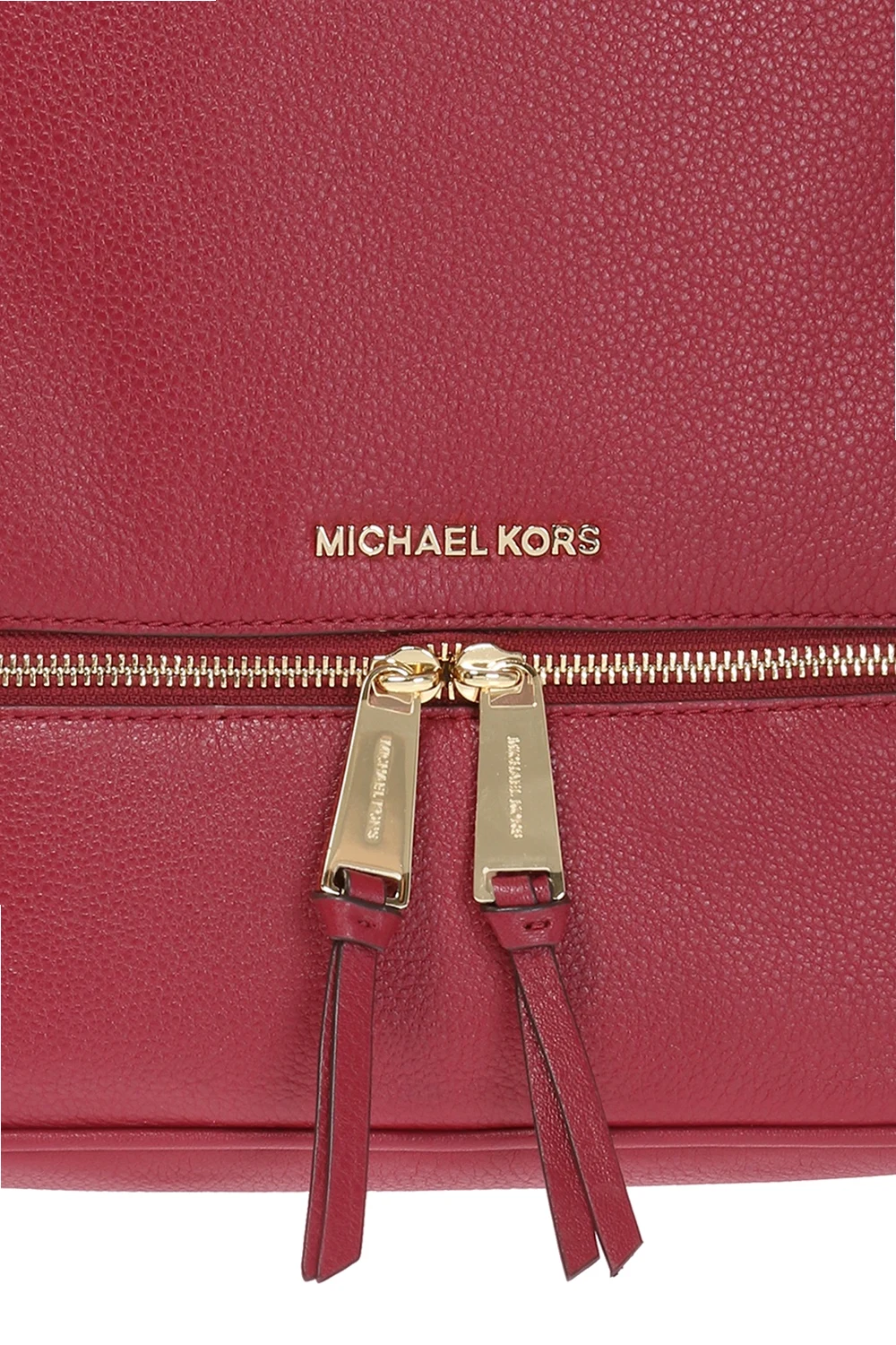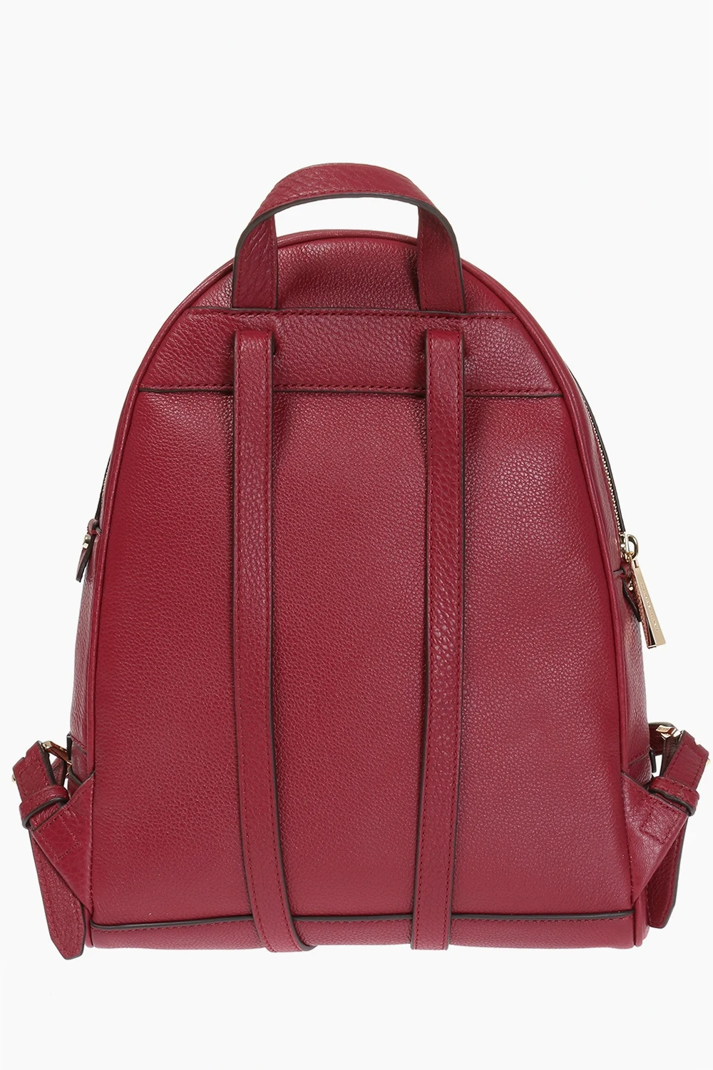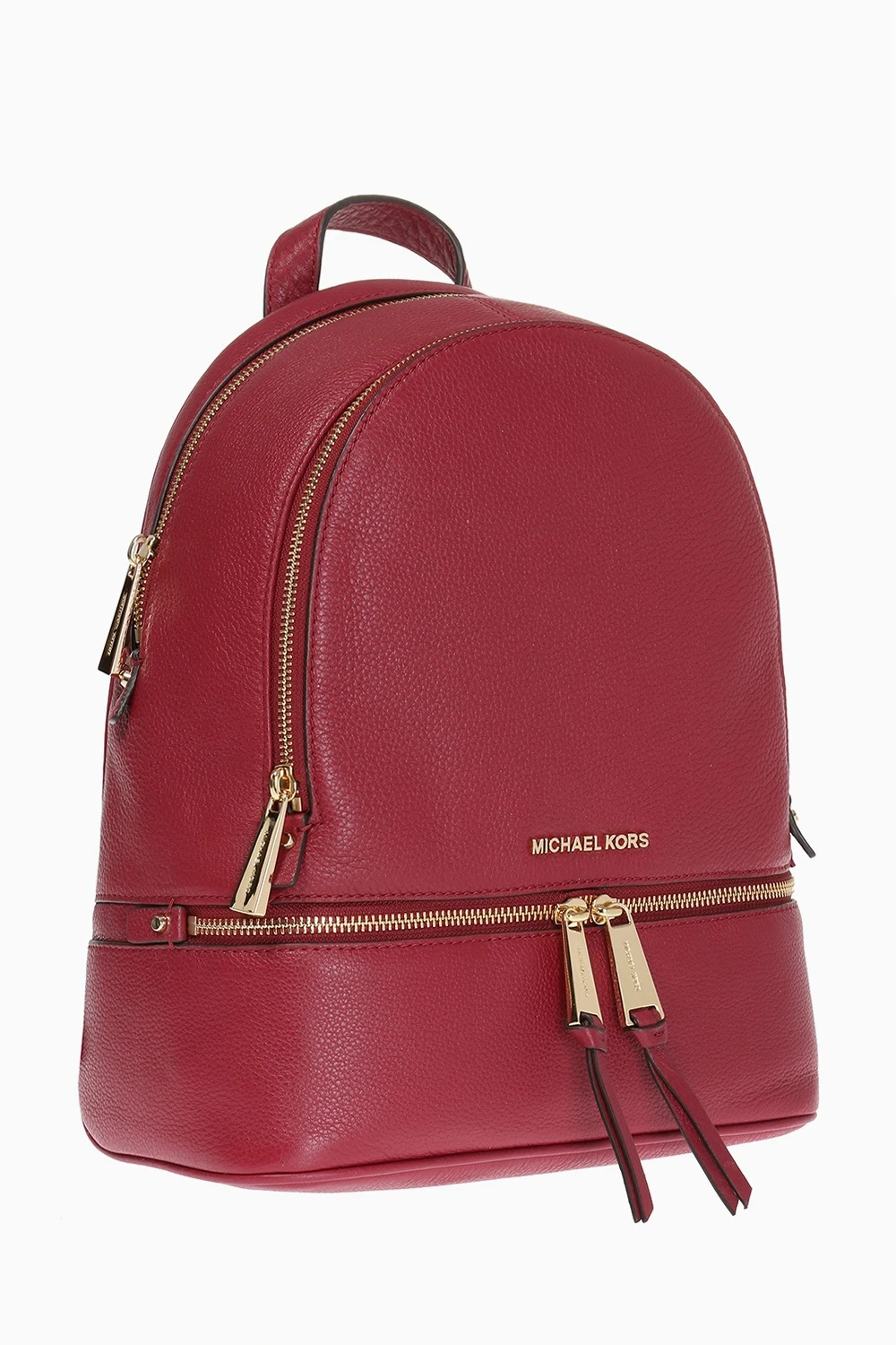 Bordowy plecak, model 'Rhea-Zip' Michael Michael Kors. Wykonany ze skóry Saffiano. Dwie oddzielne komory zamykane na zamek. Z przodu metalowe logo oraz kieszeń zamykana na dwubiegunowy zamek. Półokrągła rączka. Regulowane szelki. Wewnątrz kieszeń zamykana na zamek oraz trzy wsuwane. Metalowe elementy w kolorze złotym.