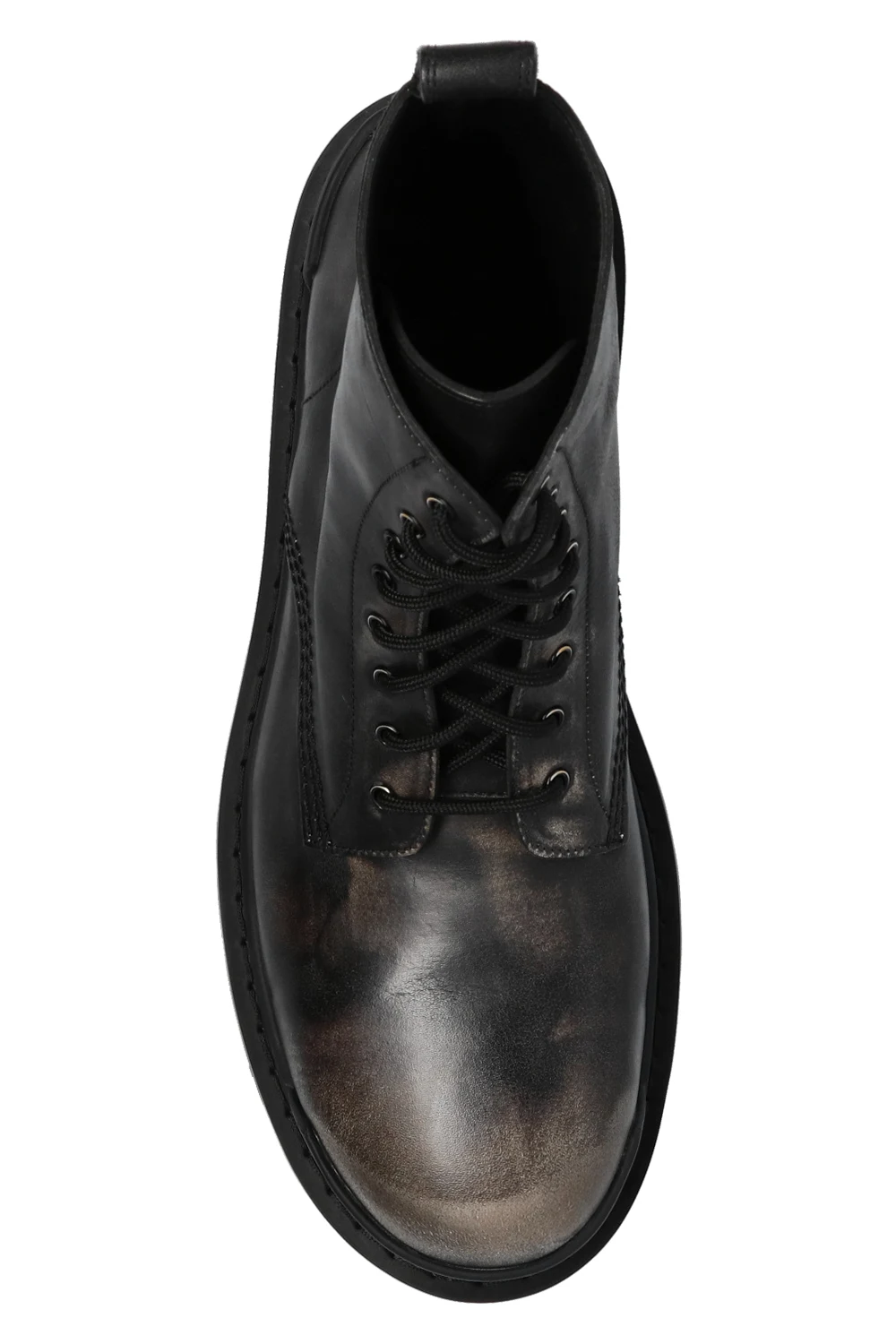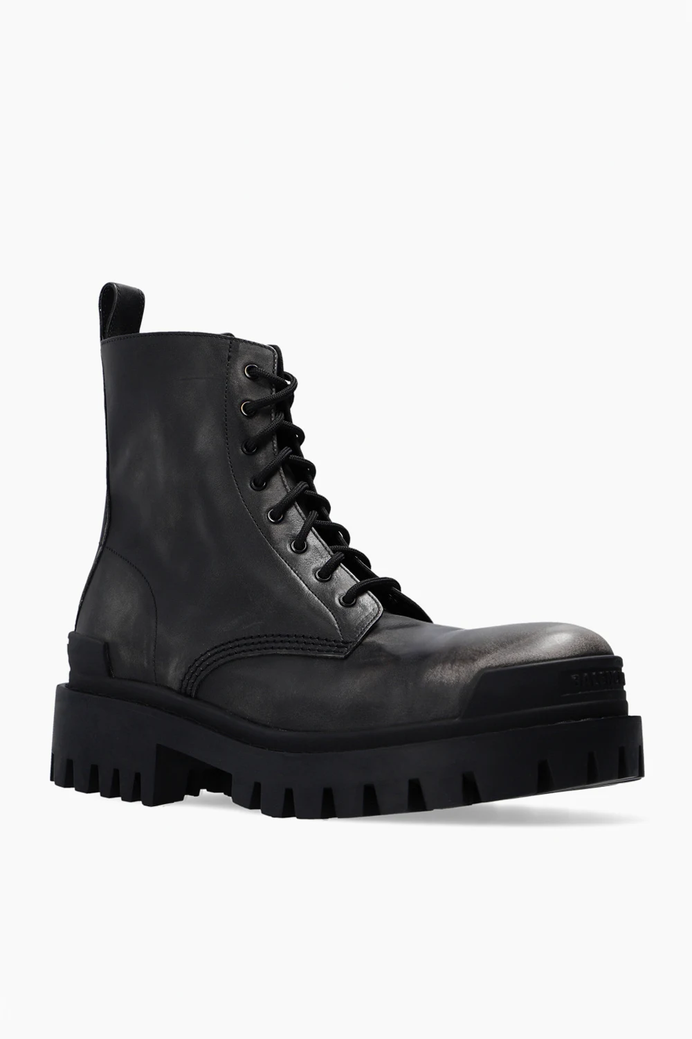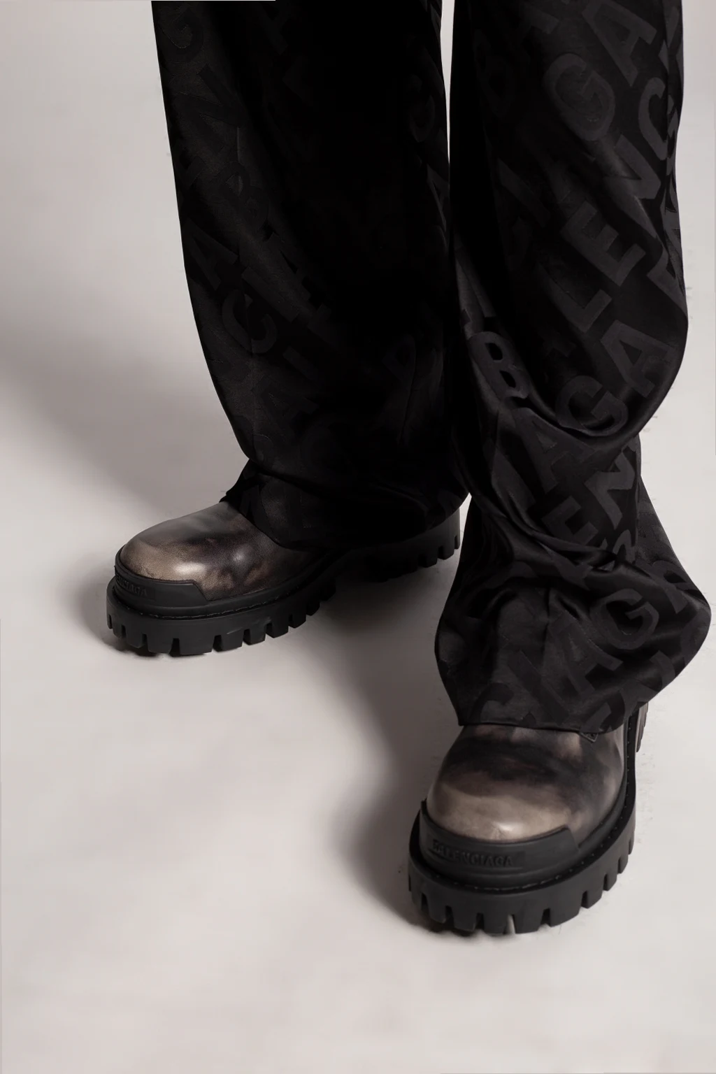 Czarno-szare, sznurowane botki z efektem znoszenia Balenciaga. Z przodu oraz z tyłu wypukłe logo. Czarna, gumowa podeszwa.