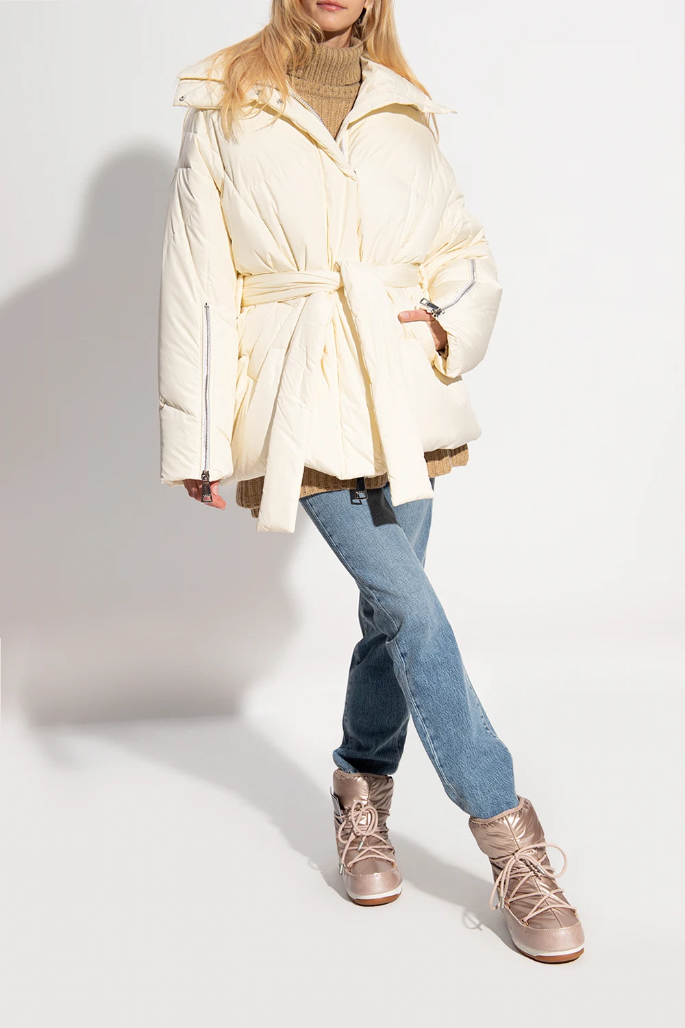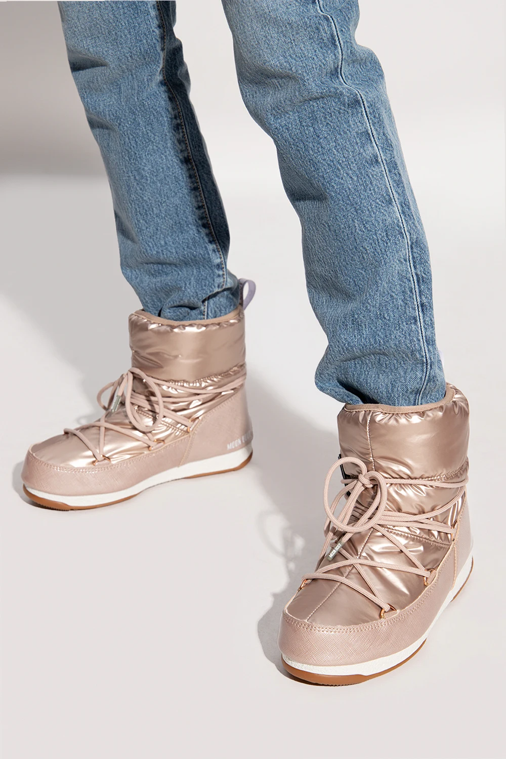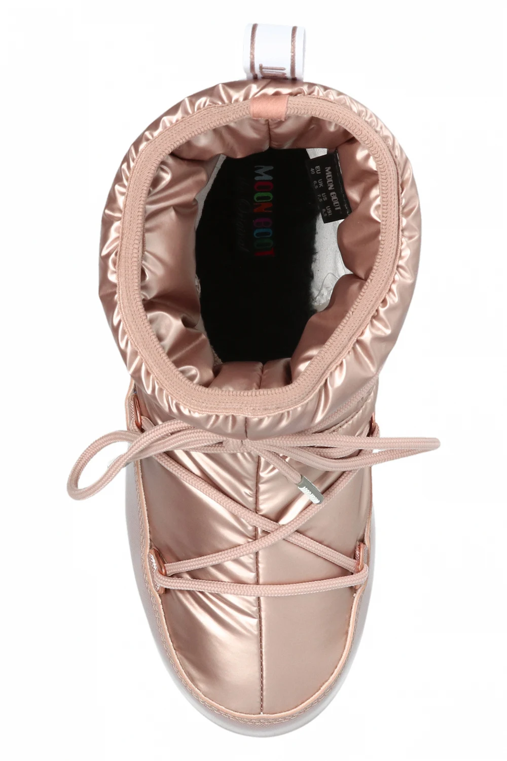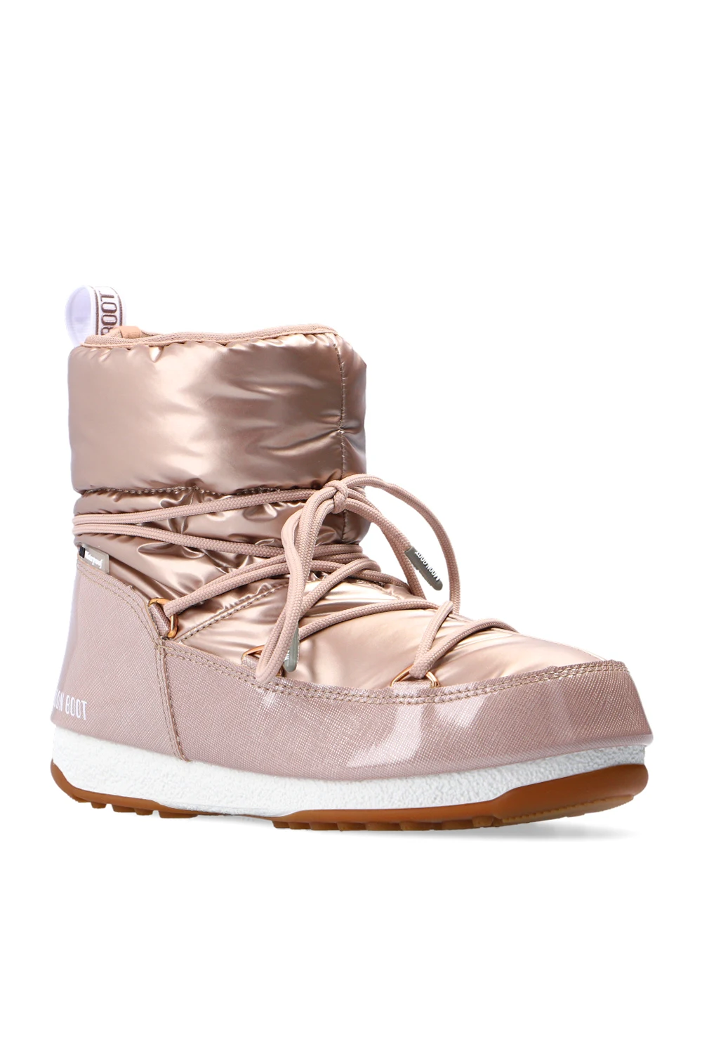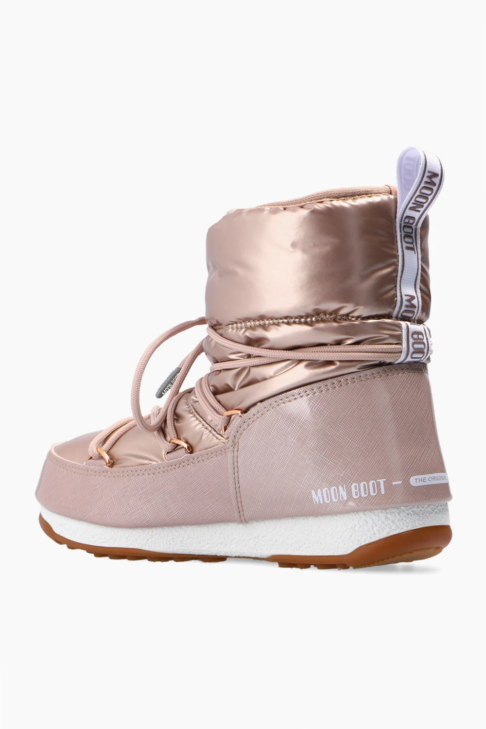 Sznurowane śniegowce w kolorze złoto-beżowym, model ‘Low’ Moon Boot. Ozdobione wyszytym i nadrukowanym logo. Wykonane z materiału imitującego skórę. Wykończone materiałem. Beżowo-biała, gumowa podeszwa. Śniegowce inspirowane specyficznym kształtem i technologią butów dla astronautów. Zaprojektowane w 1969 roku, kiedy pierwszy człowiek stanął na Księżycu.