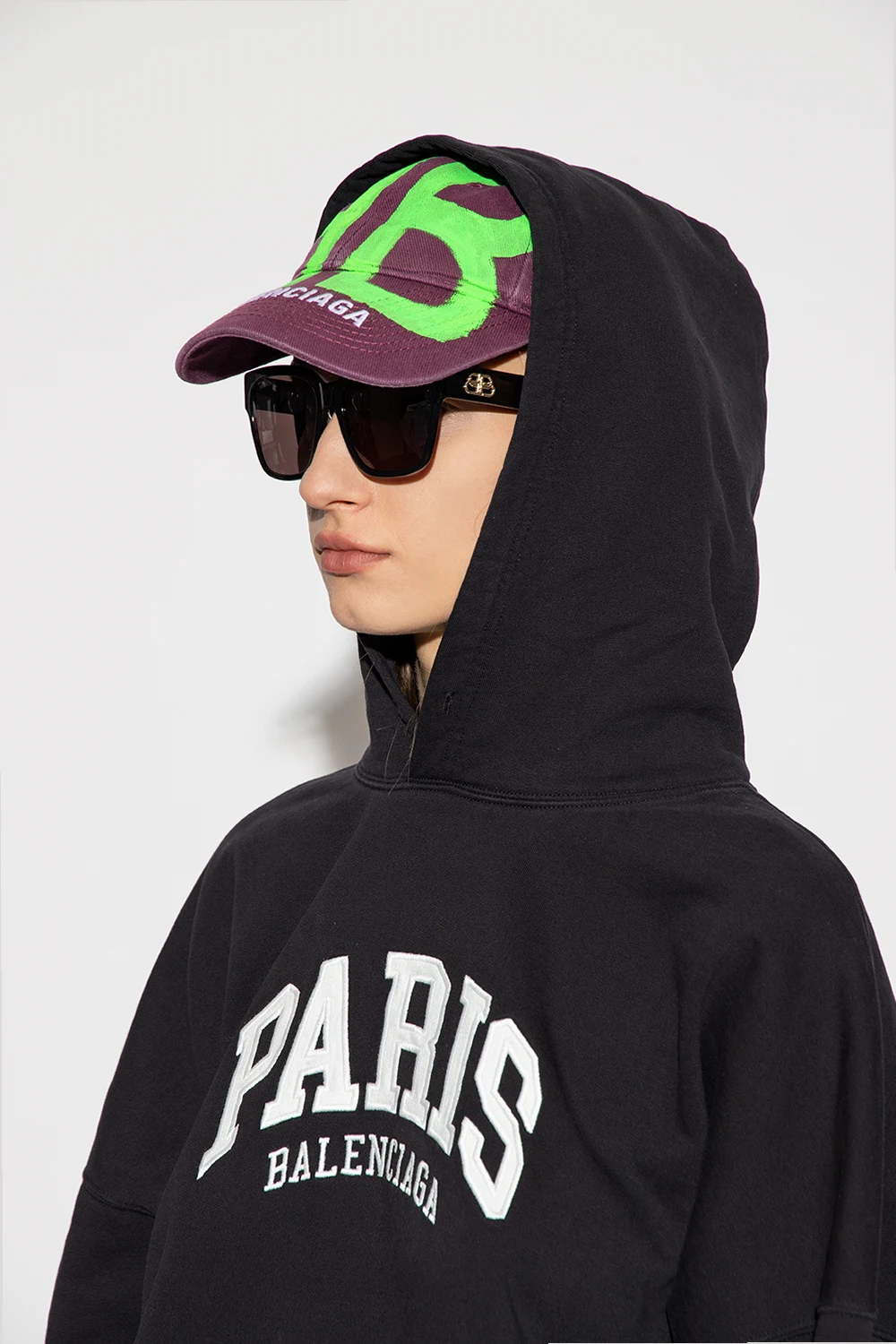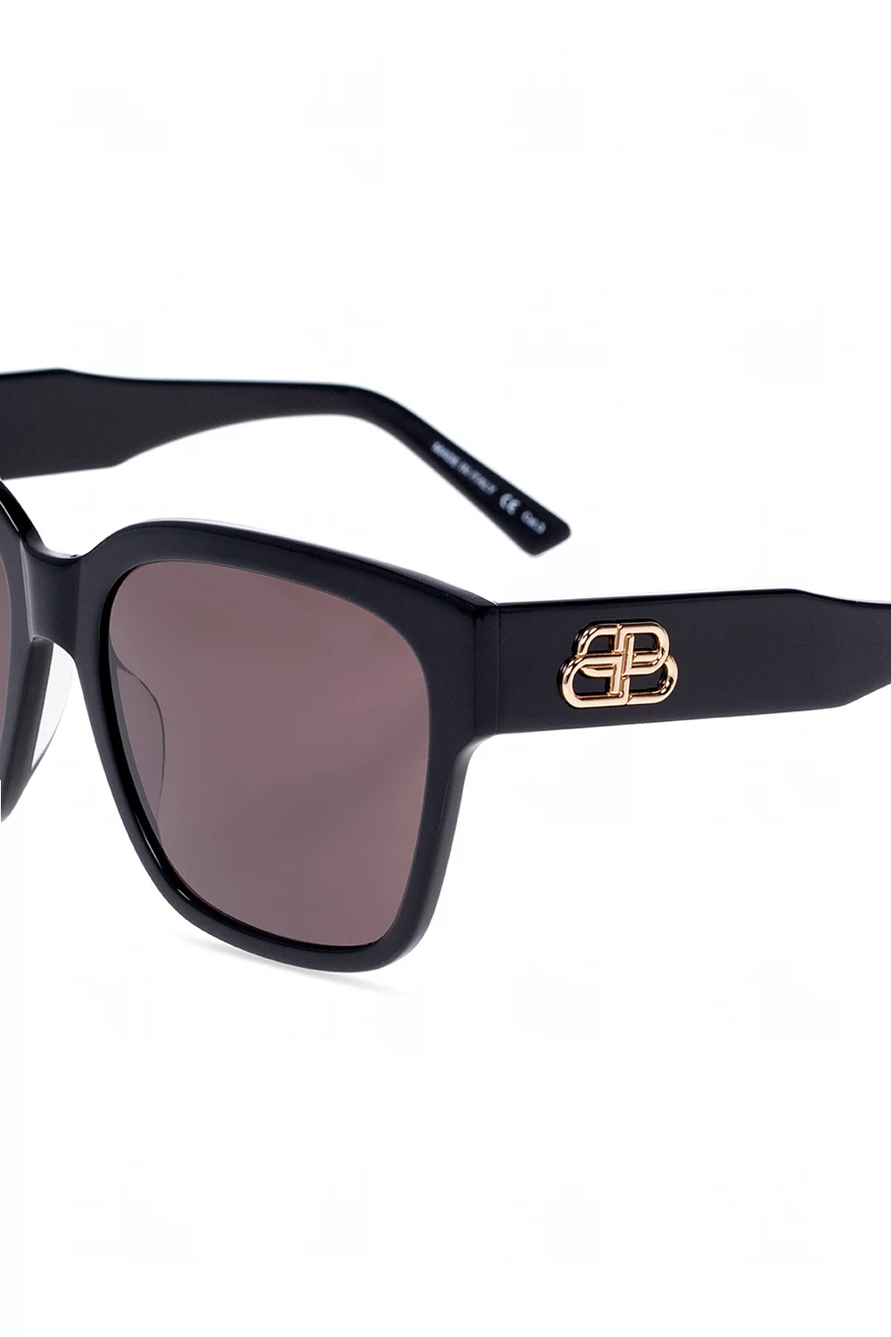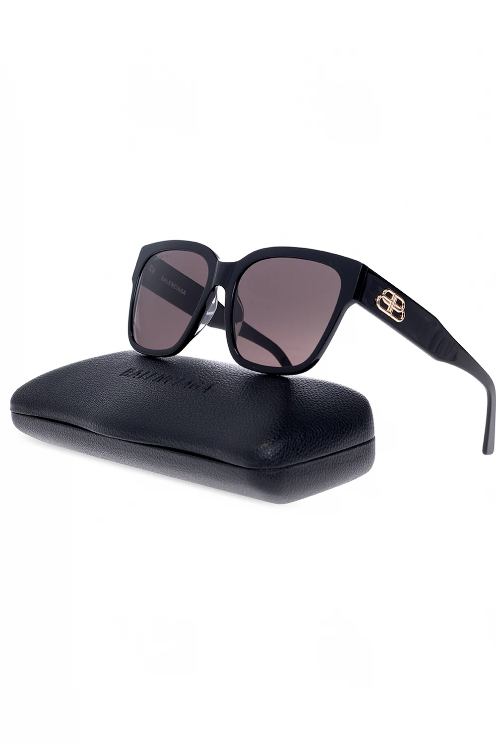 Czarne okulary przeciwsłoneczne, model ‘Flat Square’ Balenciaga. Wykonane z acetatu. Grube, kwadratowe oprawki. Zauszniki ozdobione aplikacją w kolorze złotym. Ciemnoszare soczewki z laserowo wyciętym logo z 100% ochroną UVA/UVB. Dołączone etui.