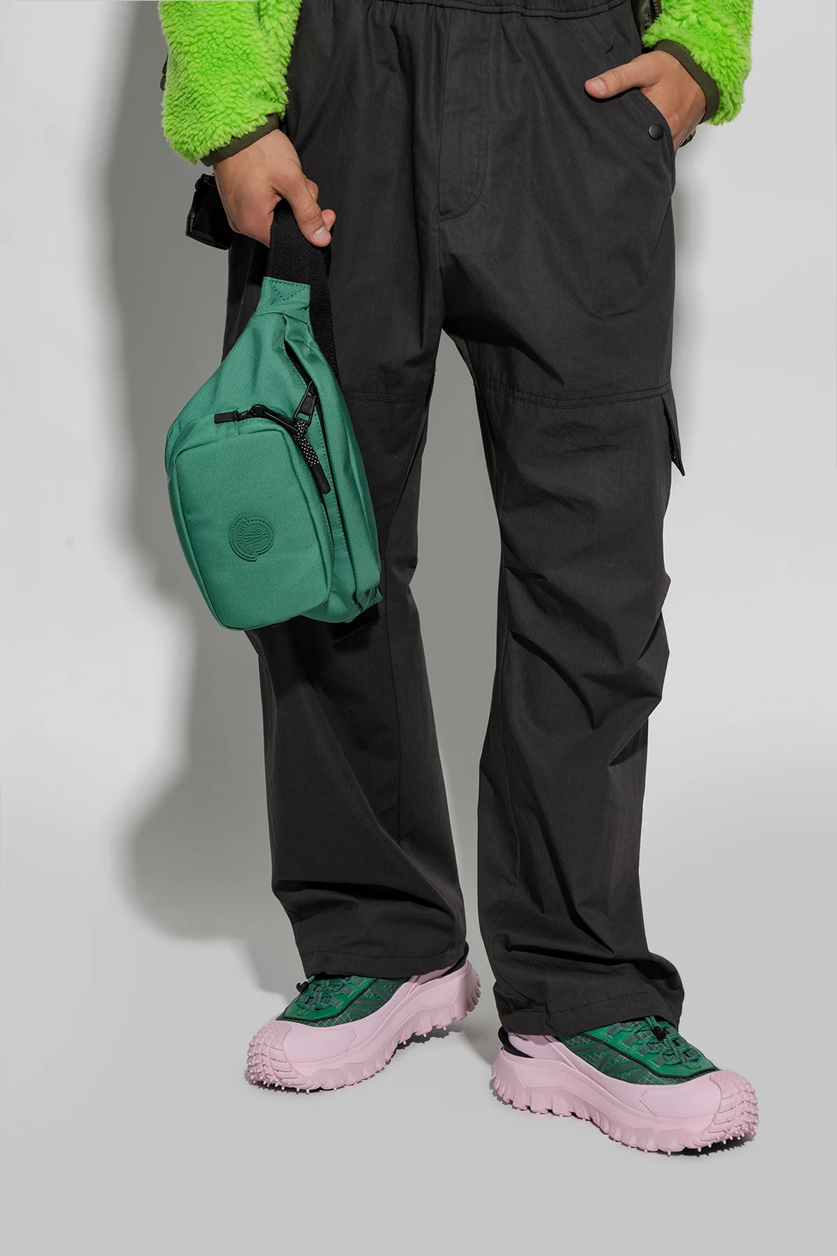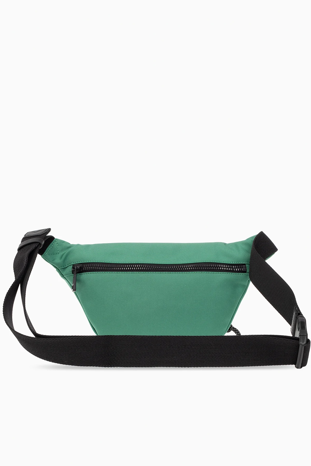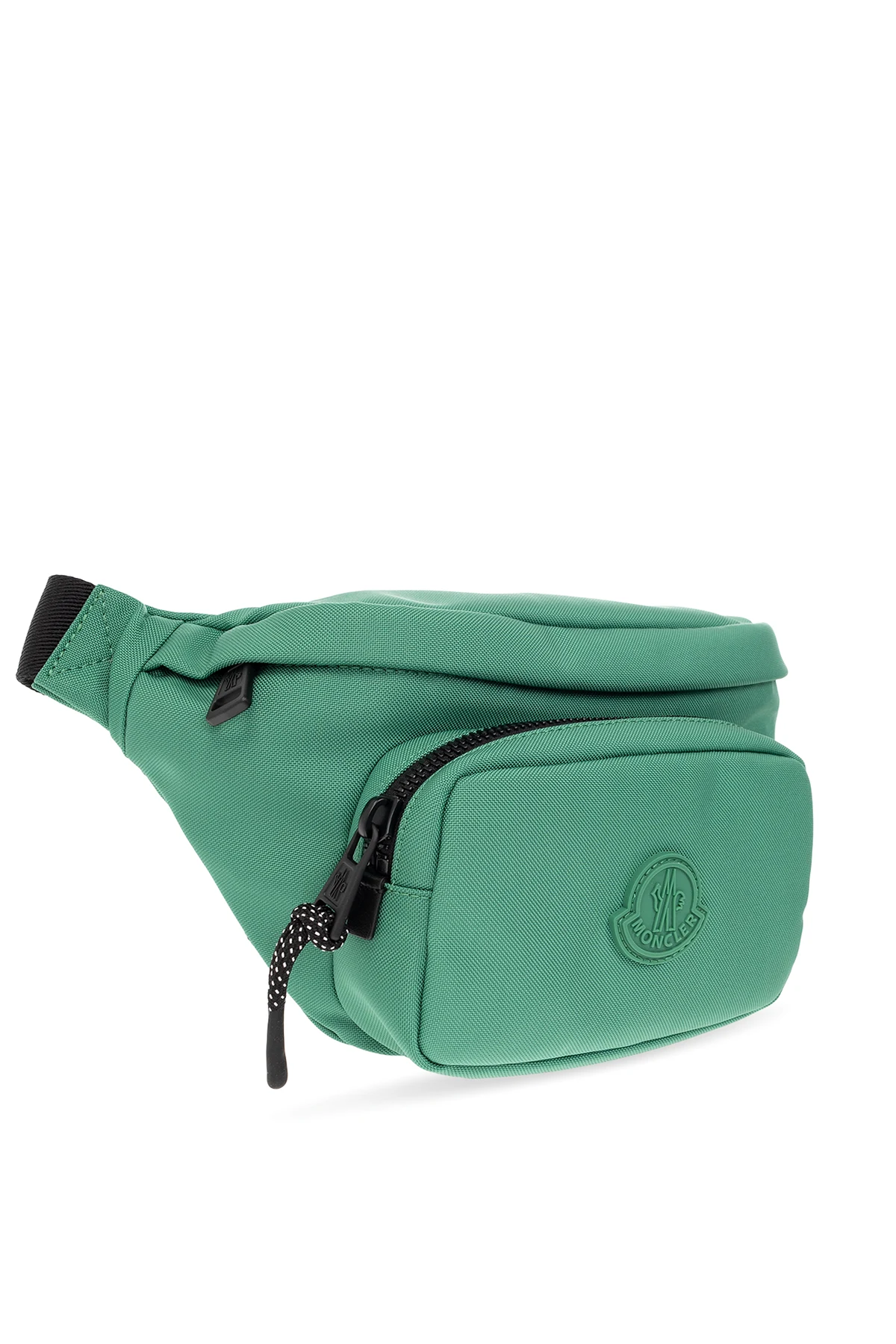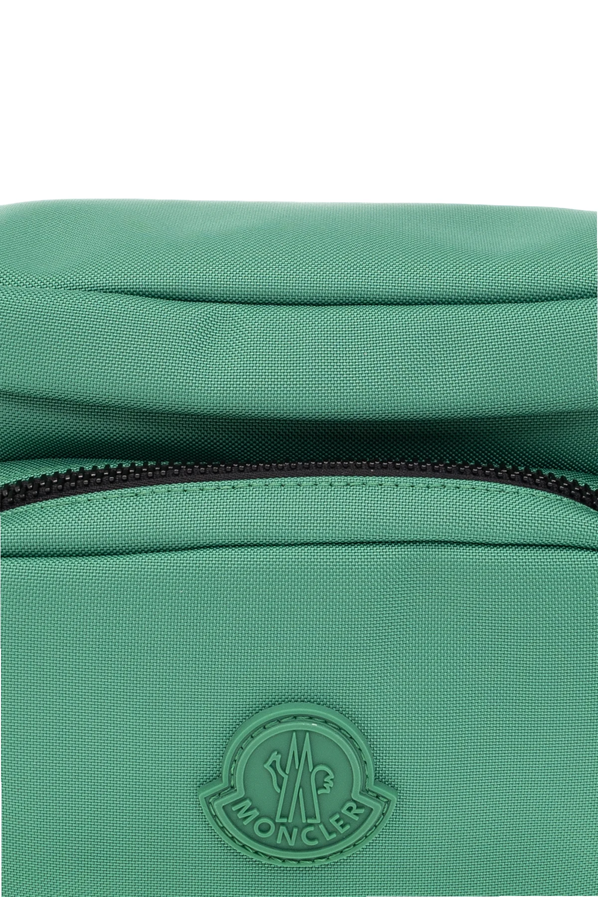Zielona torba na pas Moncler. Zapinana na zamek. Ozdobiona naszywką z logo. Z przodu i z tyłu kieszeń z zapięciem na zamek. Pas biodrowy z możliwością regulacji długości. Wewnątrz komora.