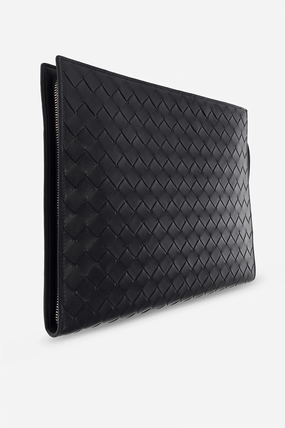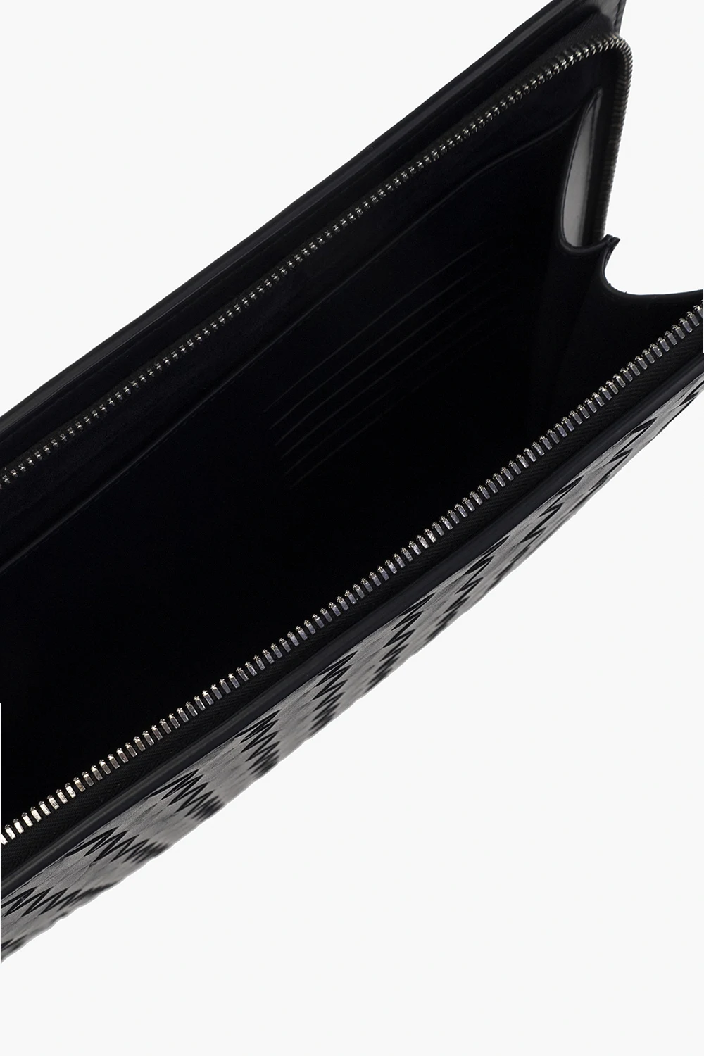 Ciemnogranatowe etui na dokumenty, model ‘Classic Intrecciato Medium’ Bottega Veneta. Wykonane ze skóry cielęcej. Zamykane na zamek. Ozdobione charakterystyczną dla marki plecionką. Z przodu kieszeń zamykana na zamek. Wewnątrz komora, wsuwana kieszeń oraz sześć miejsc na karty. Metalowe wykończenie w kolorze srebrnym.