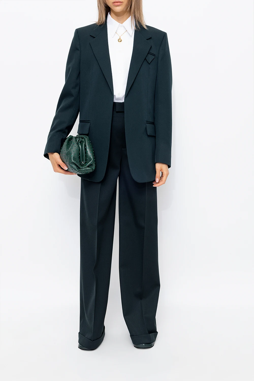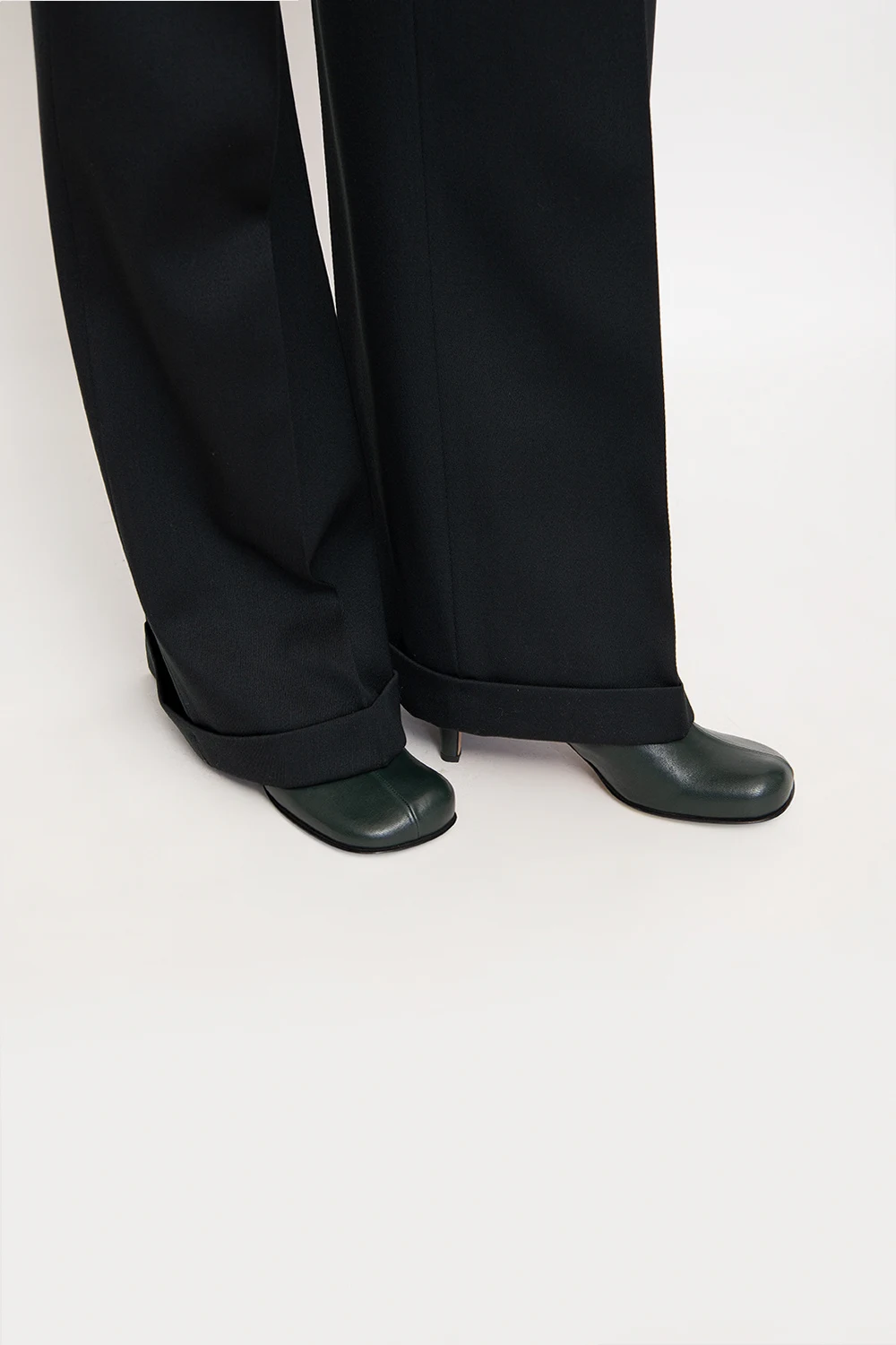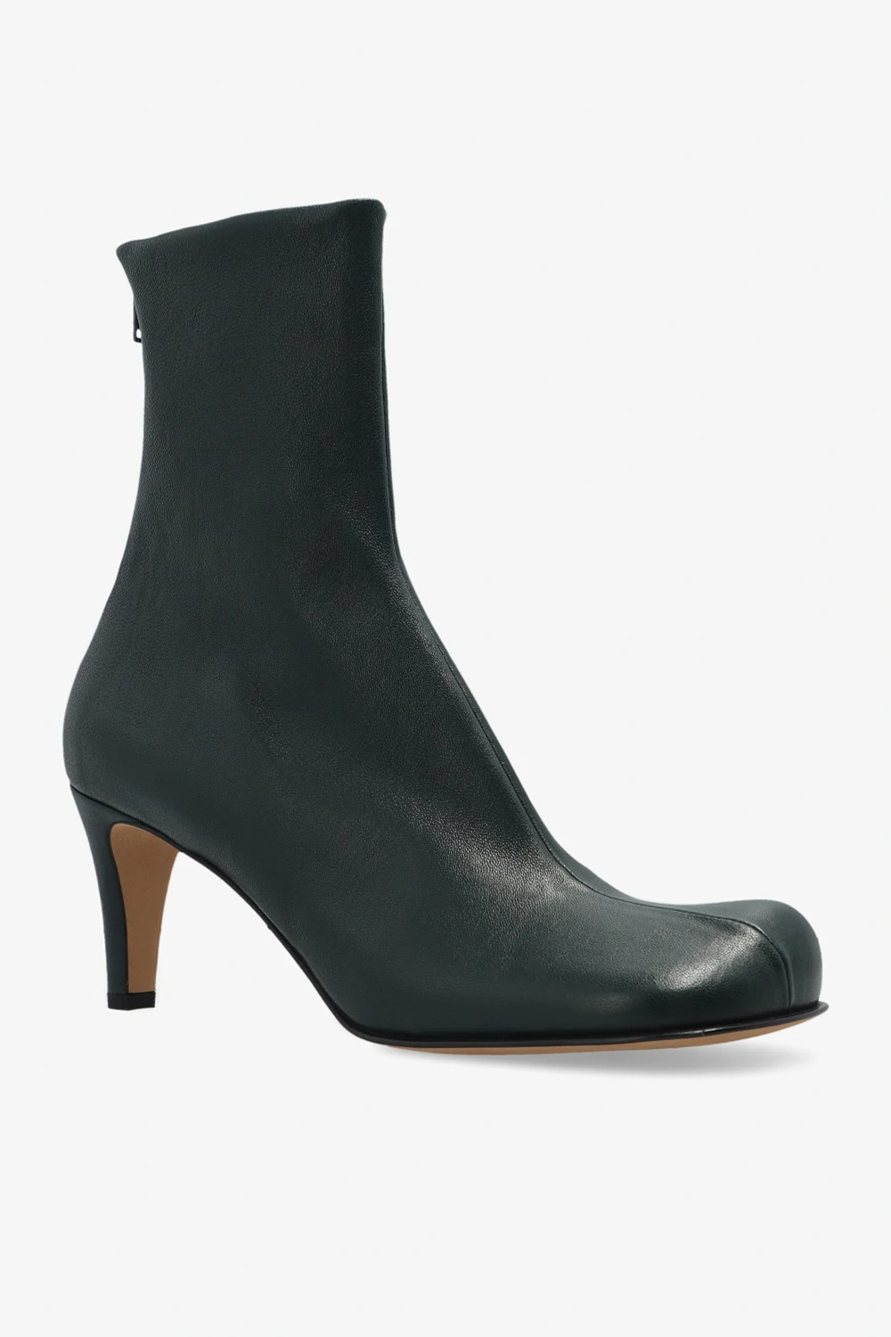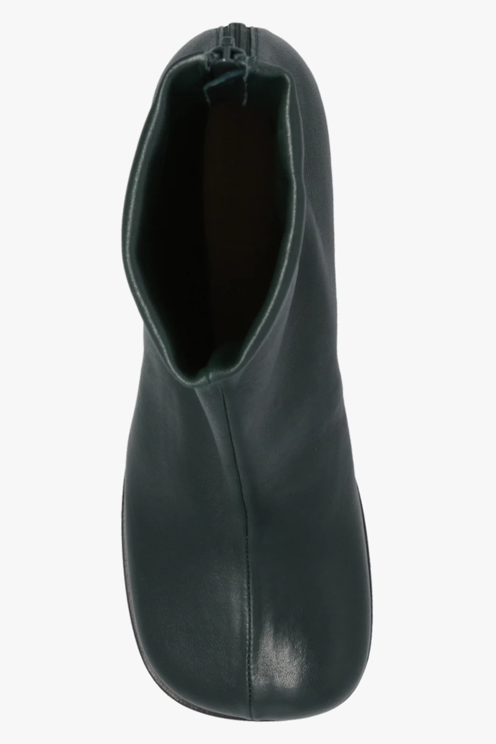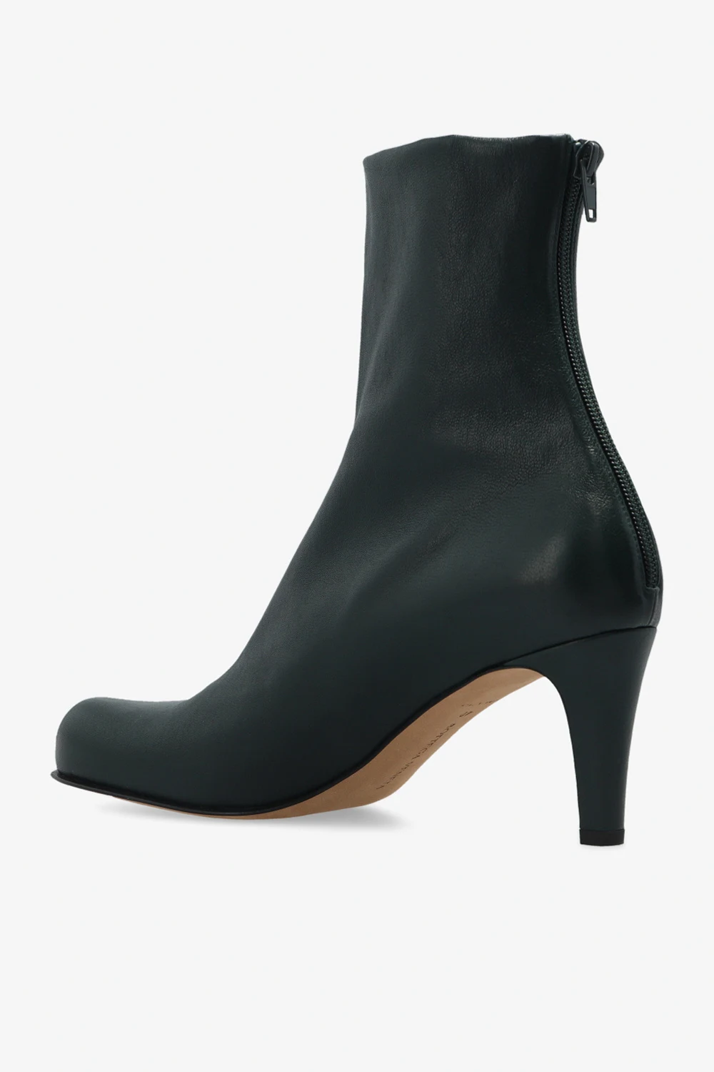 Ciemnozielone botki na obcasie, model ‘Block’ Bottega Veneta. Wykonane z jagnięcej skóry. Z tyłu zapinane na zamek. Kwadratowy nosek o asymetrycznym kształcie. Beżowa, skórzana podeszwa.