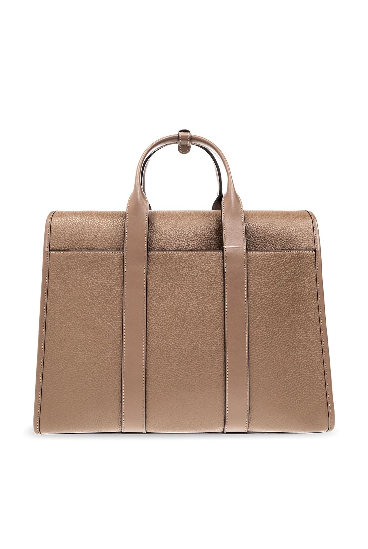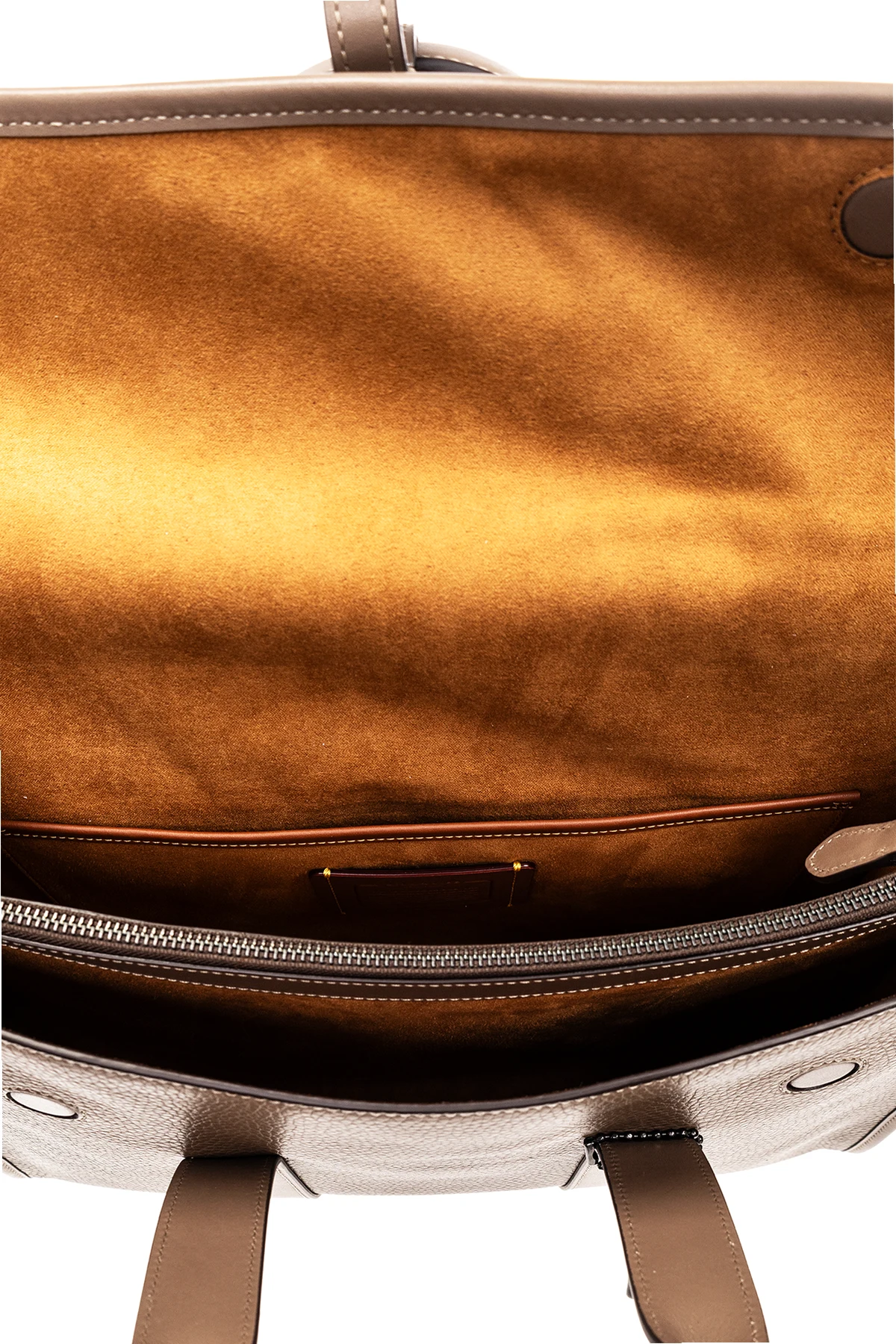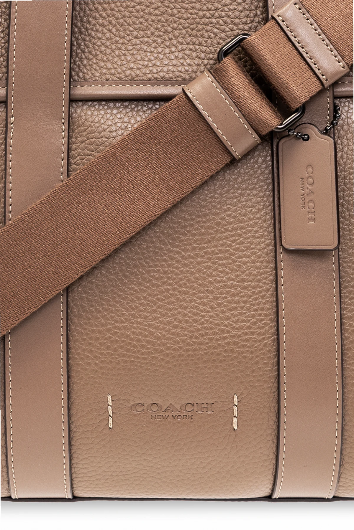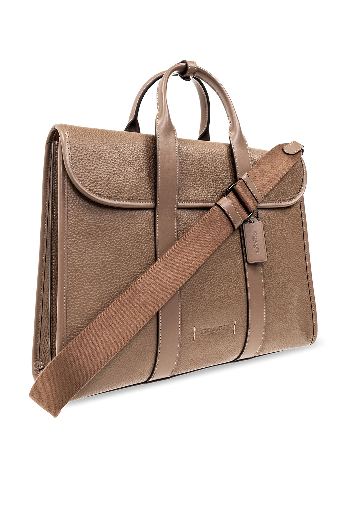 Brązowoszara aktówka, model ‘Gotham Portfolio’ Coach. Wykonana ze skóry o ziarnistej fakturze. Zamykana na magnetyczne zatrzaski. Z przodu wytłoczone logo. Z tyłu kieszeń z magnetycznym zamknięciem. Dołączona charakterystyczna dla marki zawieszka. Dwie półokrągłe rączki oraz odpinany, regulowany pas na ramię. Wewnątrz komora z przegrodą zamykaną na zamek i cztery wsuwane kieszenie. Metalowe wykończenie w kolorze srebrnym.