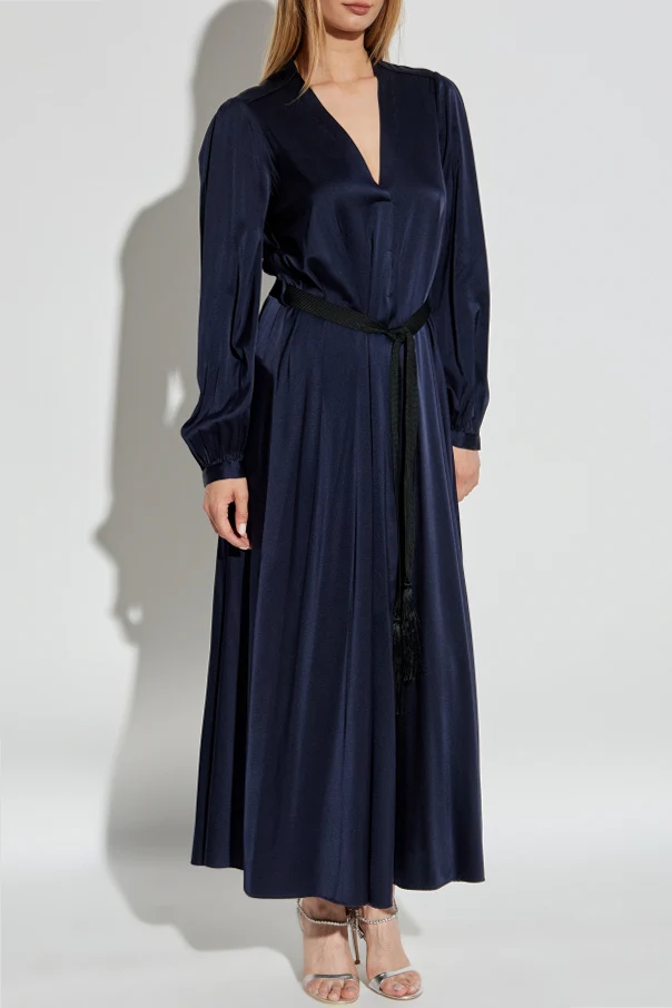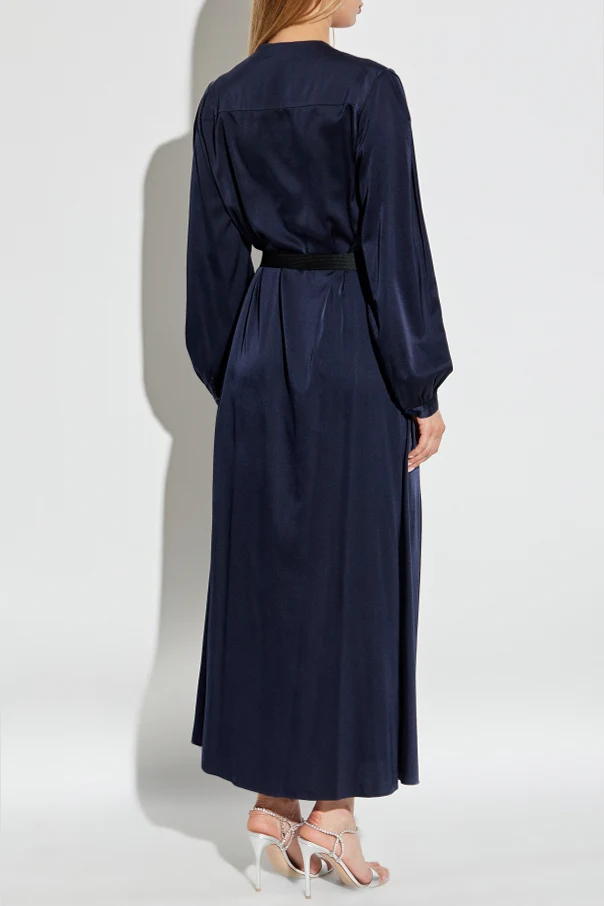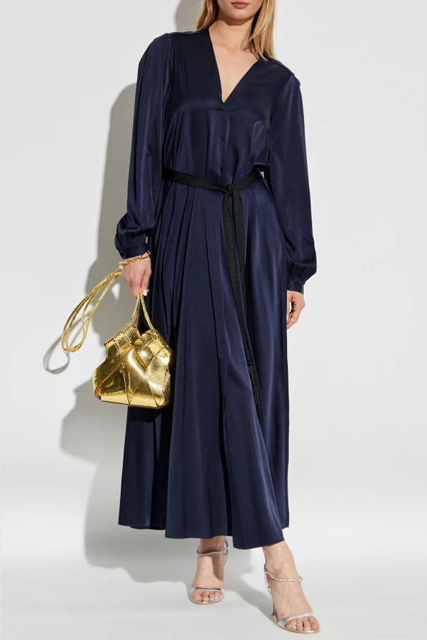 Jedwabna sukienka od forte_forte to kwintesencja zmysłowej elegancji, której magię podkreśla głęboki granat oraz imponująca długość maxi. Lekko rozkloszowany dół dyskretnie akcentuje sylwetkę, zaś głęboki dekolt typu „V” subtelnie wydłuża szyję, nadając stylizacji lekkości.