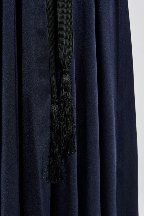 Luksusowy jedwab o satynowym połysku stanowi wyraz szlachetności, a długie, bufiaste rękawy wykończone mankietami i zakładkami dodają całości ponadczasowego uroku. Charakterystycznym detalem jest kontrastowy, czarny pasek z frędzlami przewiązany w talii, który podkreśla linię ciała i stanowi kunsztowną ozdobę.